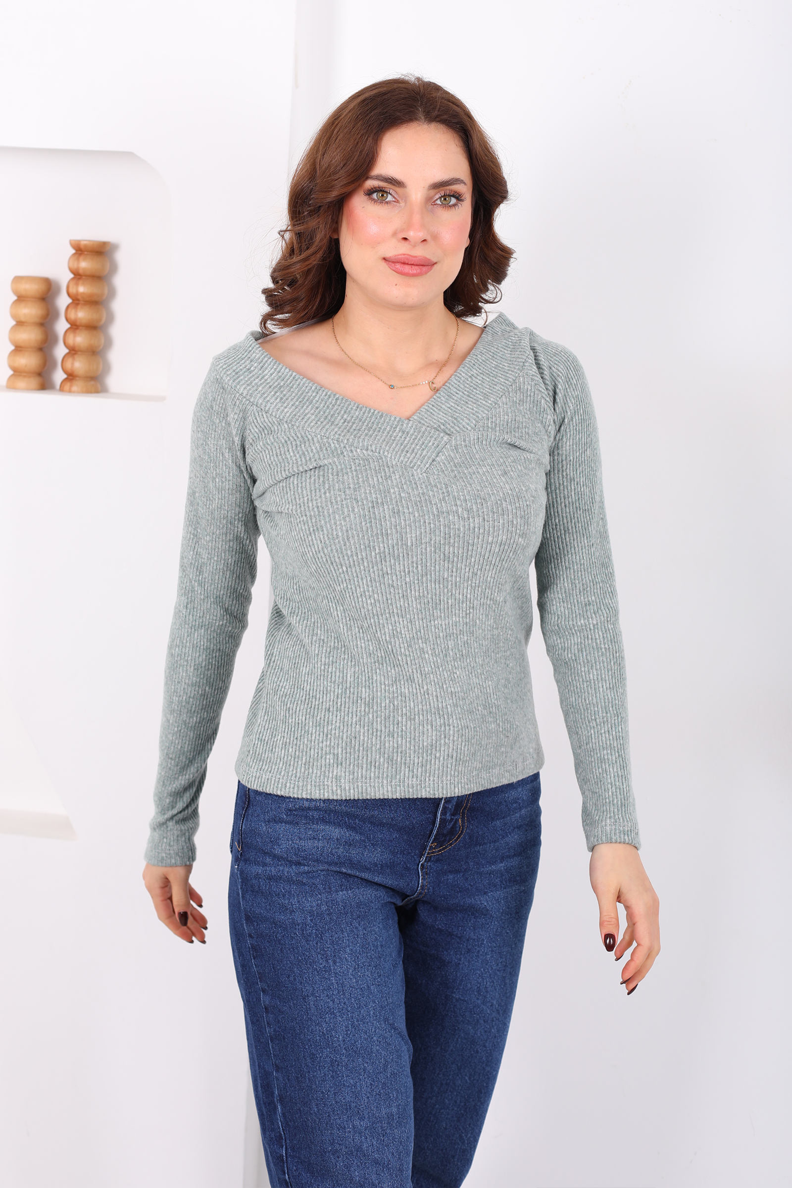 Ön Arka V - Yaka Kadın Haki Triko Kazak