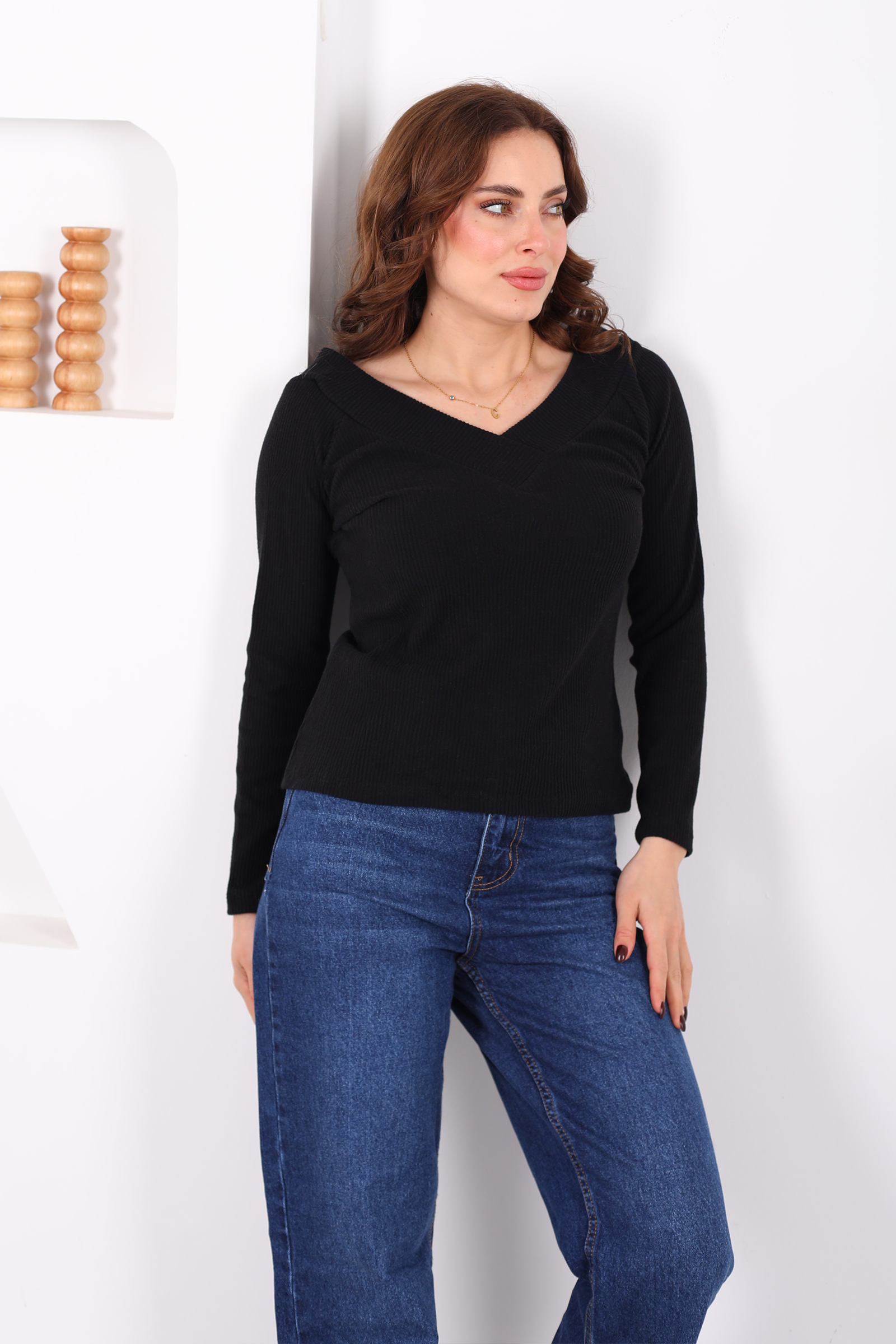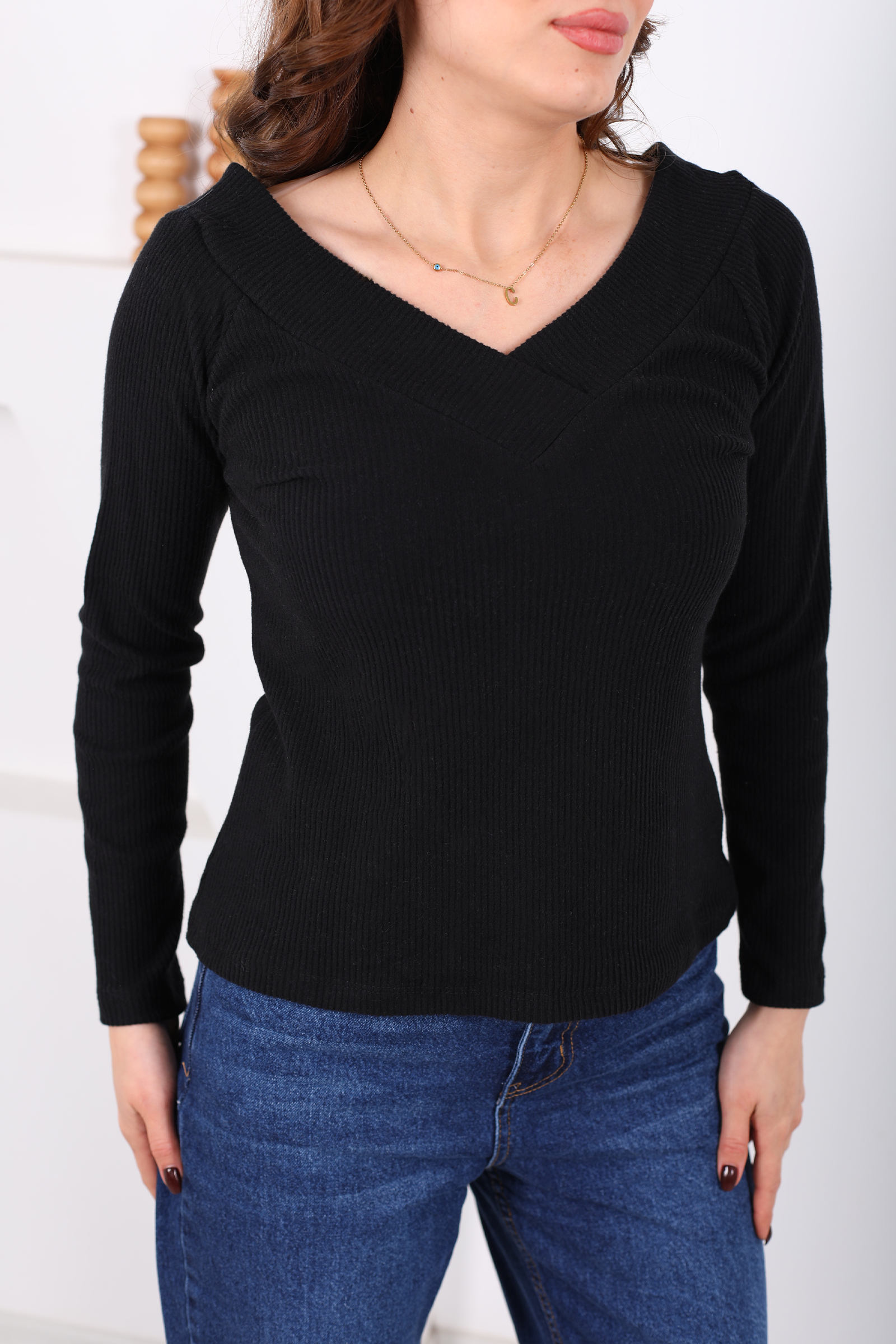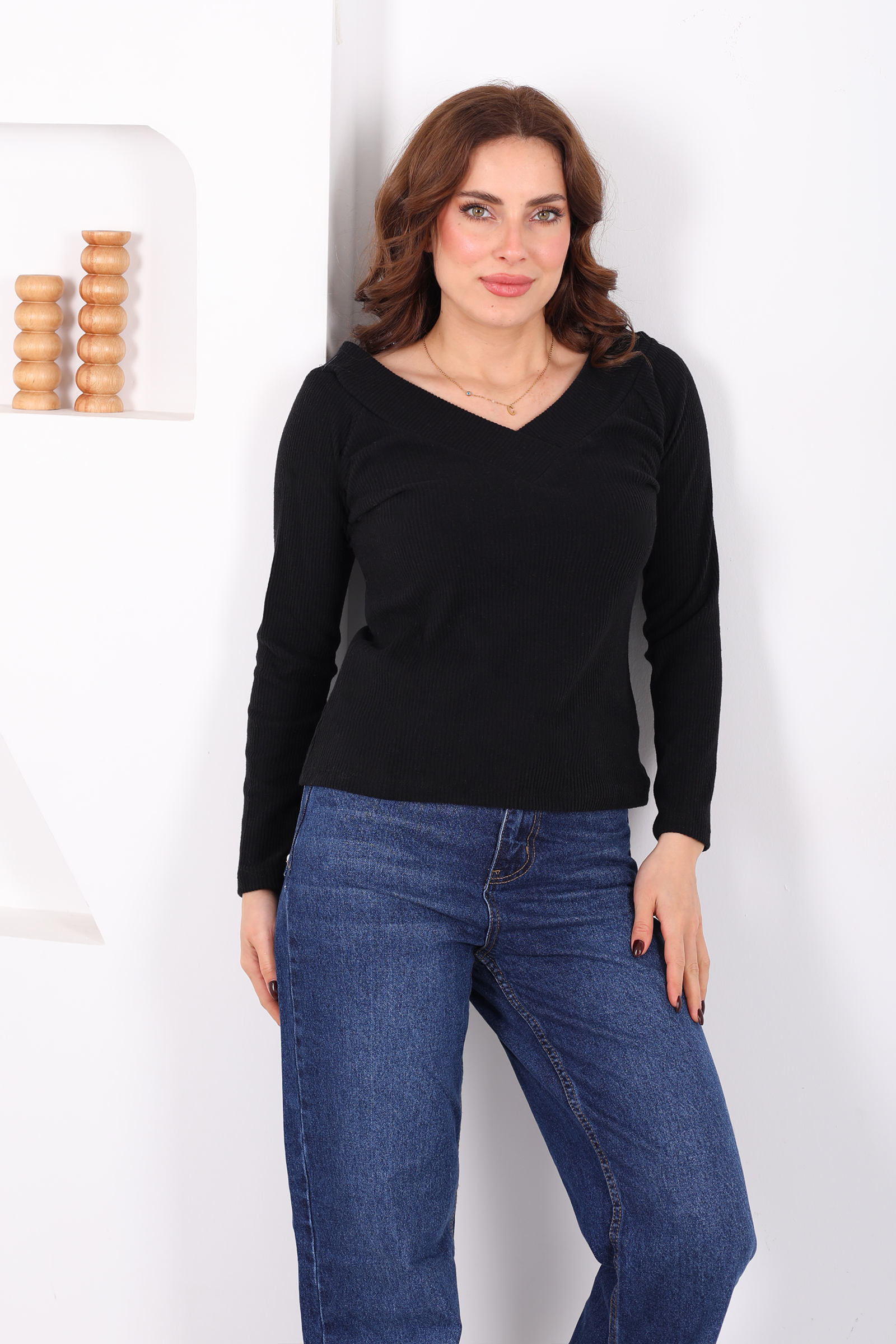 Ön Arka V - Yaka Kadın Siyah Triko Kazak