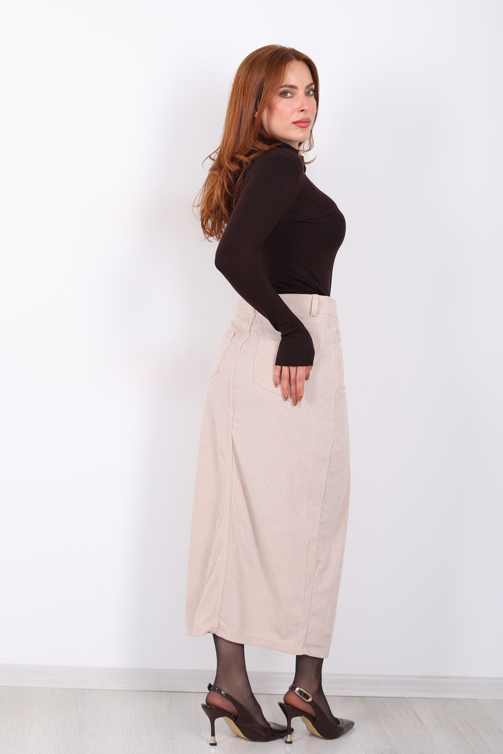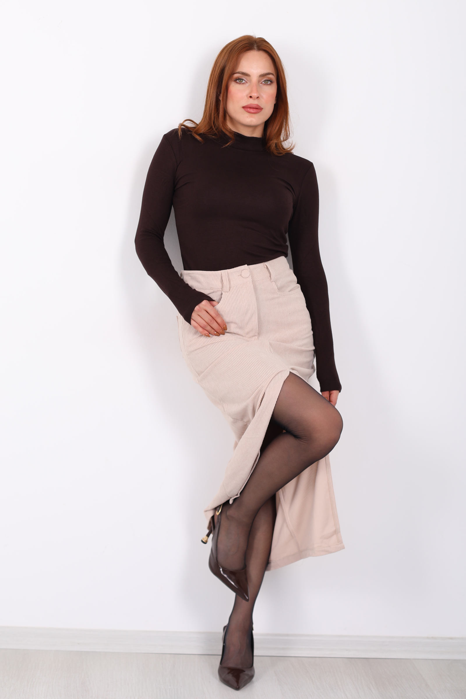 Önden Yırtmaçlı Kadife Taş Rengi Kadın Midi Etek