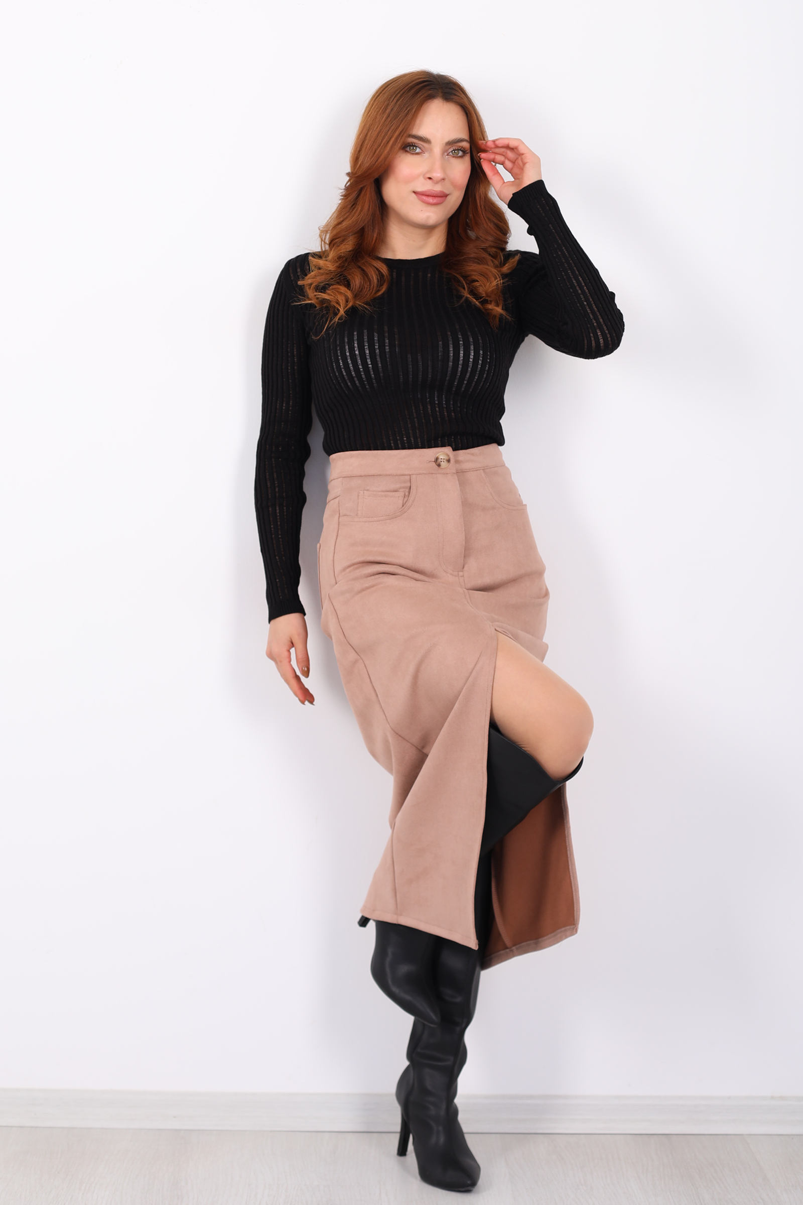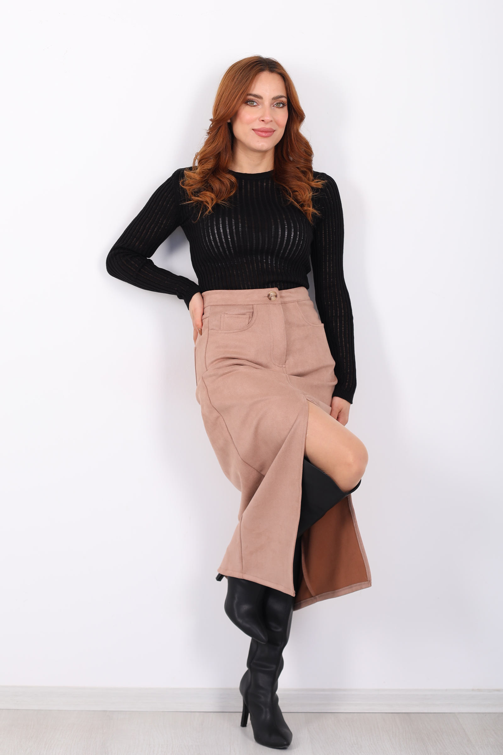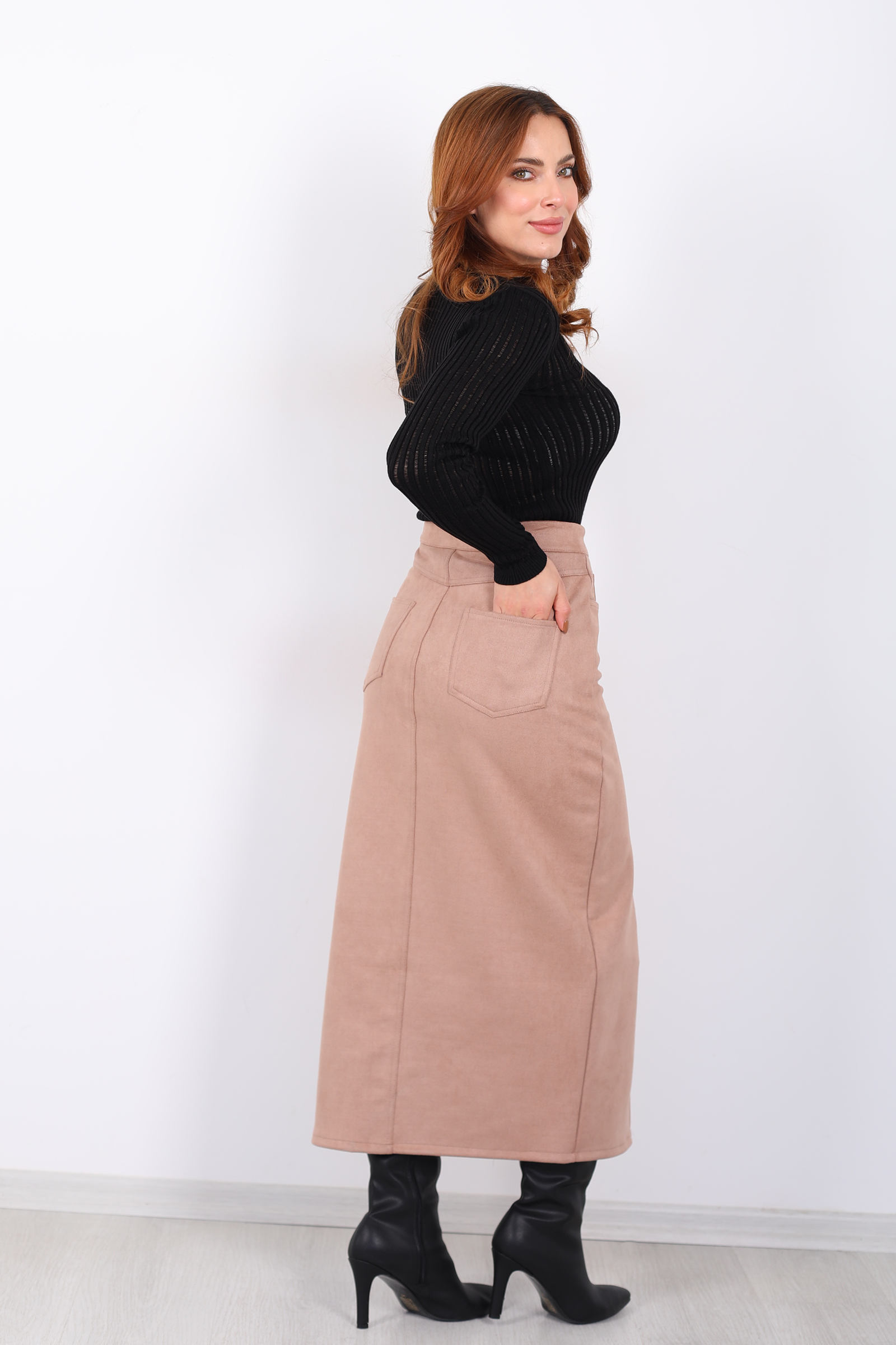 Önden Yırtmaçlı Süet Bej Kadın Midi Etek