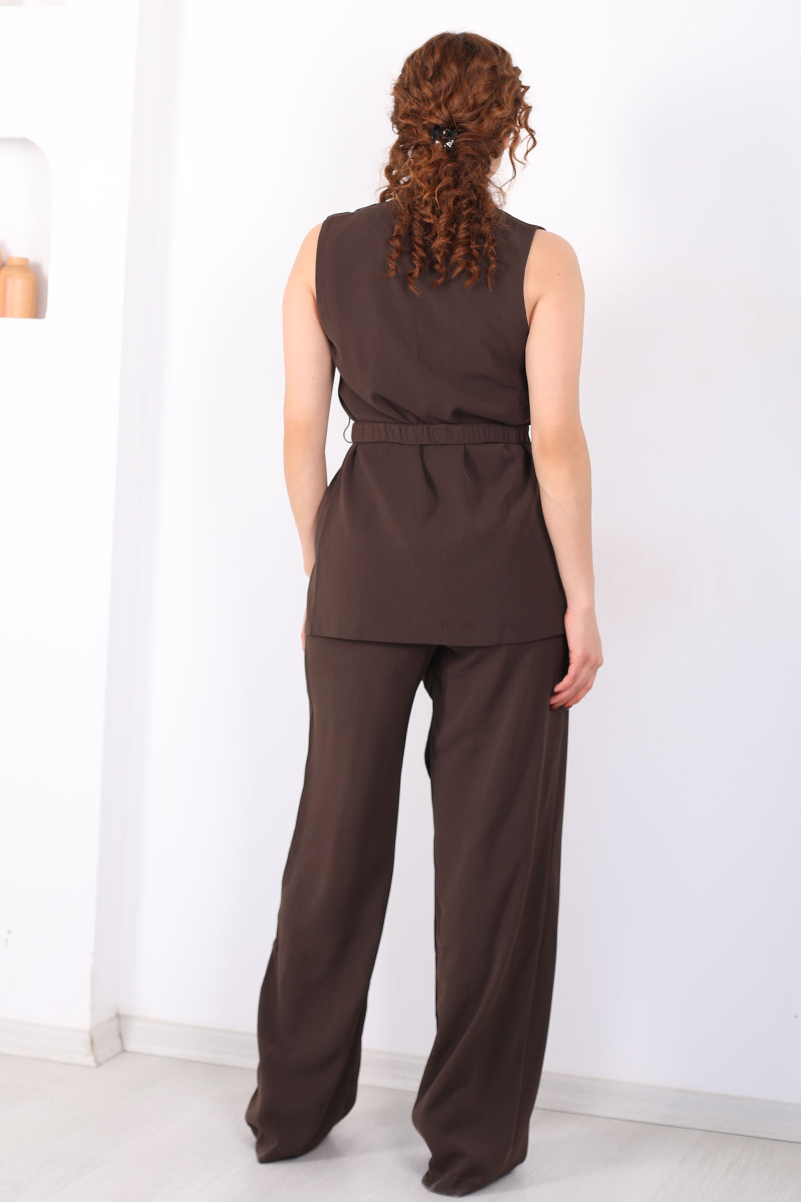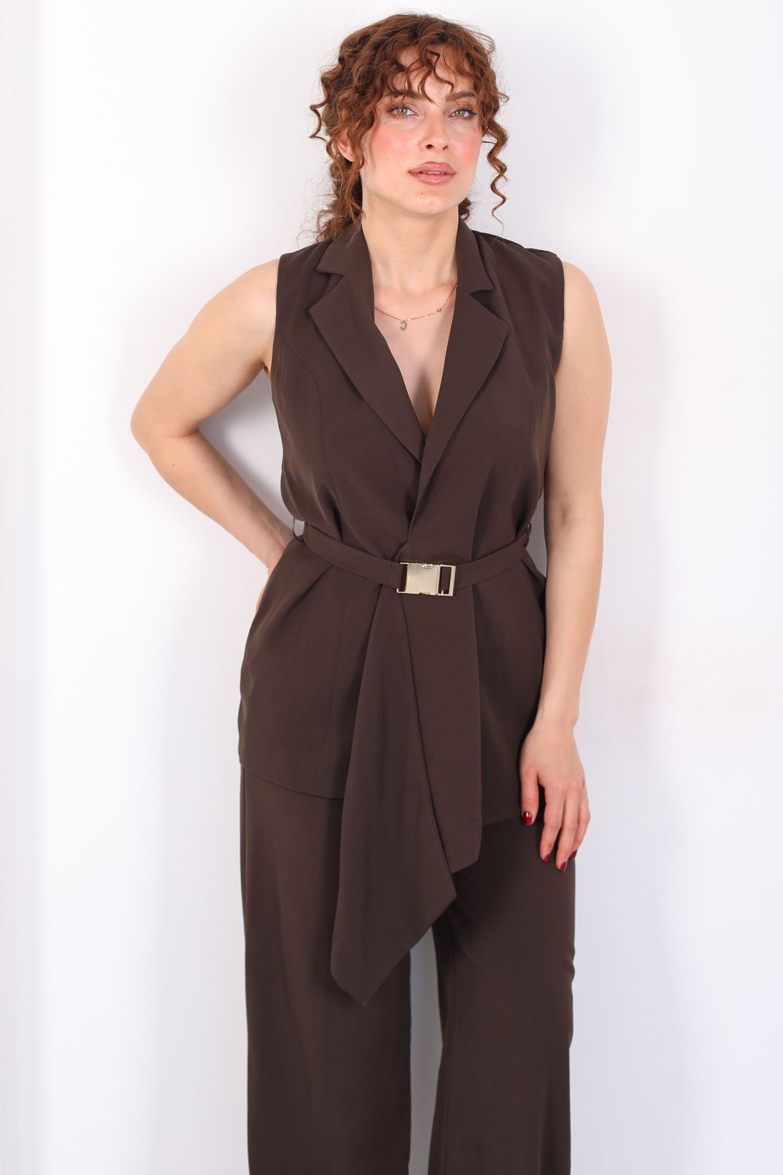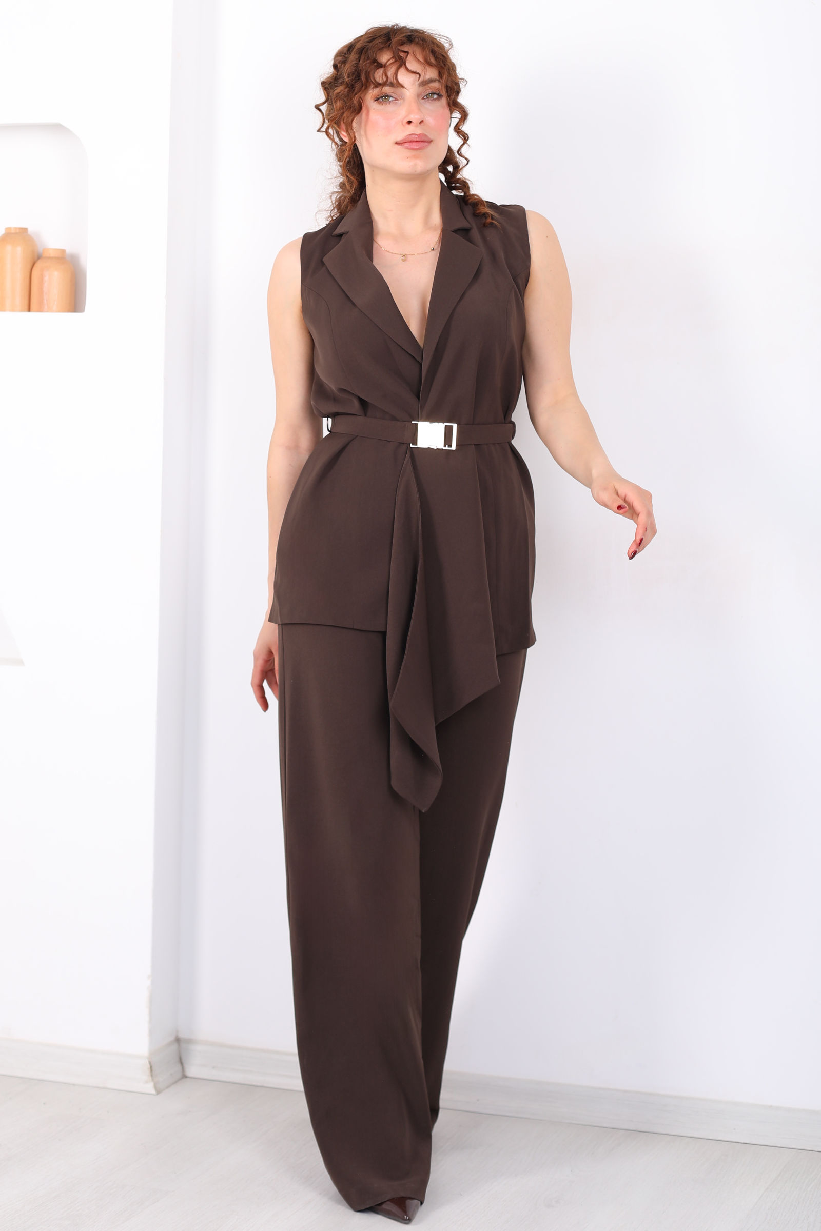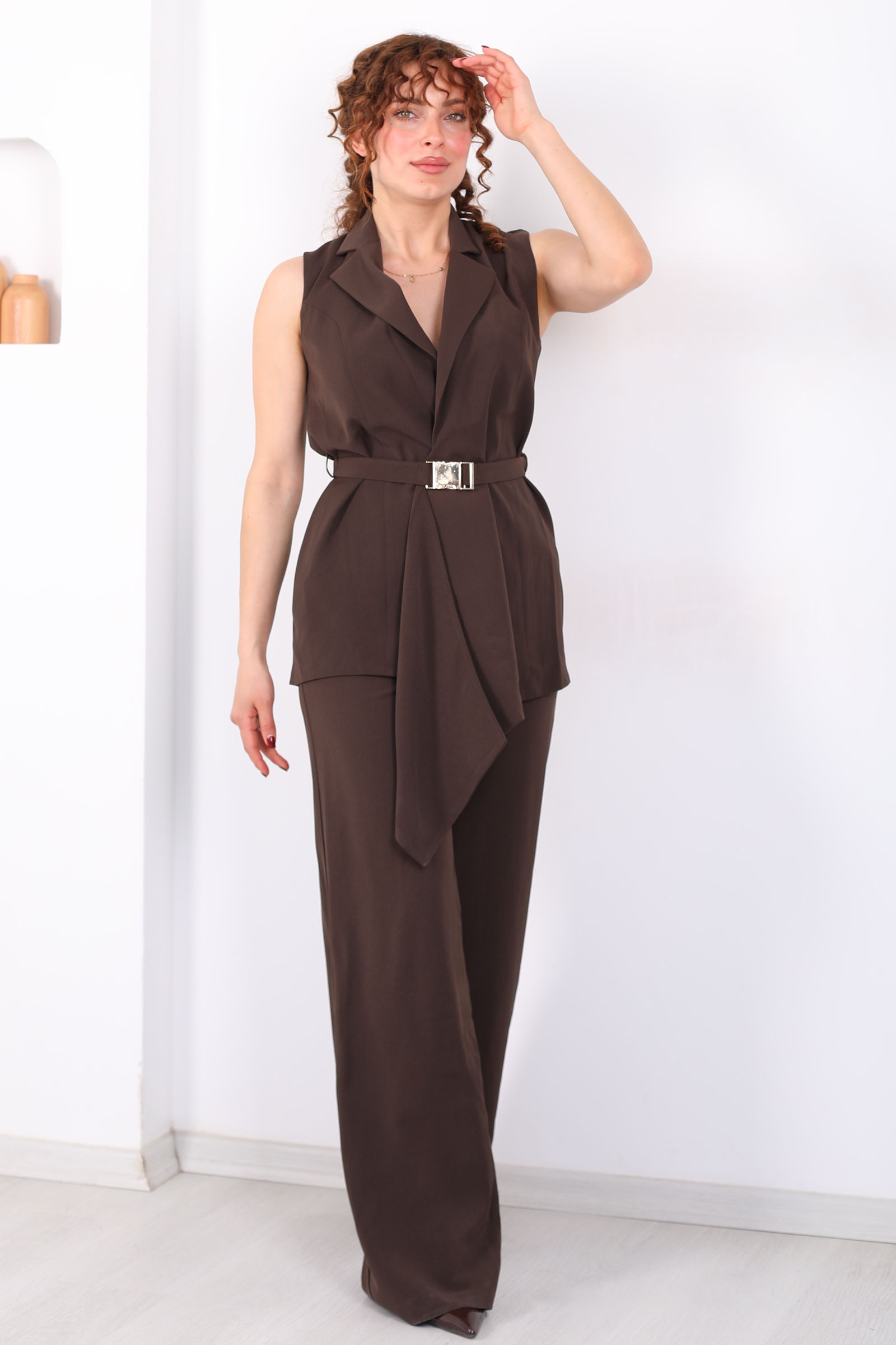 Önü Asimetrik Kemerli Acı Kahve Kadın Yelek Takım