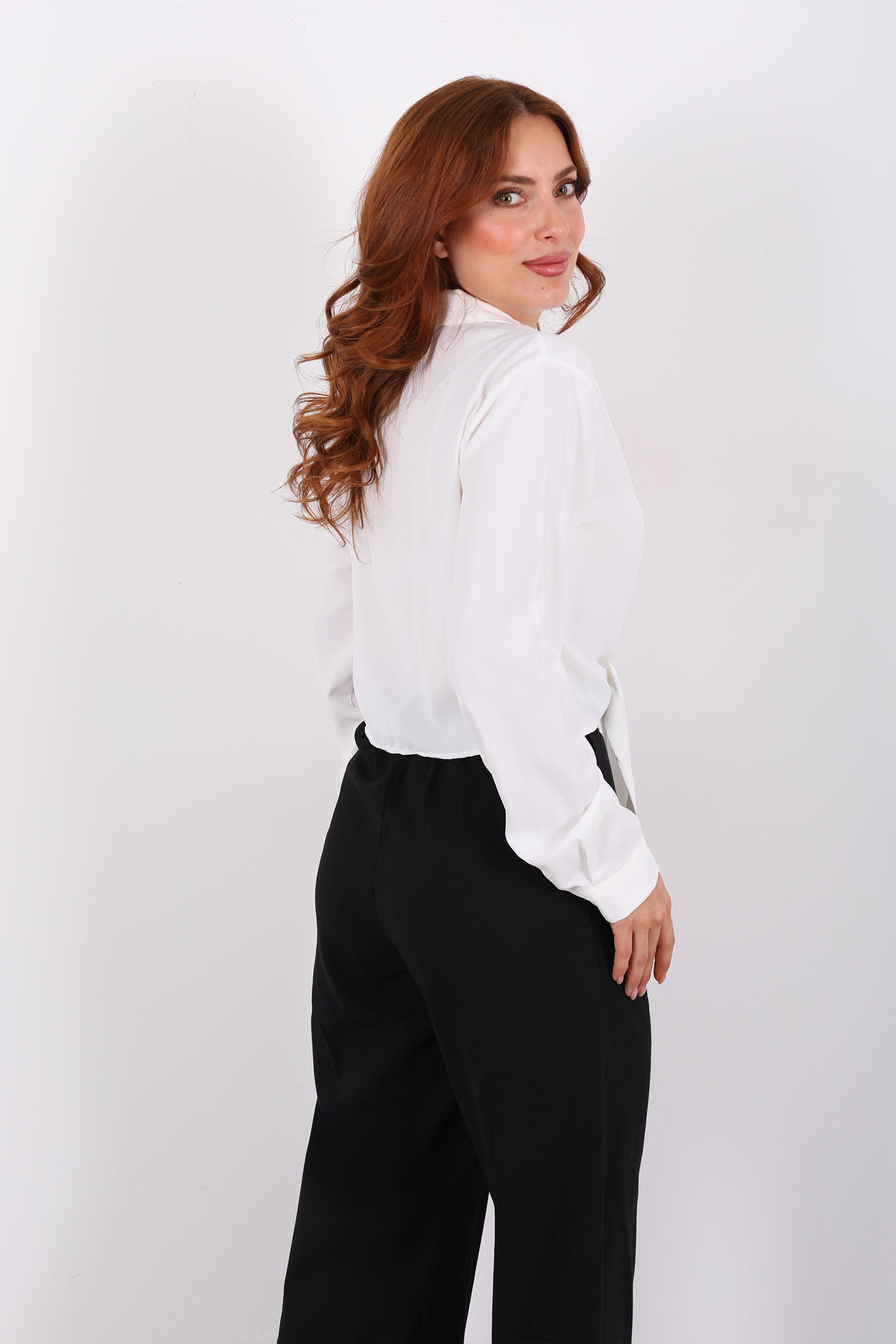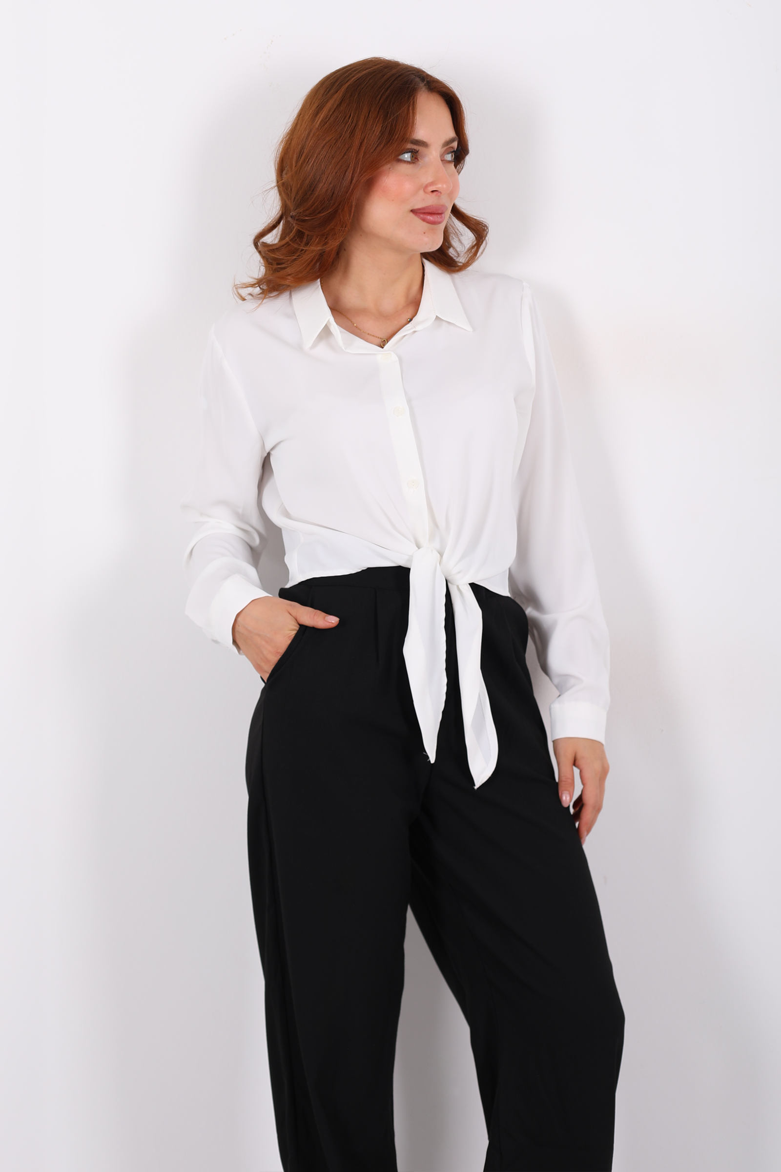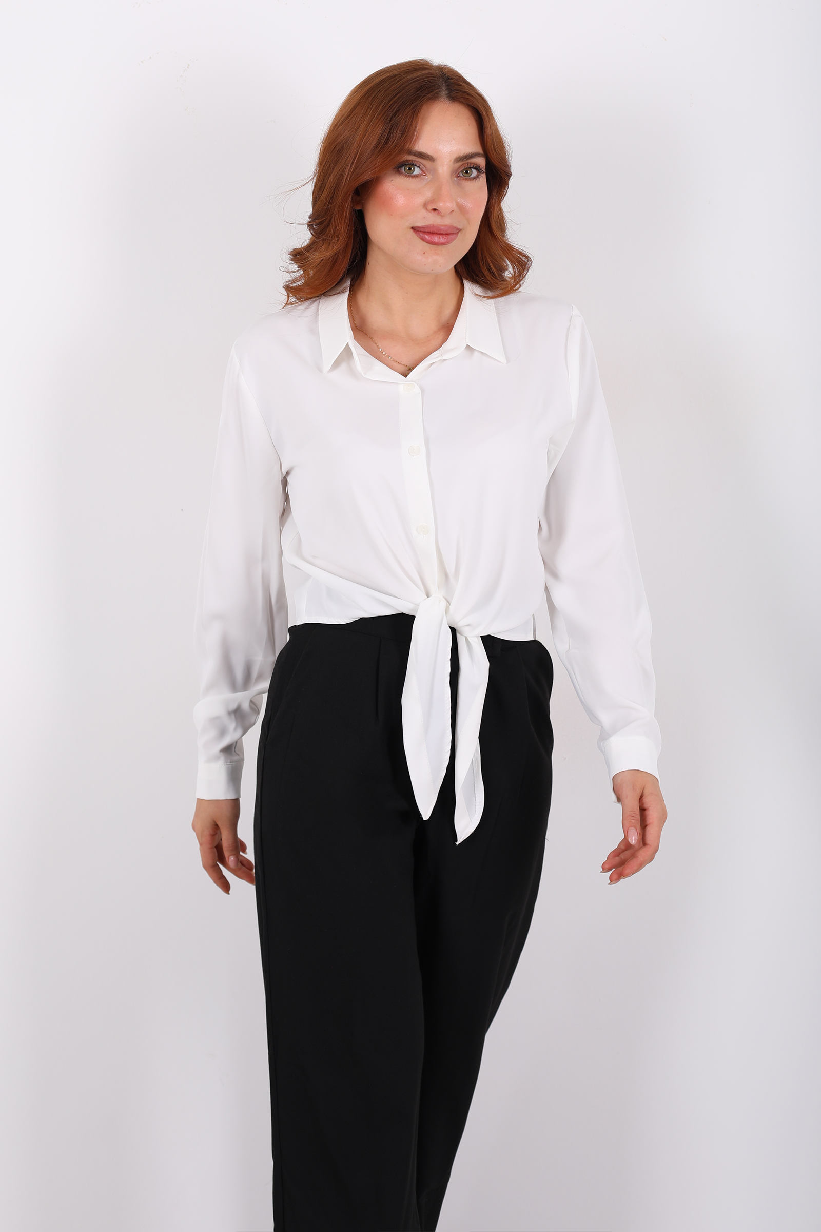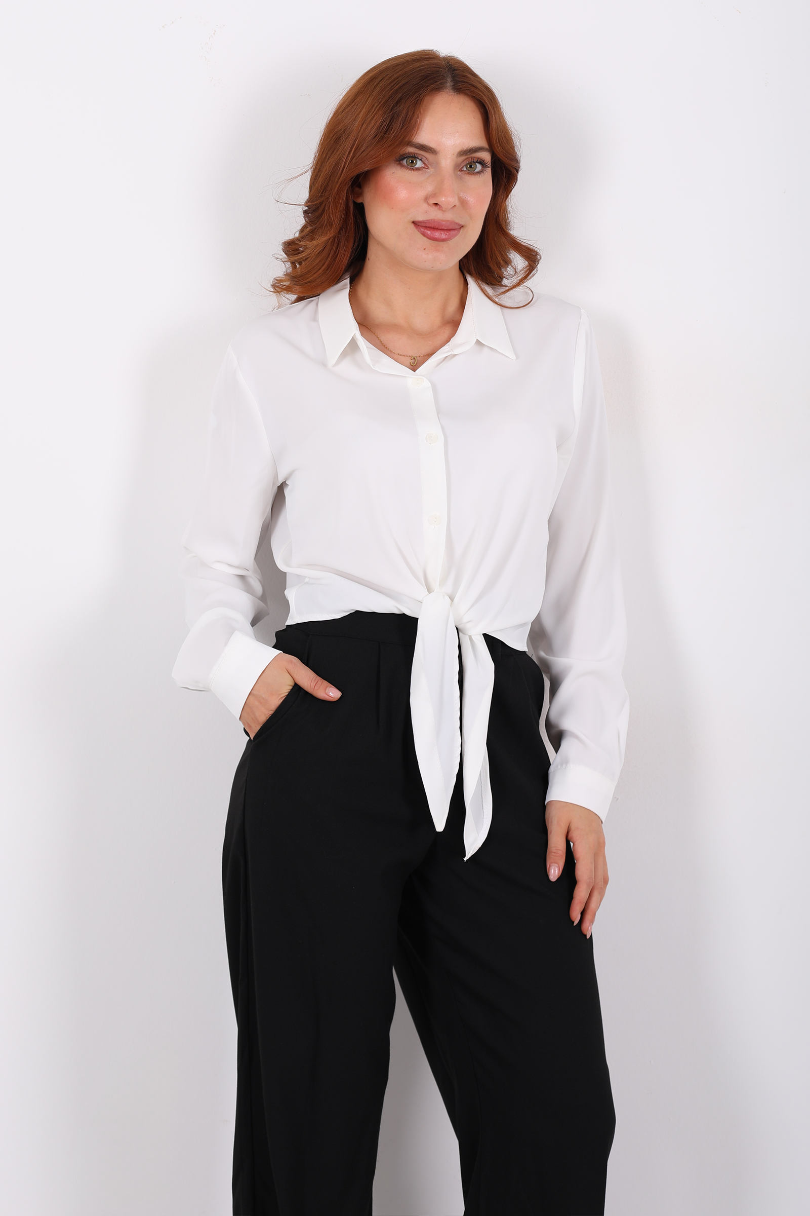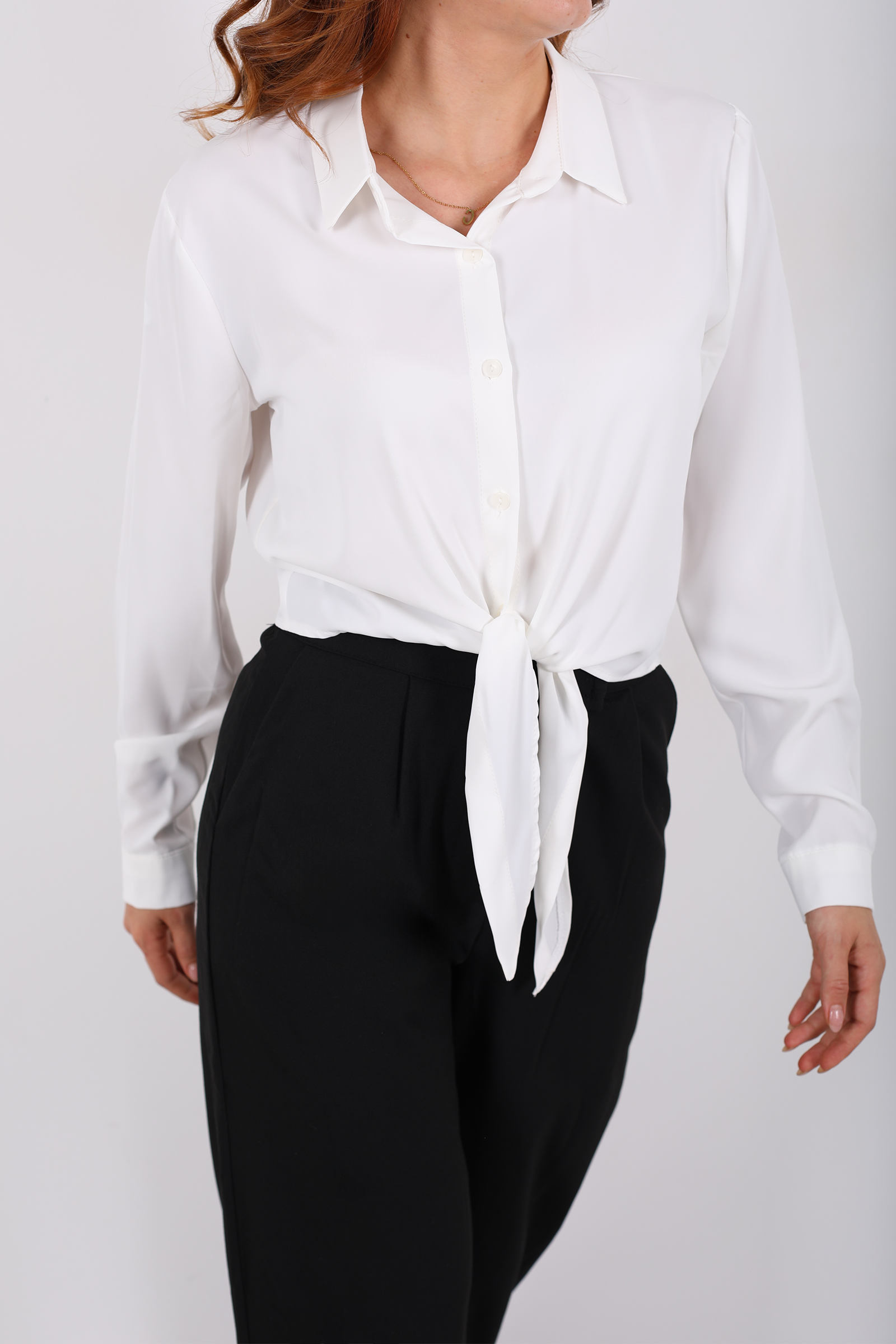 Saf beyazın zarafetiyle ışıldayan bu saten gömlek, klasik şıklığı modern bir dokunuşla birleştiriyor. Ön kısmındaki bağlamalı detay, isteğe göre sıkı veya hafif bağlanarak kişiselleştirilebilir bir siluet sunar; göğüs hattında nazik bir büzgü oluşturarak hem feminen hem de sofistike bir görünüm kazandırır. Düğmeler ise fonksiyonel olmanın ötesinde, gömleğe ritim ve görsel bir estetik katar.