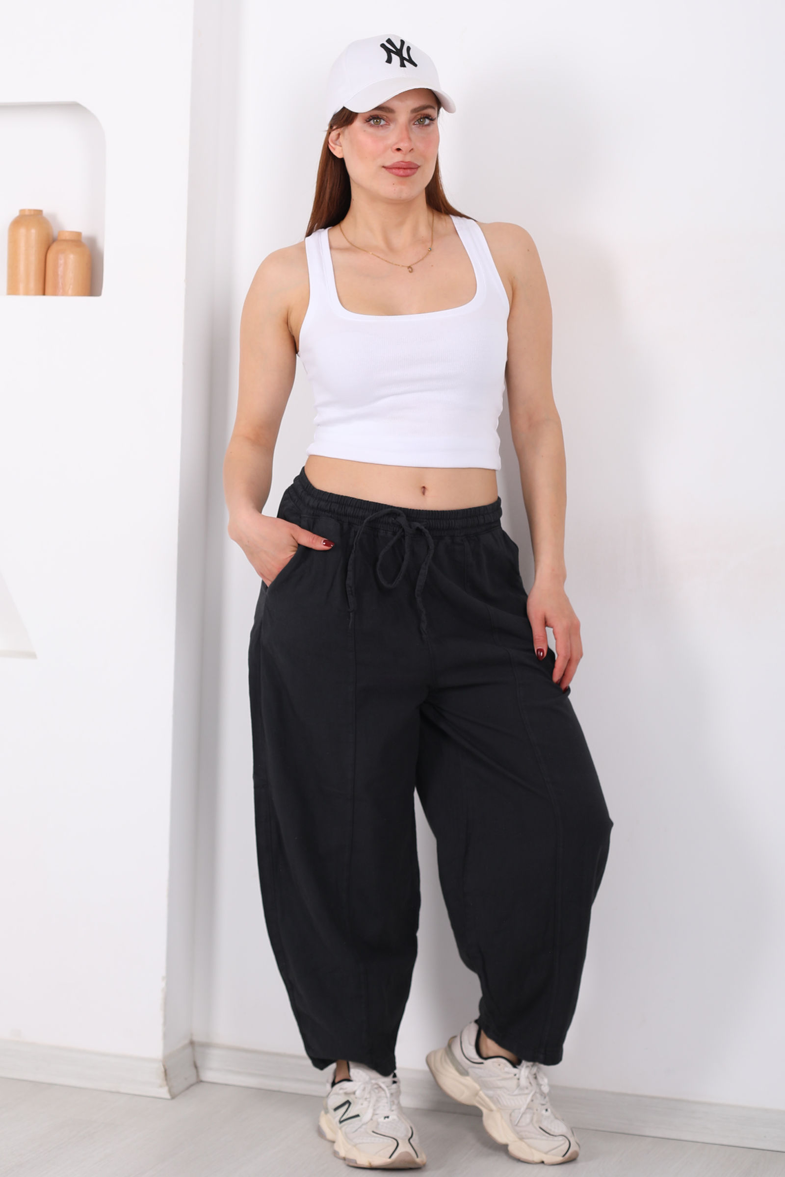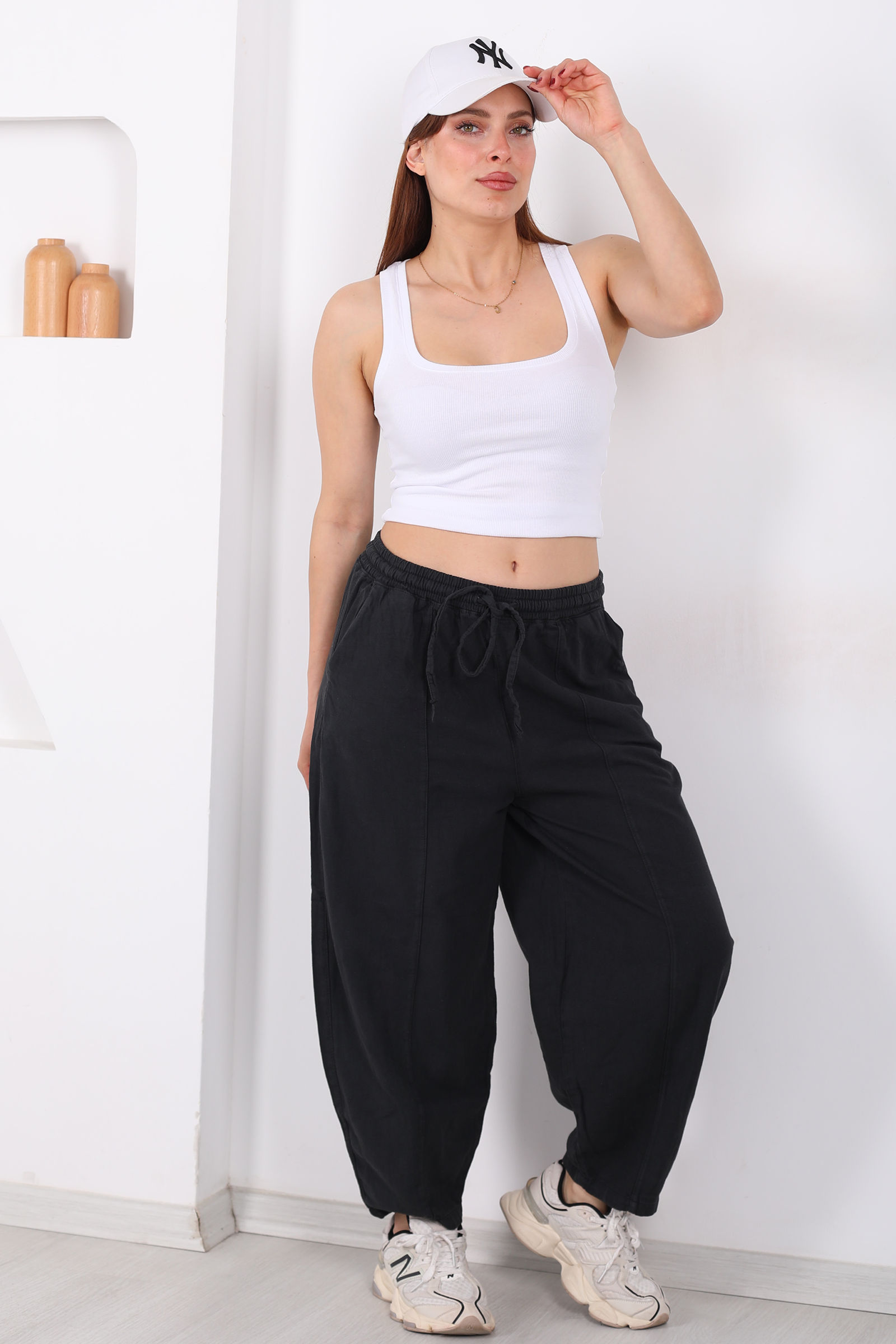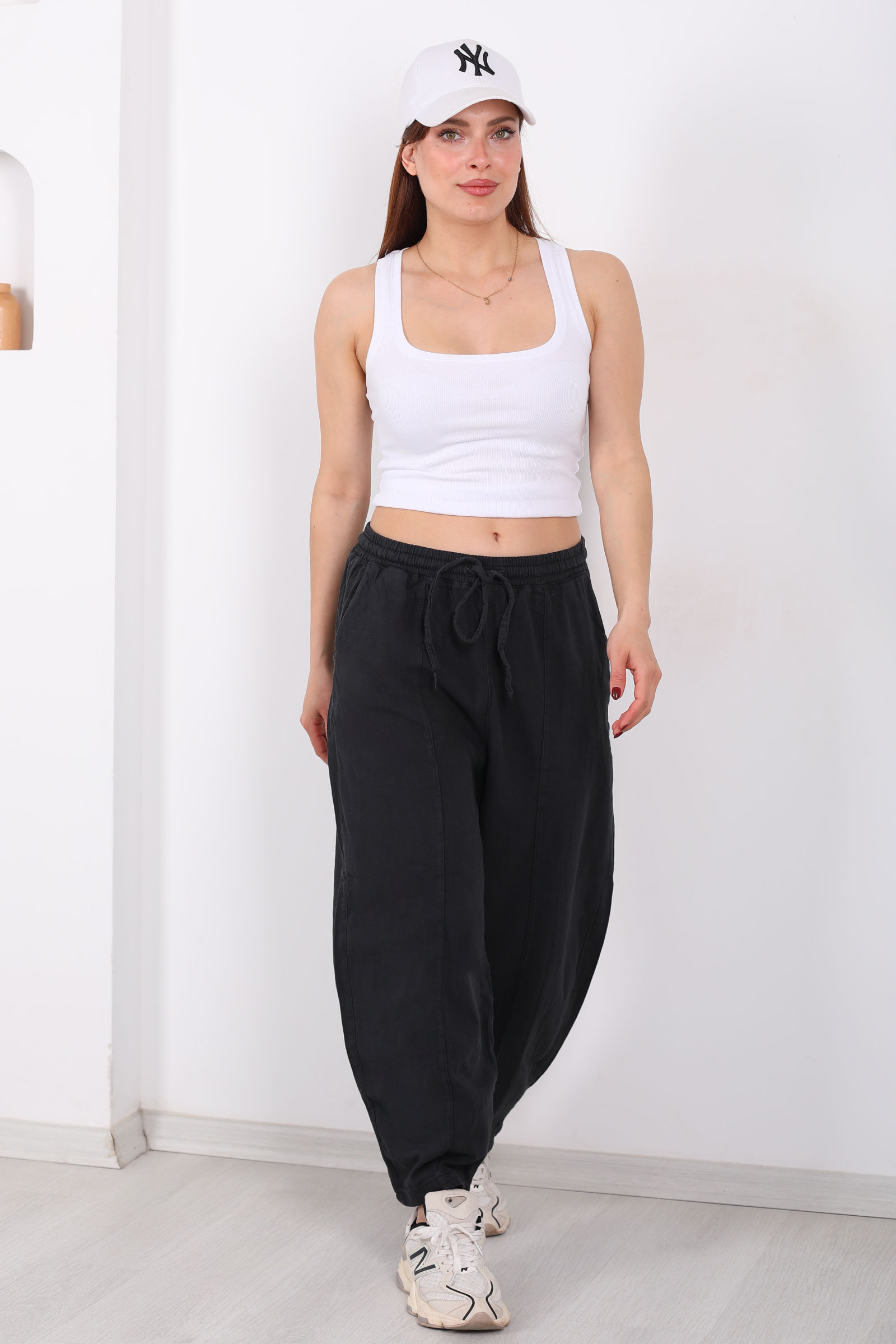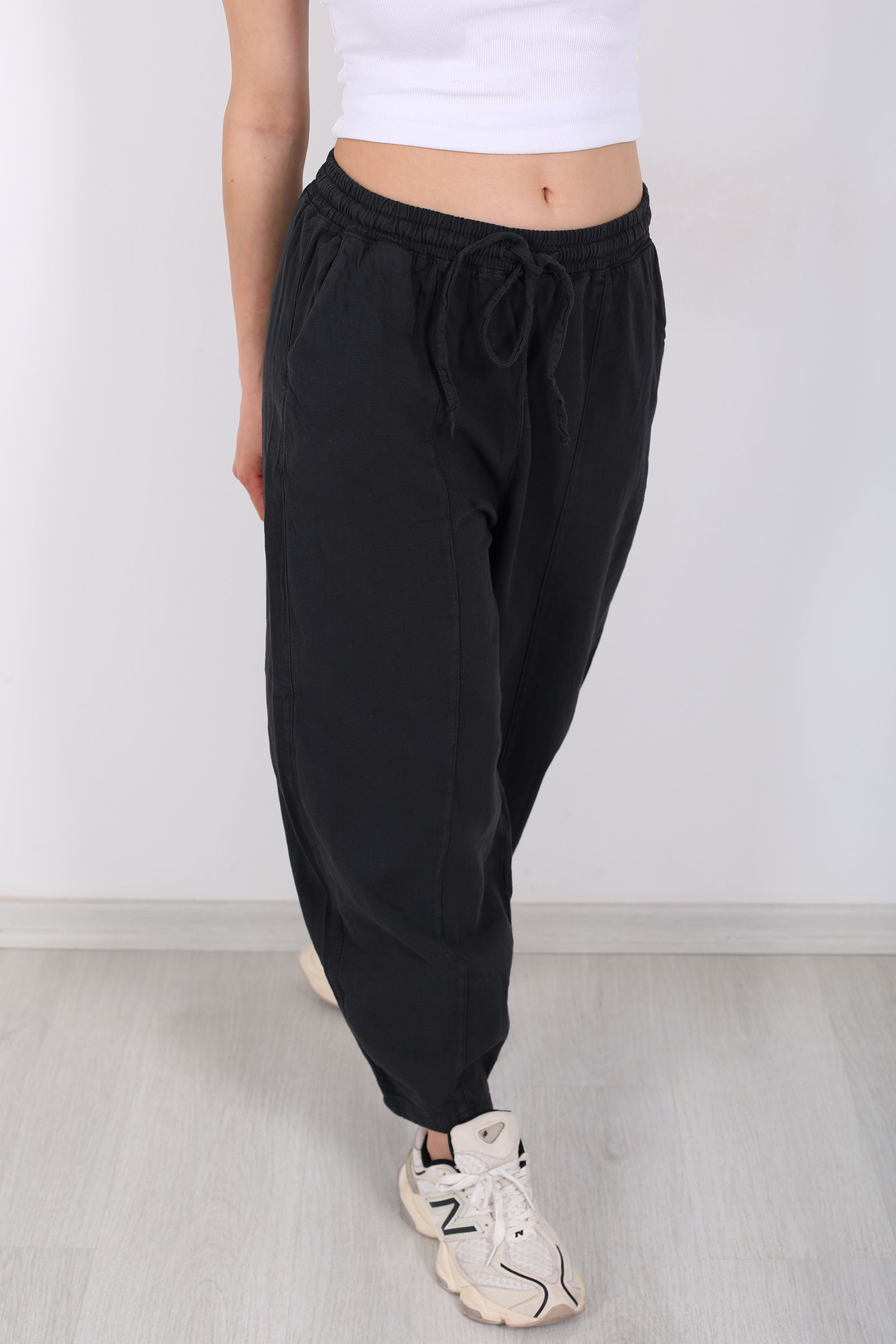 Füme rengin sofistike ve dingin havasını taşıyan bu keten şalvar pantolon, hem şehir stilinde hem de rahat hafta sonu kombinlerinde öne çıkıyor. Keten kumaşın hafif ve nefes alan dokusu, gün boyu ferahlık ve konfor sağlar. Şalvar kesimi, adımlarınıza özgürlük verirken, önü çimalli tasarım pantolona ince bir hacim kazandırır.