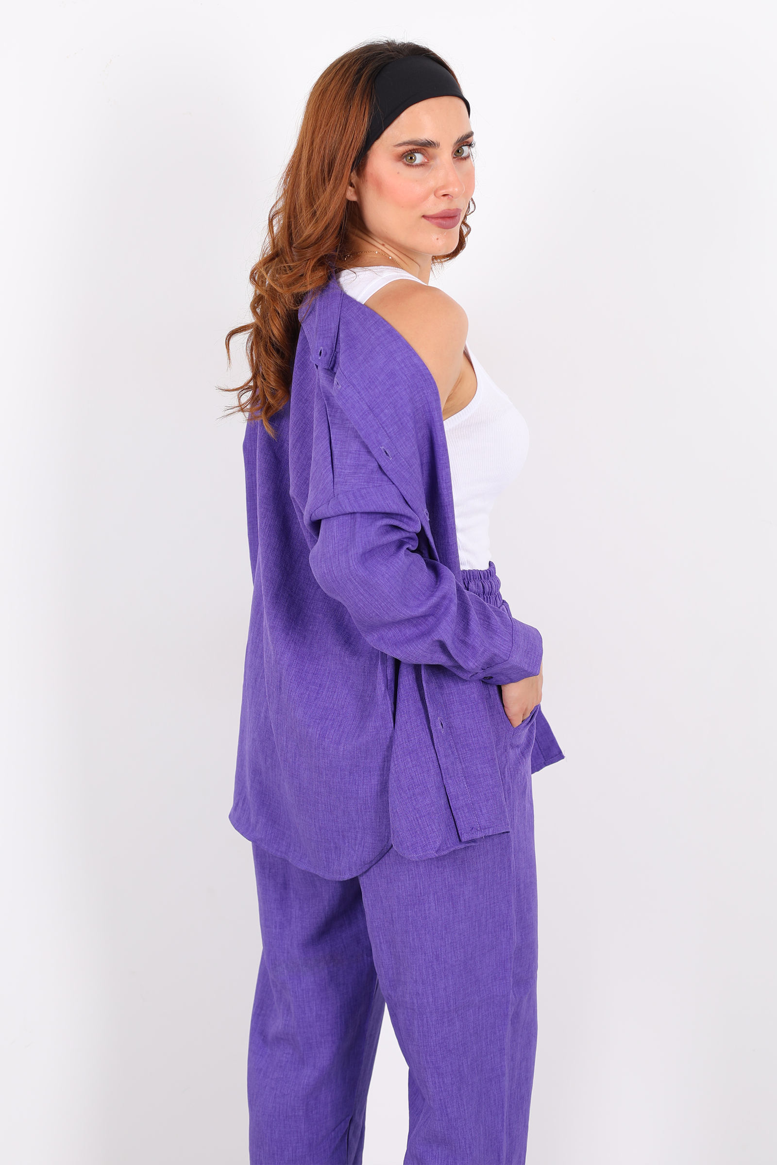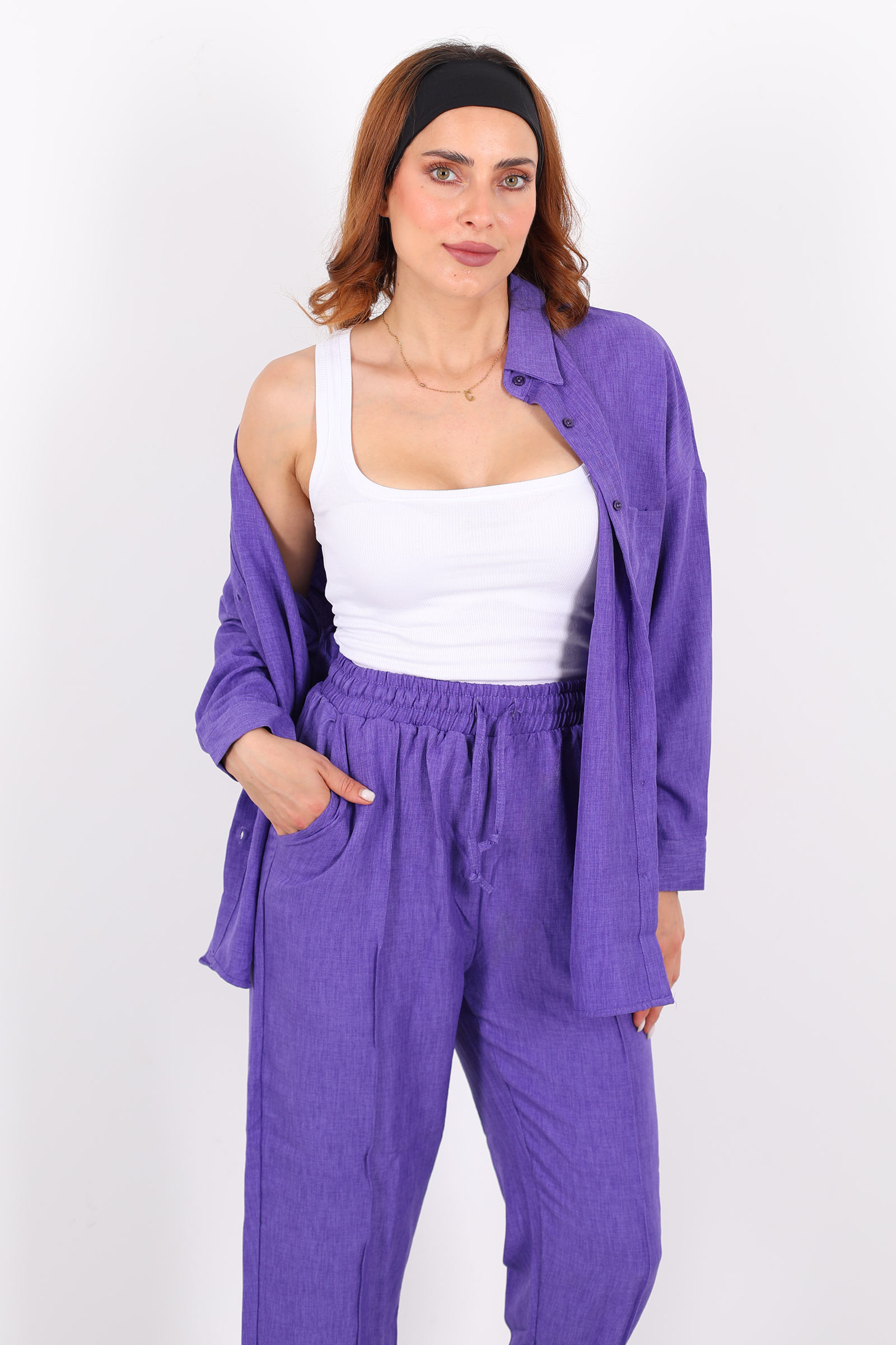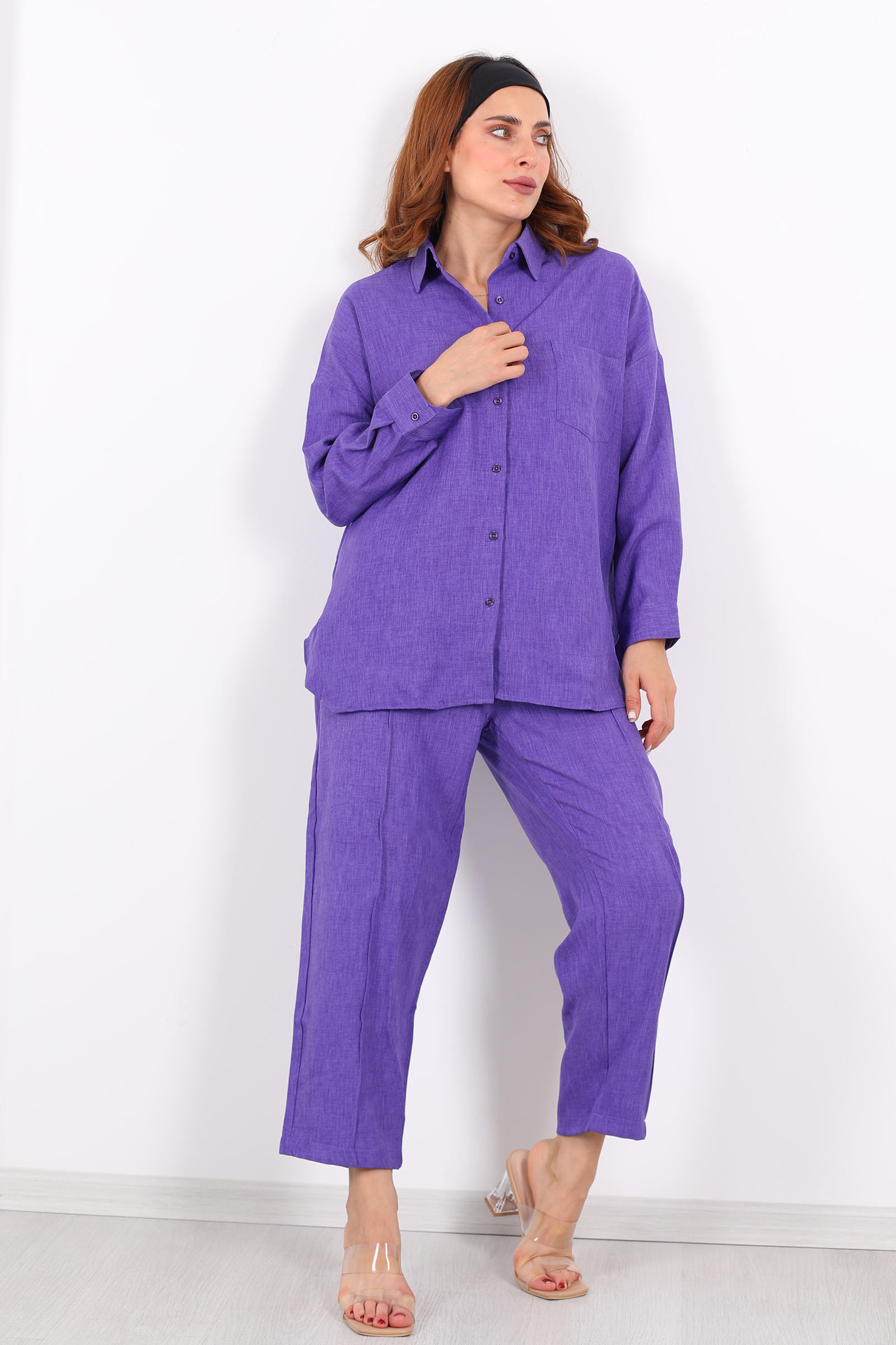Önü Çimalı Keten Eflatun Kadın Gömlek Takım