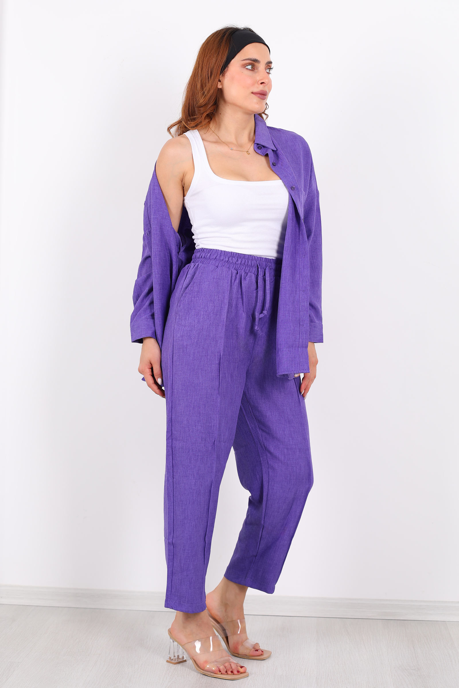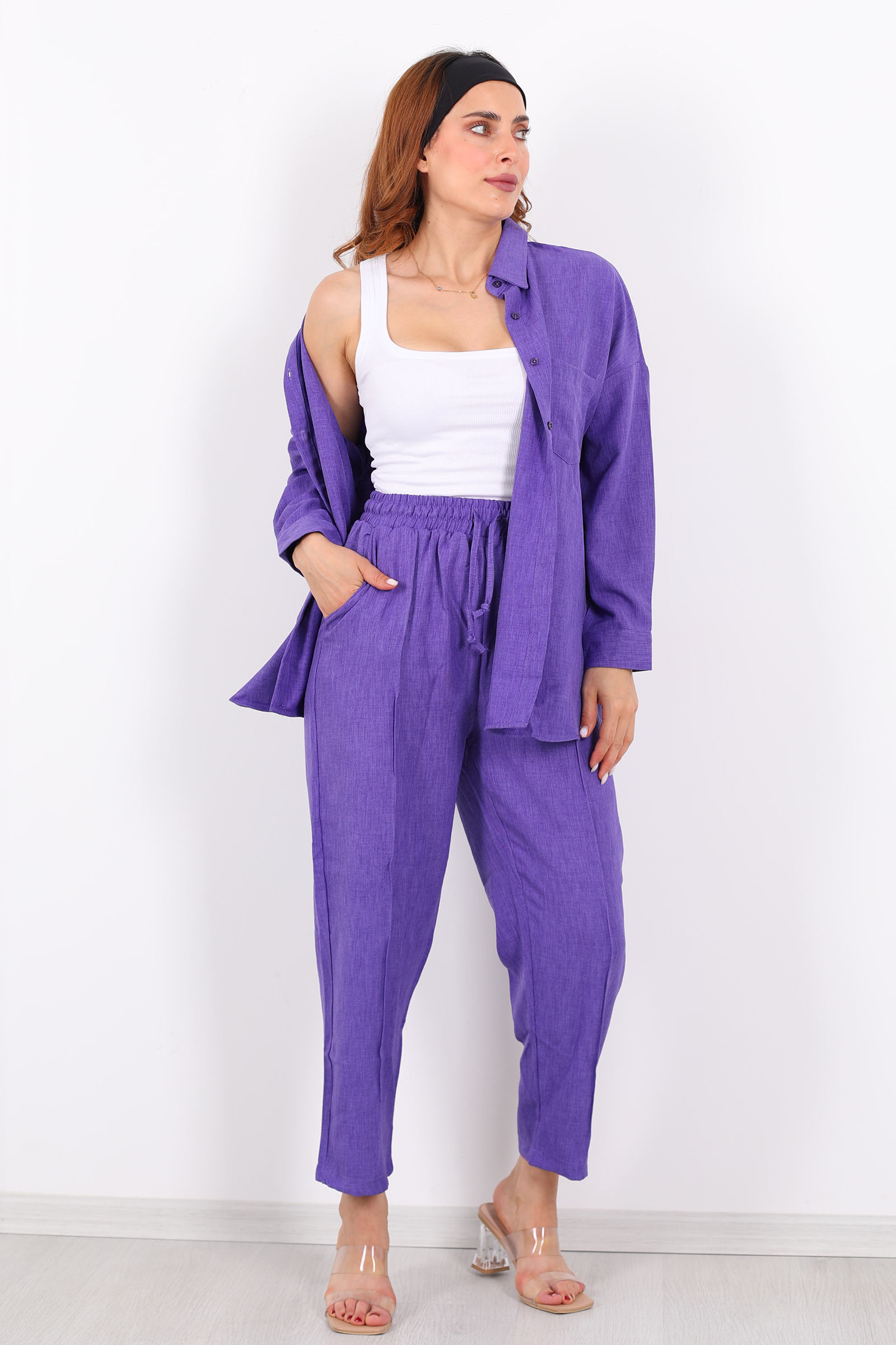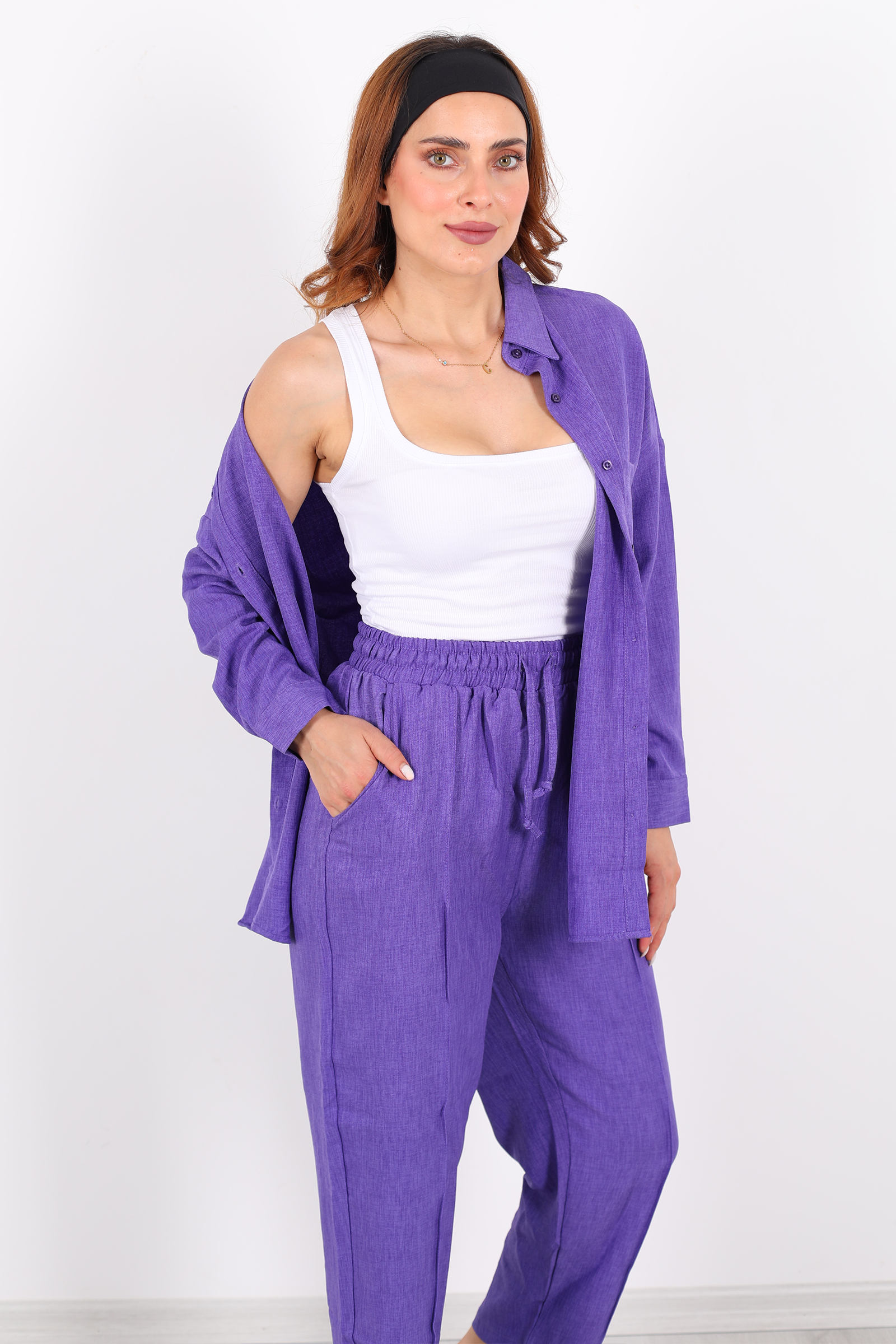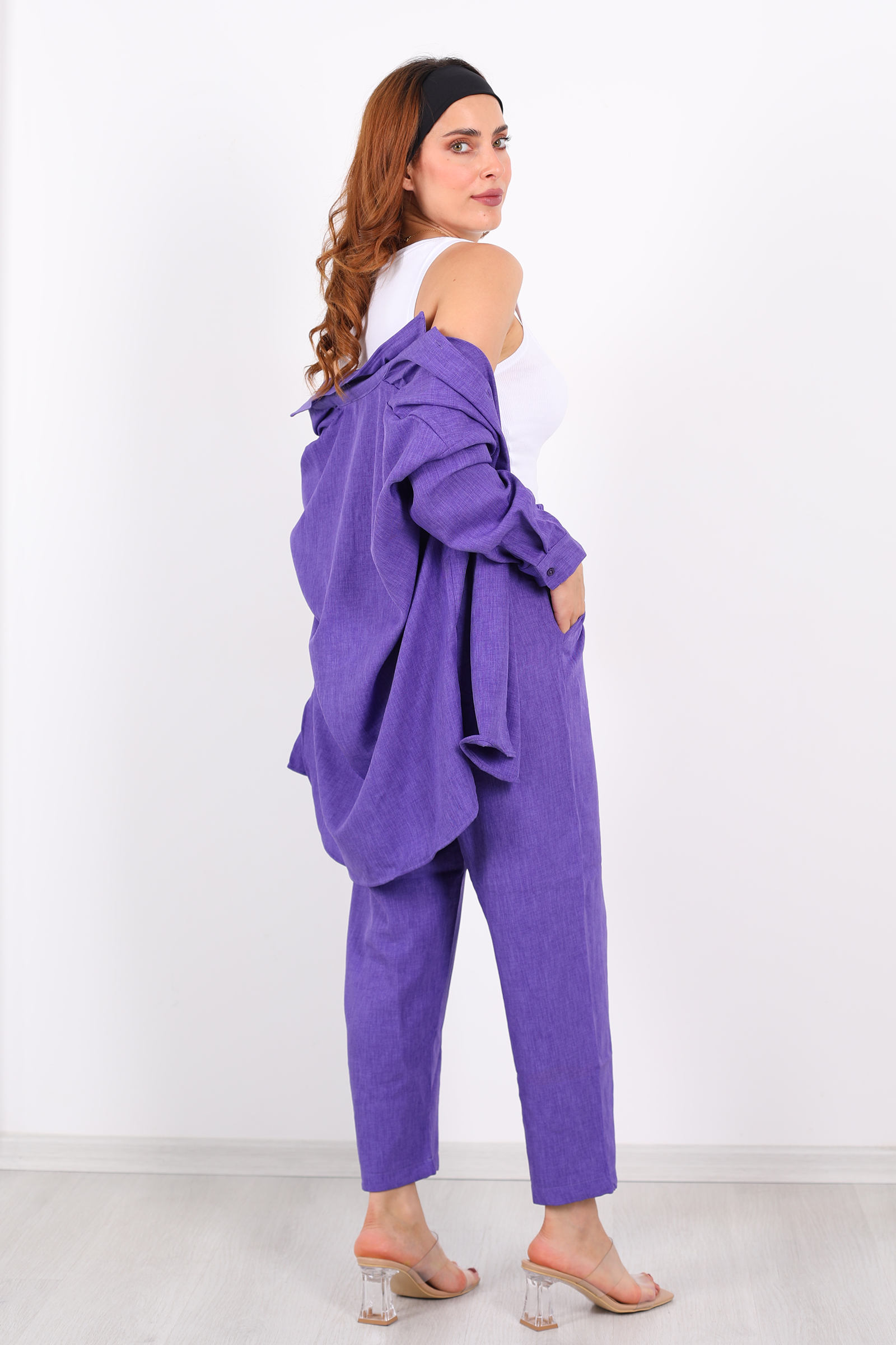 Önü Çimalı Keten Eflatun Kadın Gömlek Takım