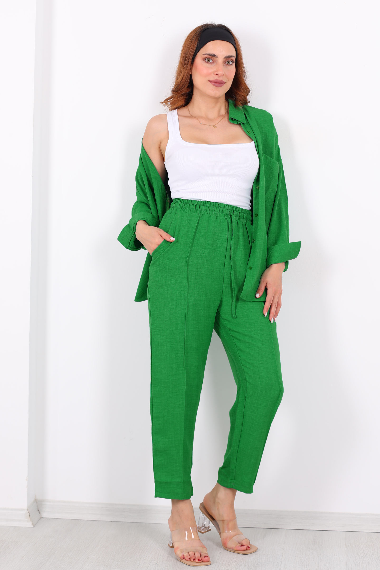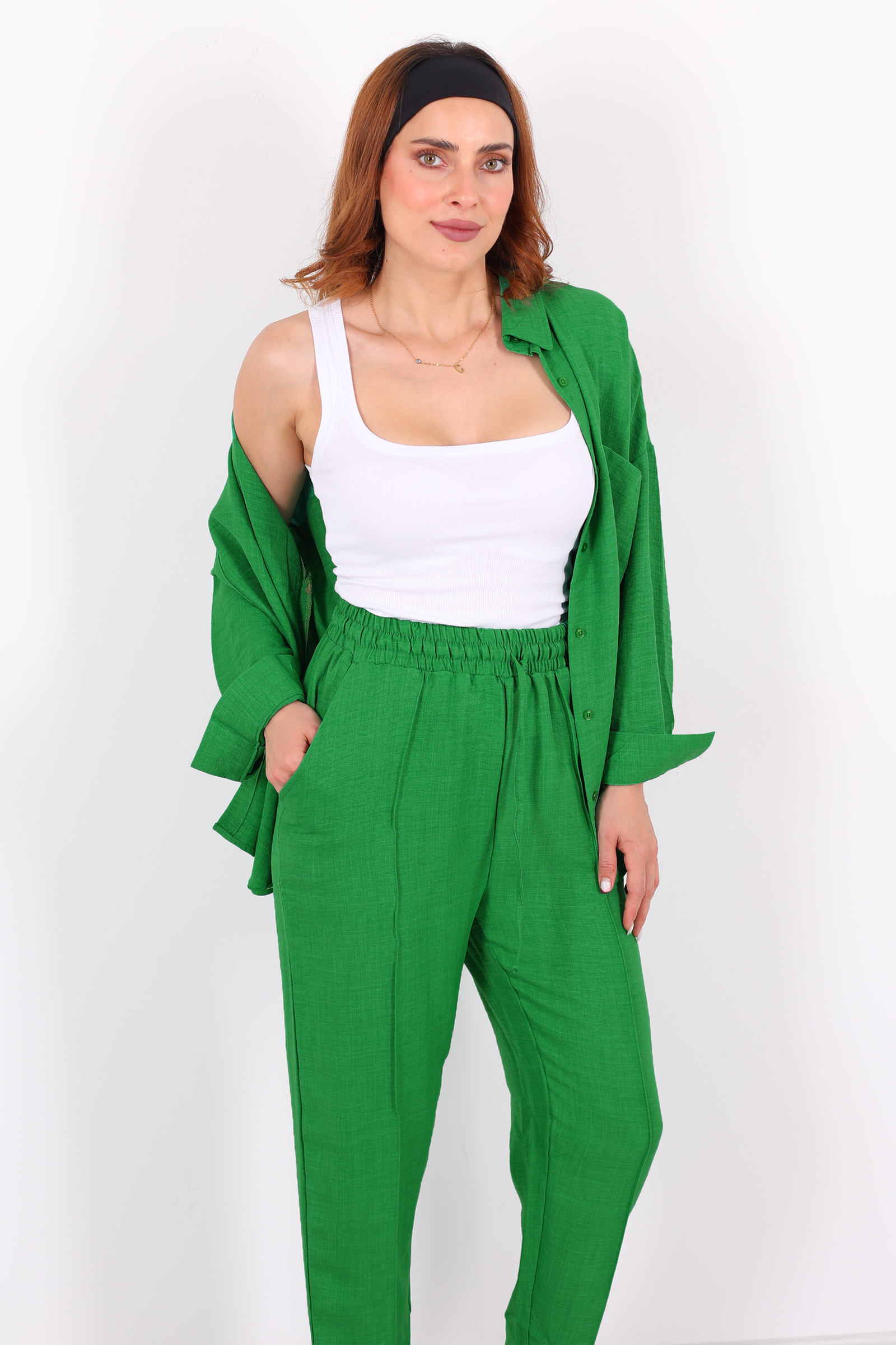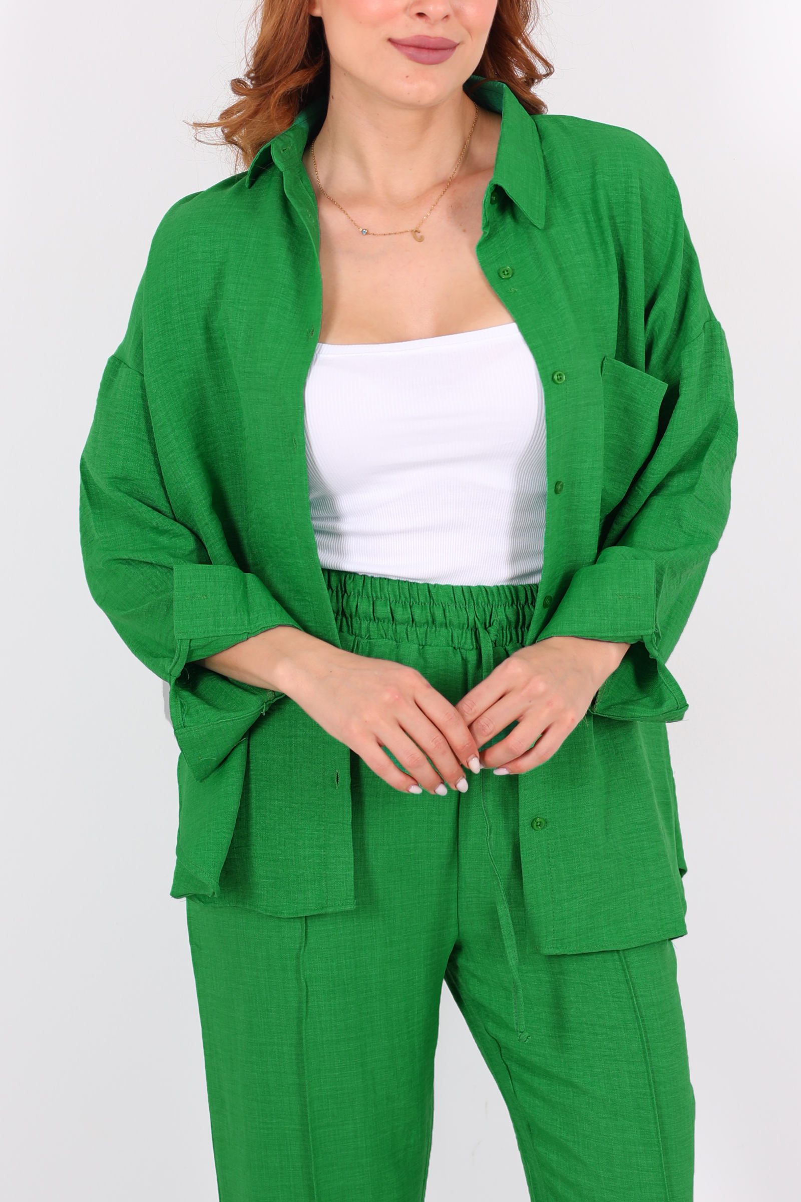 Canlı yeşil tonu ve zarif detaylarıyla öne çıkan bu gömlek takımı, yaz gardırobunuzun vazgeçilmezi olmaya aday. Keten kumaşın doğal dokusu, sıcak havalarda bile ferah bir kullanım deneyimi sunar. Ön kısmındaki çimalı detay, tasarıma modern bir dokunuş katarak şıklığınızı ön plana çıkarır. Normal kalıp tasarımı, farklı vücut tiplerine uyum sağlar ve rahat bir kullanım sunar. Bu takım, hem gündüz hem de gece kombinlerinizde rahatlıkla tercih edebileceğiniz bir parça.