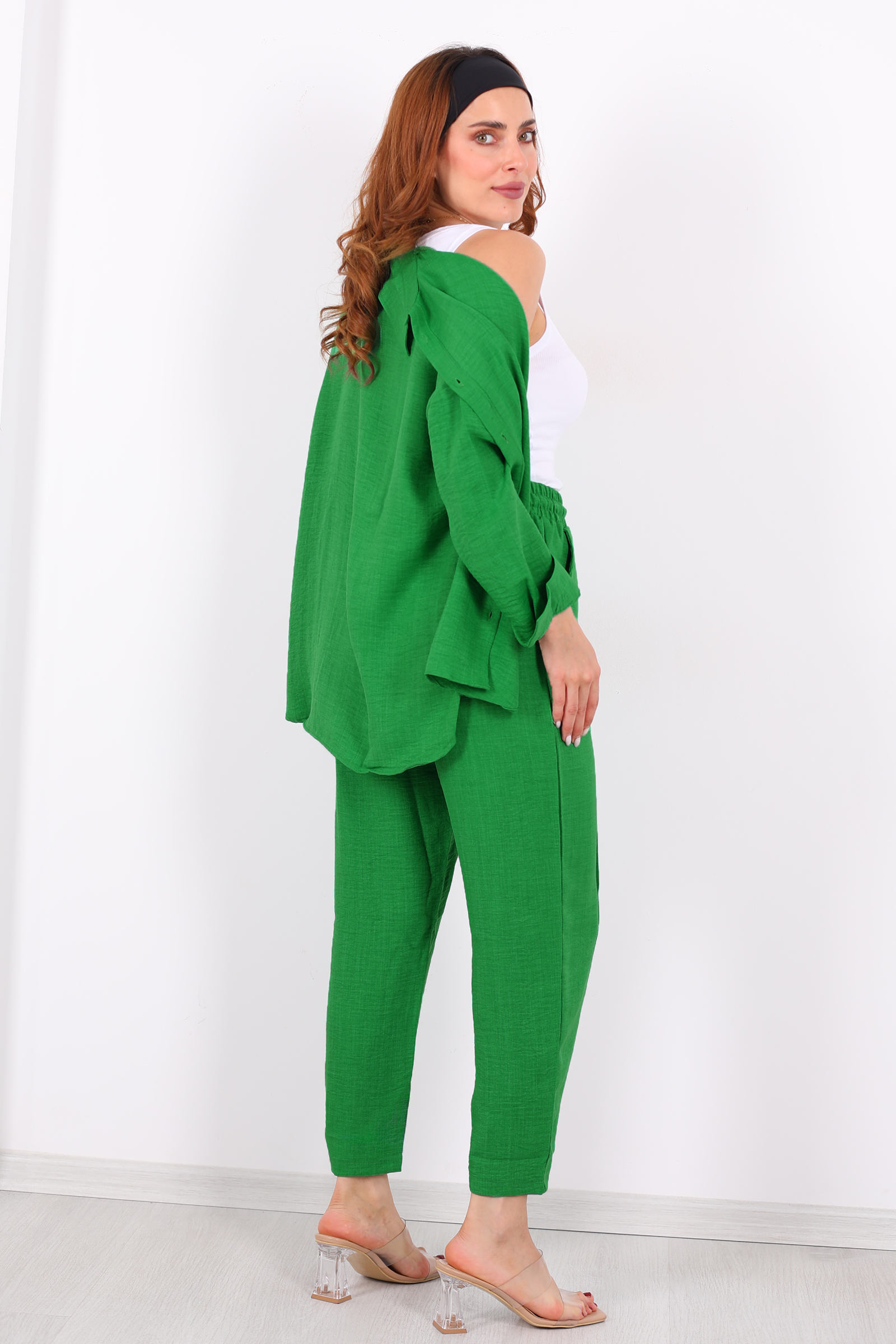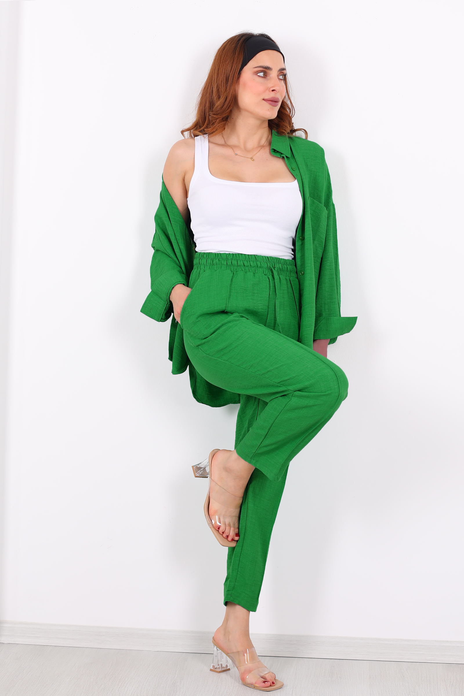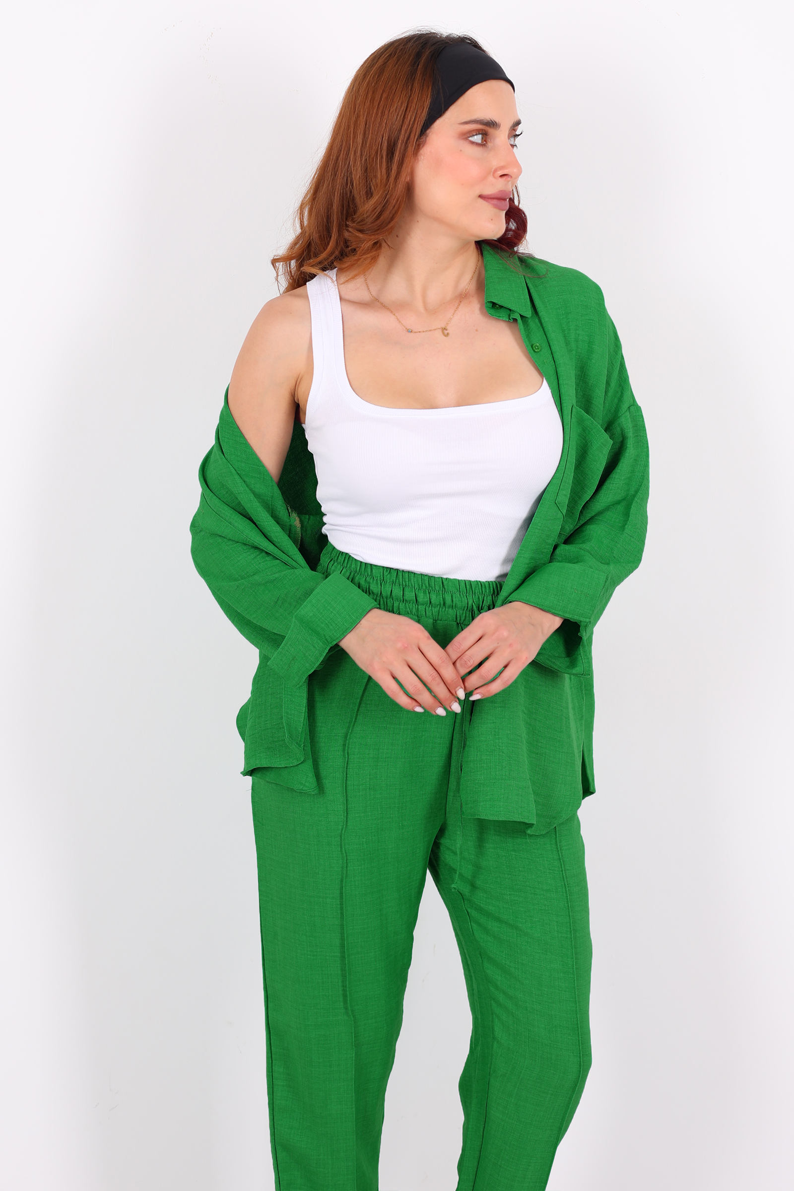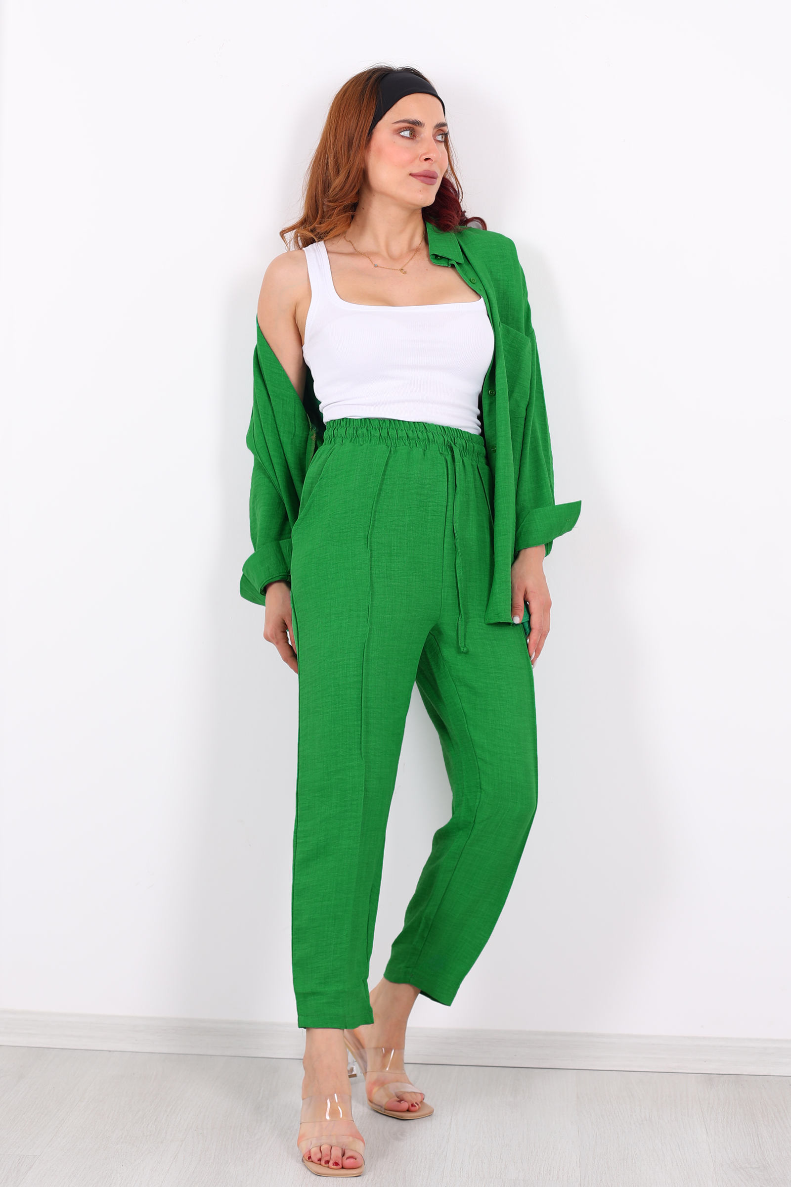 Canlı yeşil tonu ve zarif detaylarıyla öne çıkan bu gömlek takımı, yaz gardırobunuzun vazgeçilmezi olmaya aday. Keten kumaşın doğal dokusu, sıcak havalarda bile ferah bir kullanım deneyimi sunar. Ön kısmındaki çimalı detay, tasarıma modern bir dokunuş katarak şıklığınızı ön plana çıkarır. Normal kalıp tasarımı, farklı vücut tiplerine uyum sağlar ve rahat bir kullanım sunar. Bu takım, hem gündüz hem de gece kombinlerinizde rahatlıkla tercih edebileceğiniz bir parça.