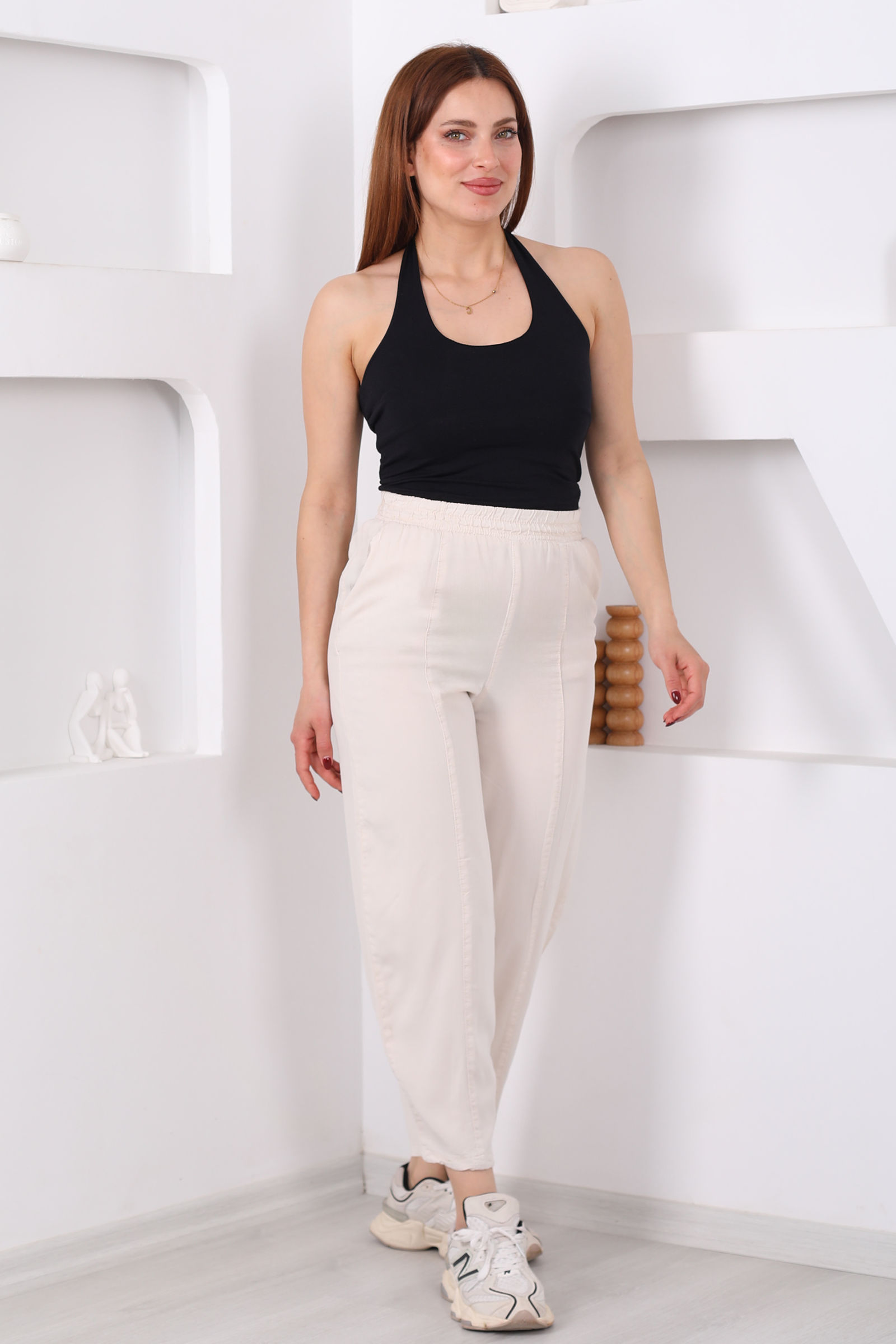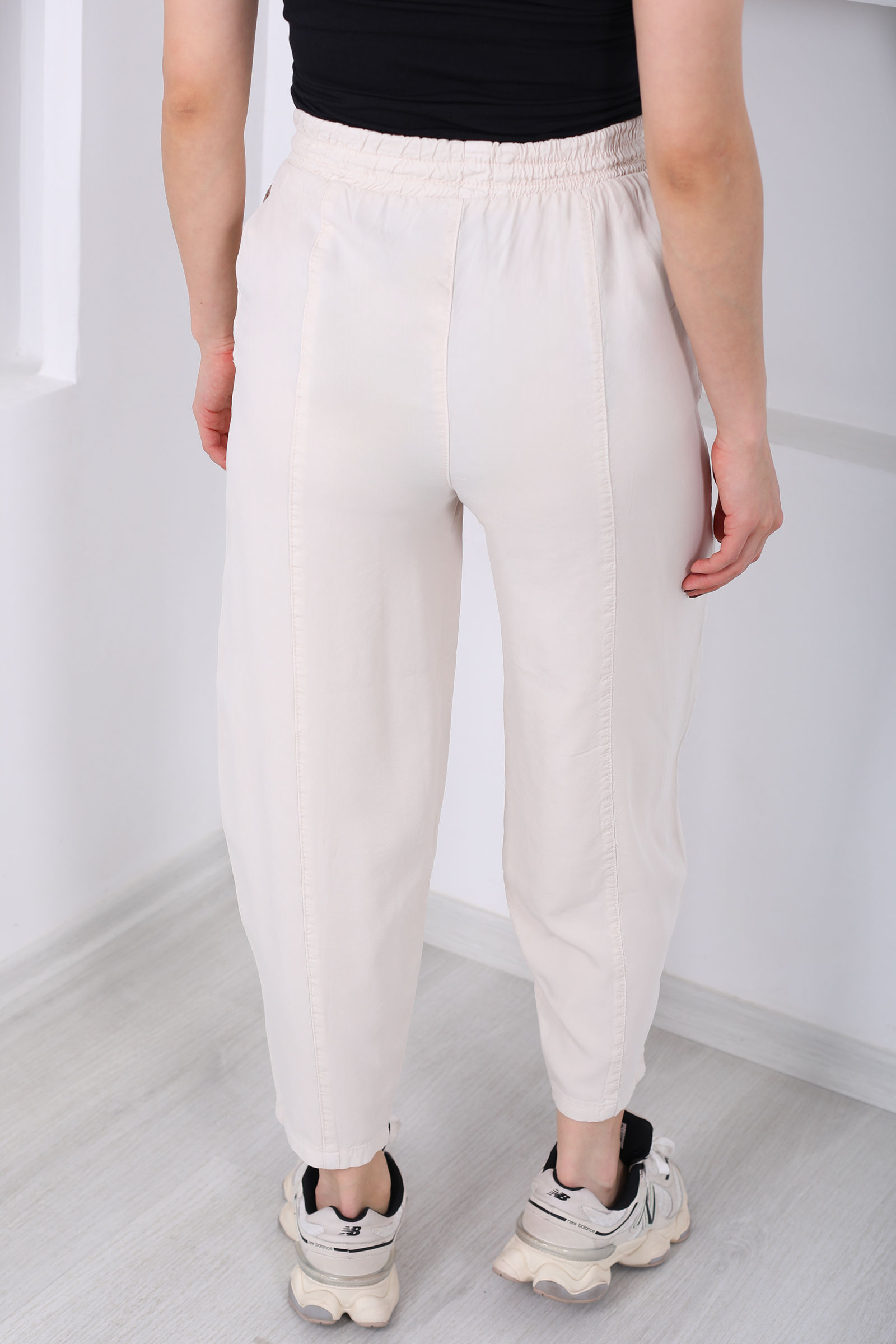 Beldeki bağlama detayı, pantolonu kişisel beğeninize göre ayarlamanıza olanak tanır ve silueti daha ritmik bir çizgiye taşır. Taş rengin nötr fakat sofistike tonu, hem pastel üstlerle hem de canlı renklerle uyum sağlayarak kombinlerinize dingin bir estetik katar. Sneaker’lar ile gündelik bir görünüm, sandaletlerle ise bohem‑zarif bir stil yaratabilirsiniz.