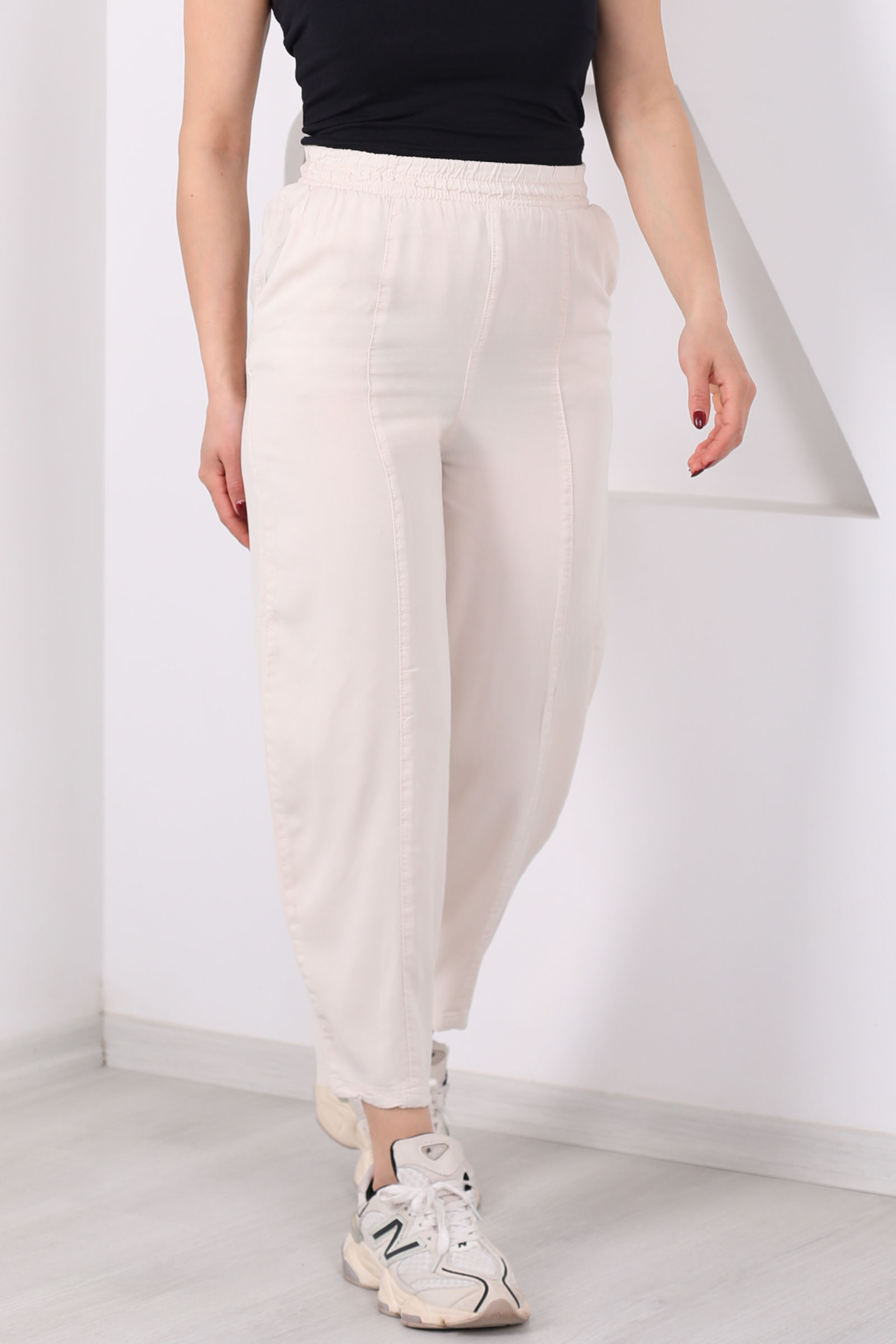 Soft taş rengi ile zarif bir stil ifadesi sunan bu tensel pantolon, şalvar kesimi sayesinde hareket özgürlüğünü artırırken gün boyu ferah bir his sağlar. Tensel kumaşın akışkan ve nefes alabilen yapısı, sıcak günlerde bile konforu garanti eder; önü pileli tasarımı ise kıyafete incelikli bir hacim ve modern bir dokunuş katar.