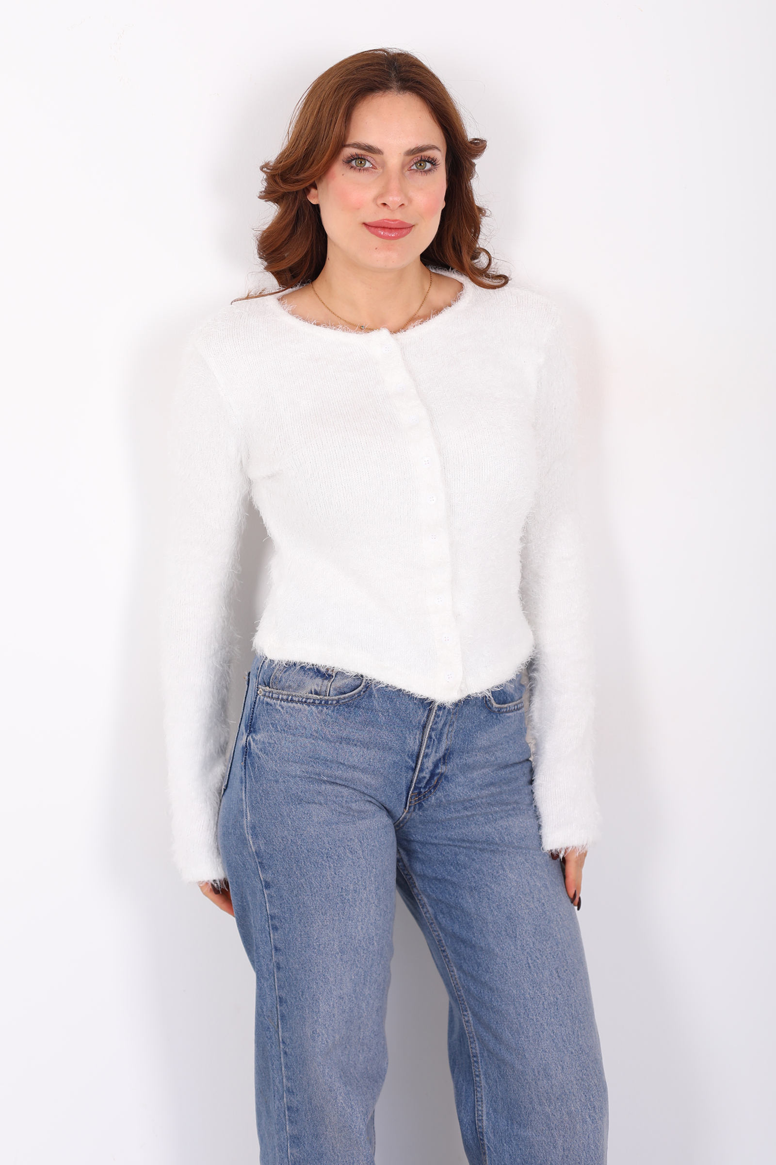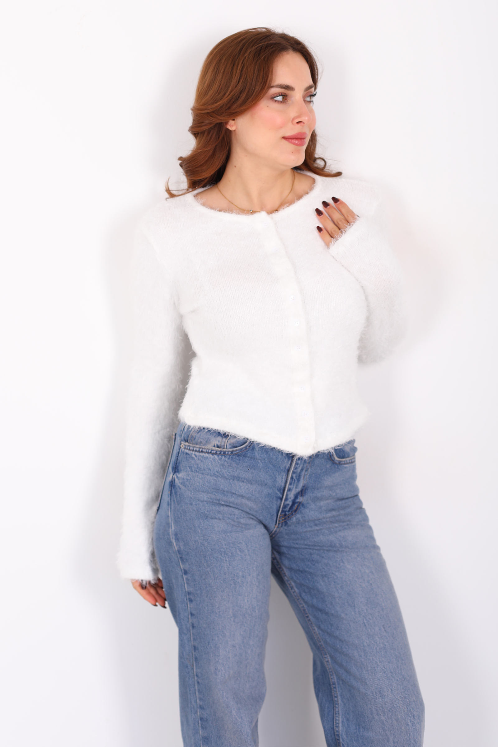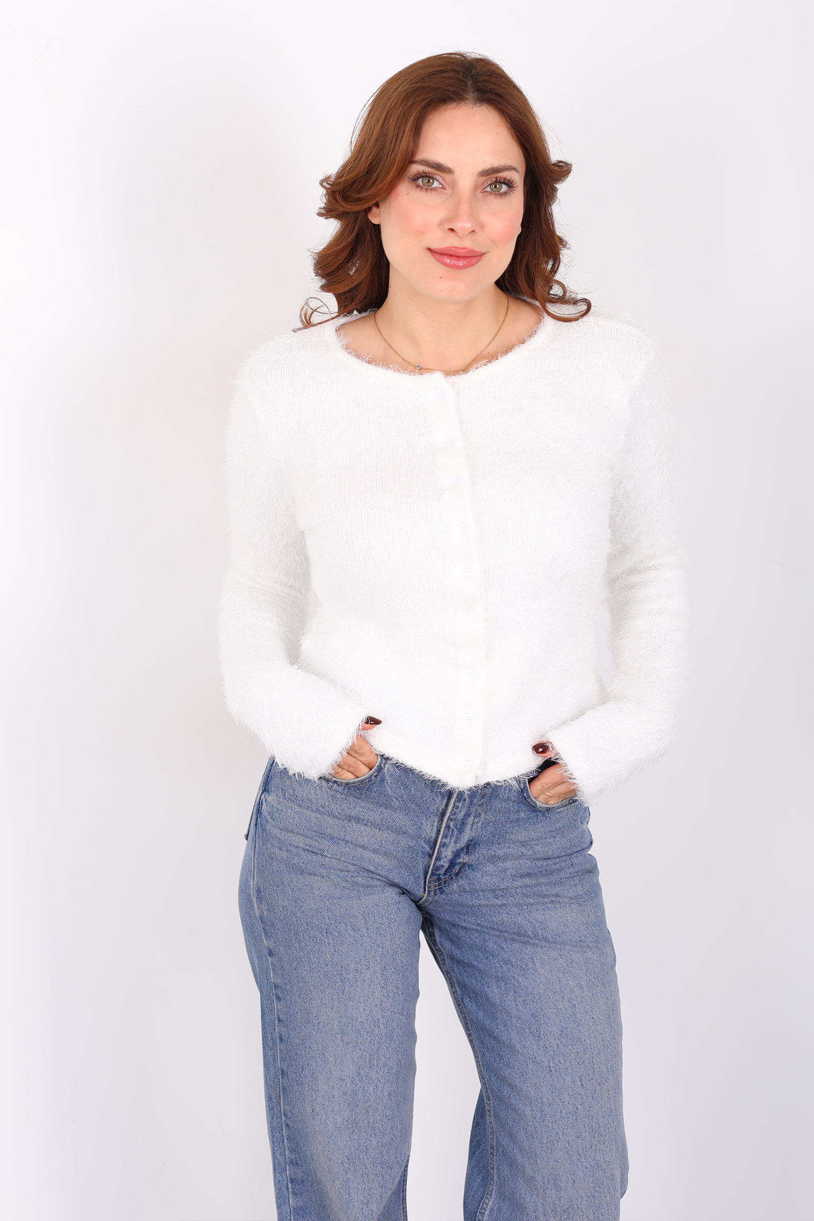 Yumuşak sakallı triko dokusuyla hazırlanmış bu beyaz hırka, sade çizgilere sıcaklık kazandırıyor. Önündeki düğmeler minimalist tasarımı dengelerken, hafif hacimli yüzey dokusu görünümünüze ifade katar. Triko yapısı gün boyu konfor sunar ve jean’den kumaş pantolona kadar pek çok alt giyimle uyum yakalayarak rahat kombinler oluşturmanıza yardımcı olur. Beyazın ferah duruşu, casual stilinize taze ve temiz bir hava katar; farklı mevsim geçişlerinde de kullanıma uygundur.