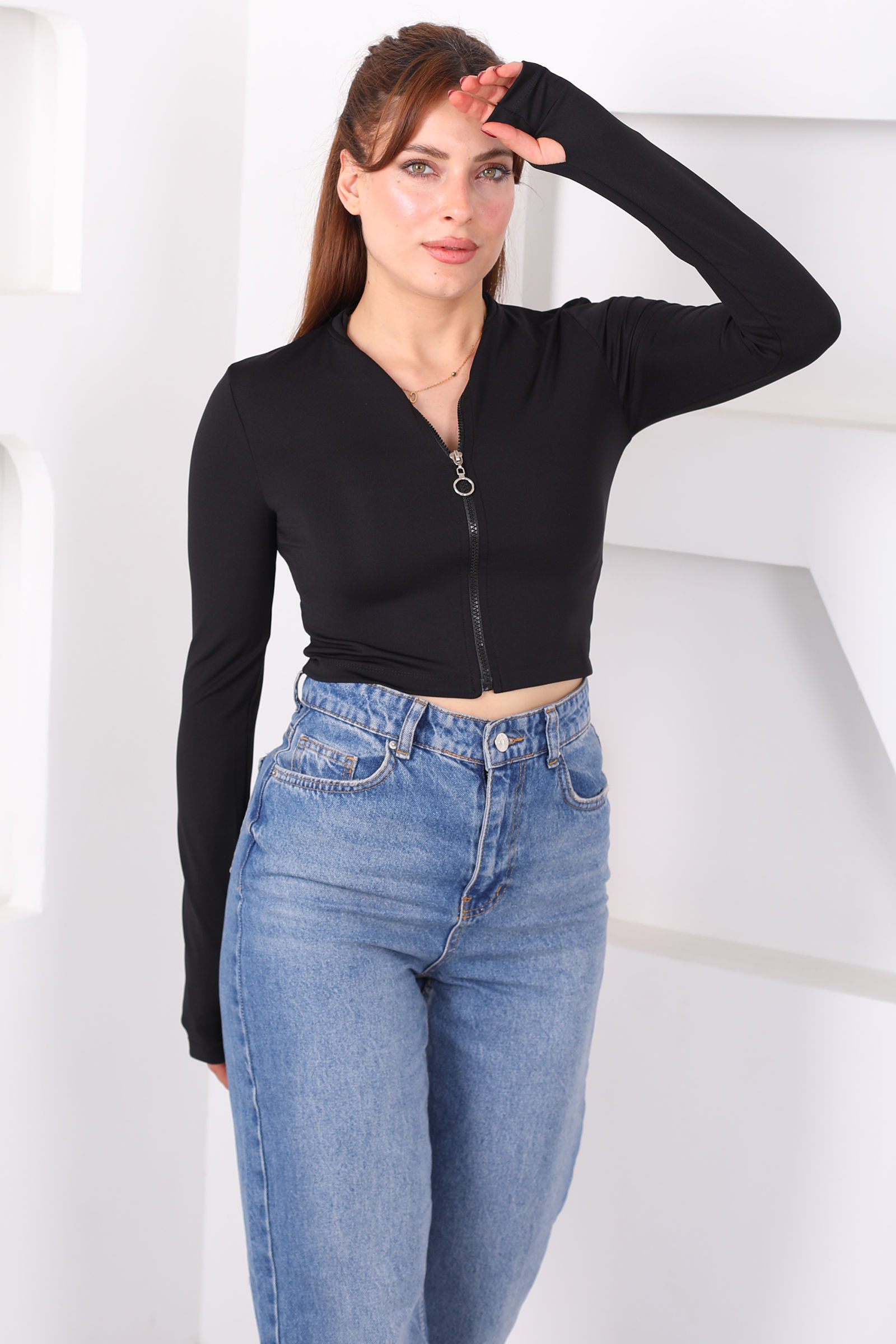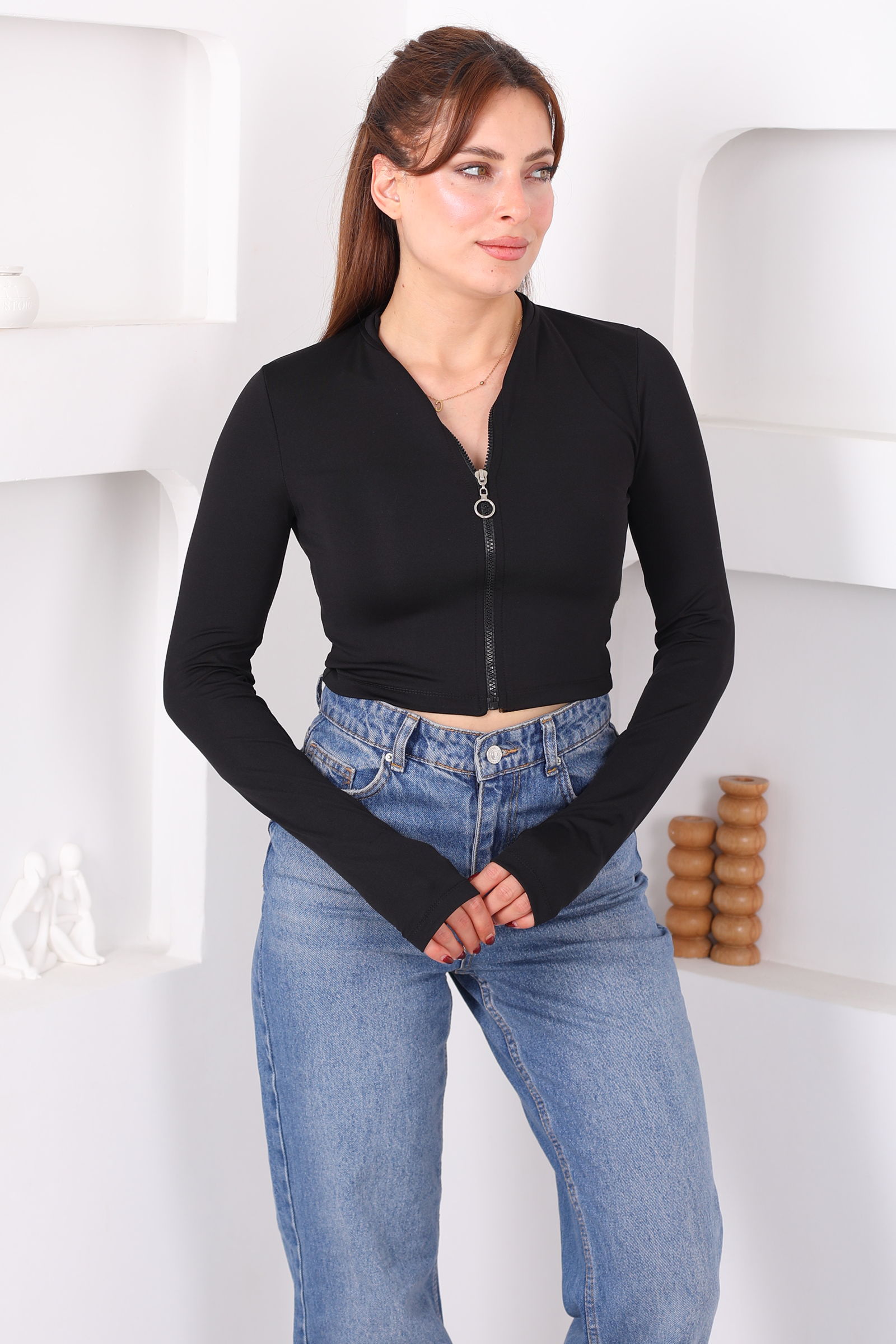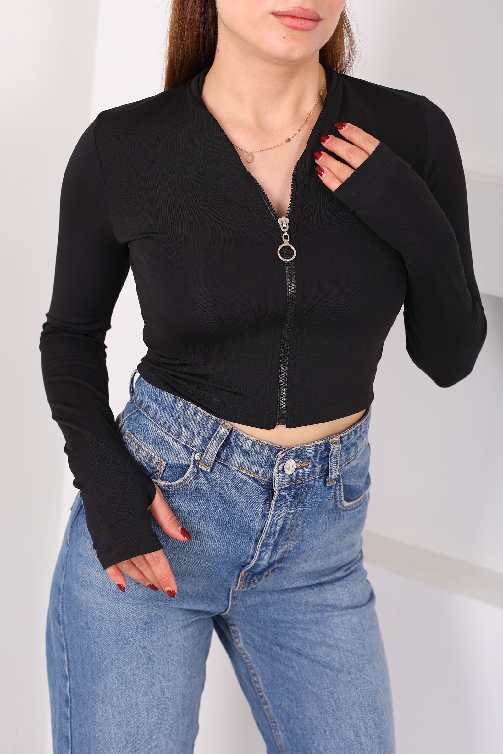 Önü Fermuarlı Parmak Geçirmeli Kadın Siyah Slim Bluz