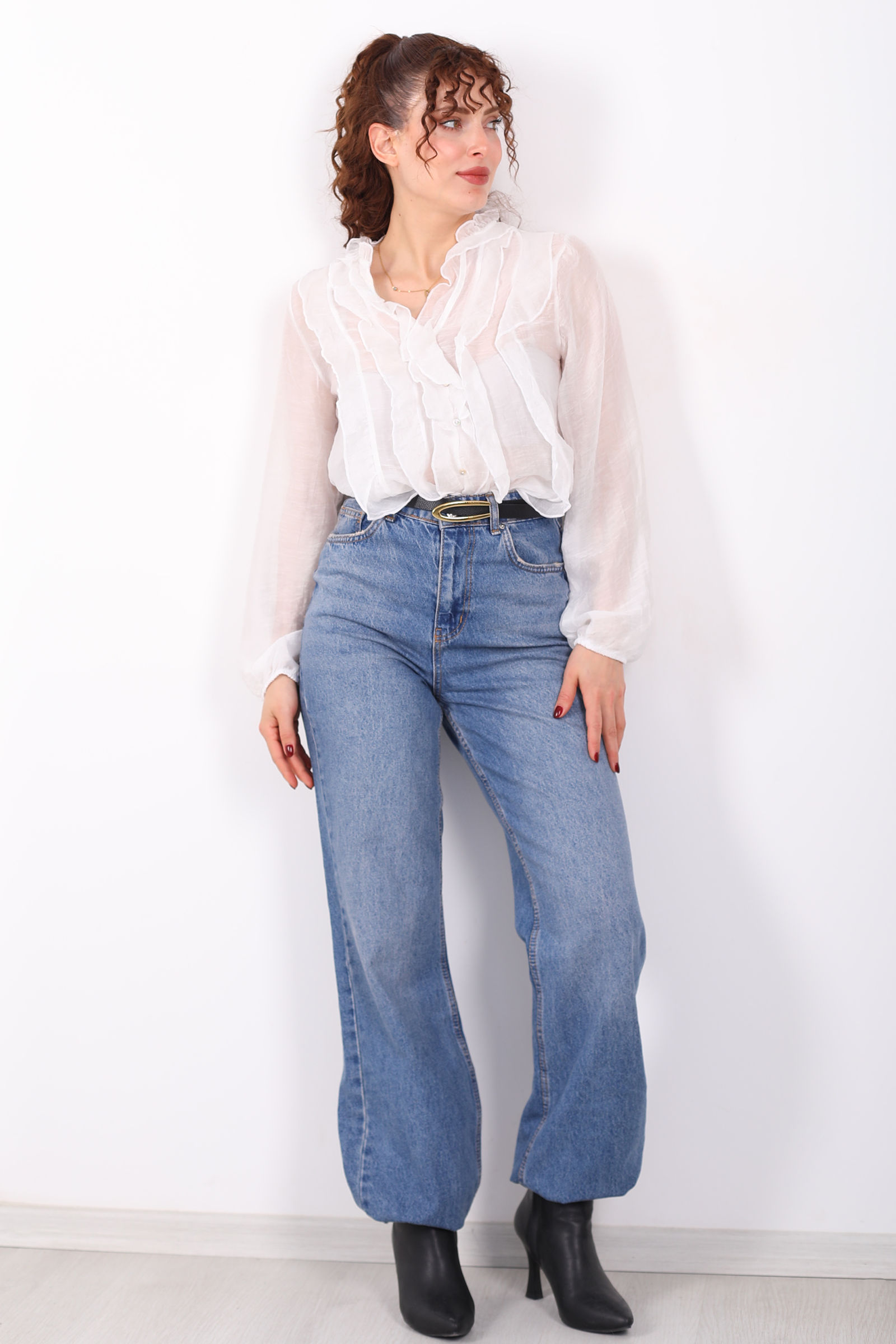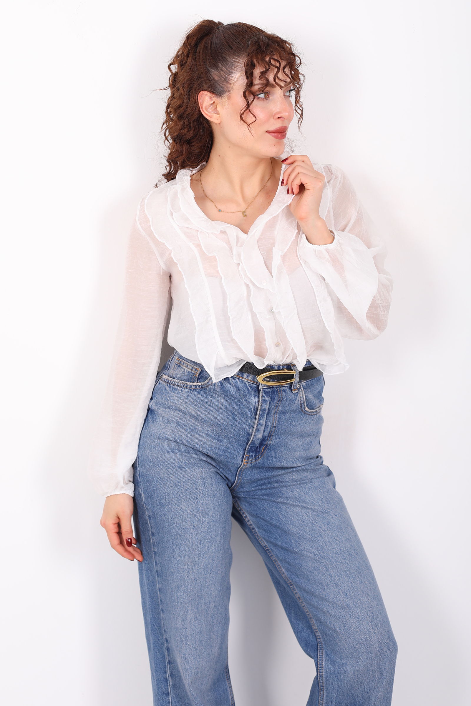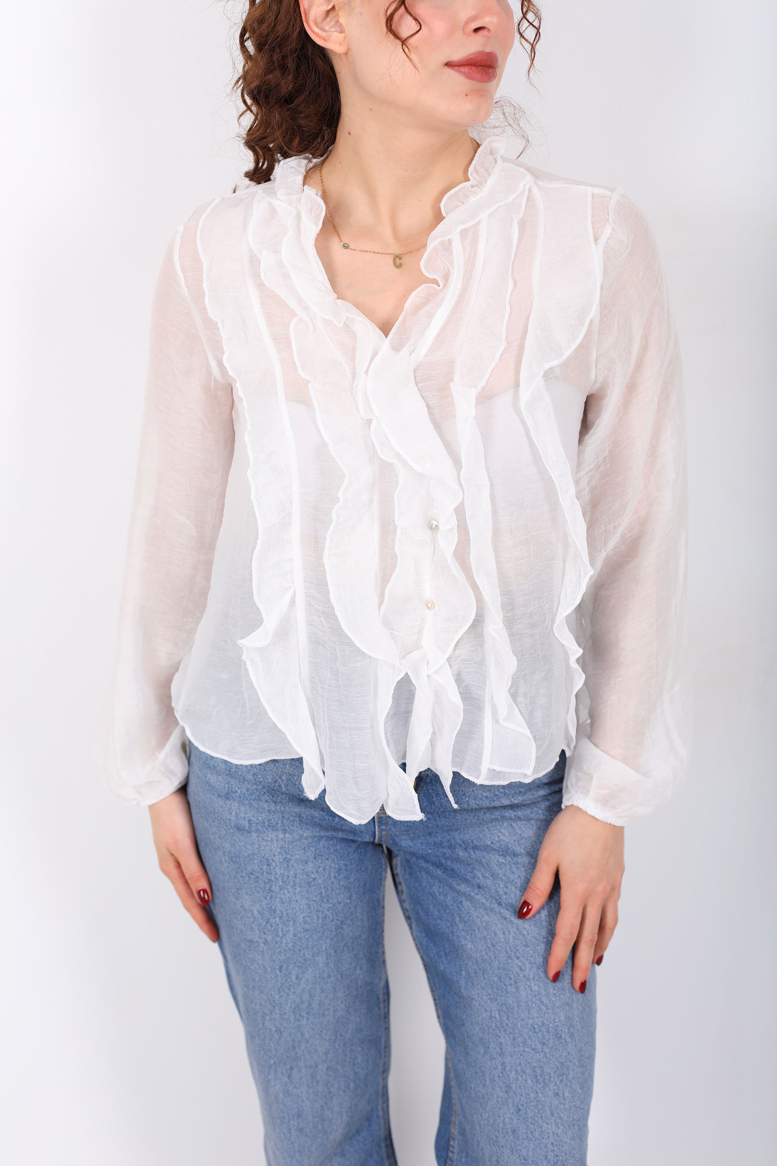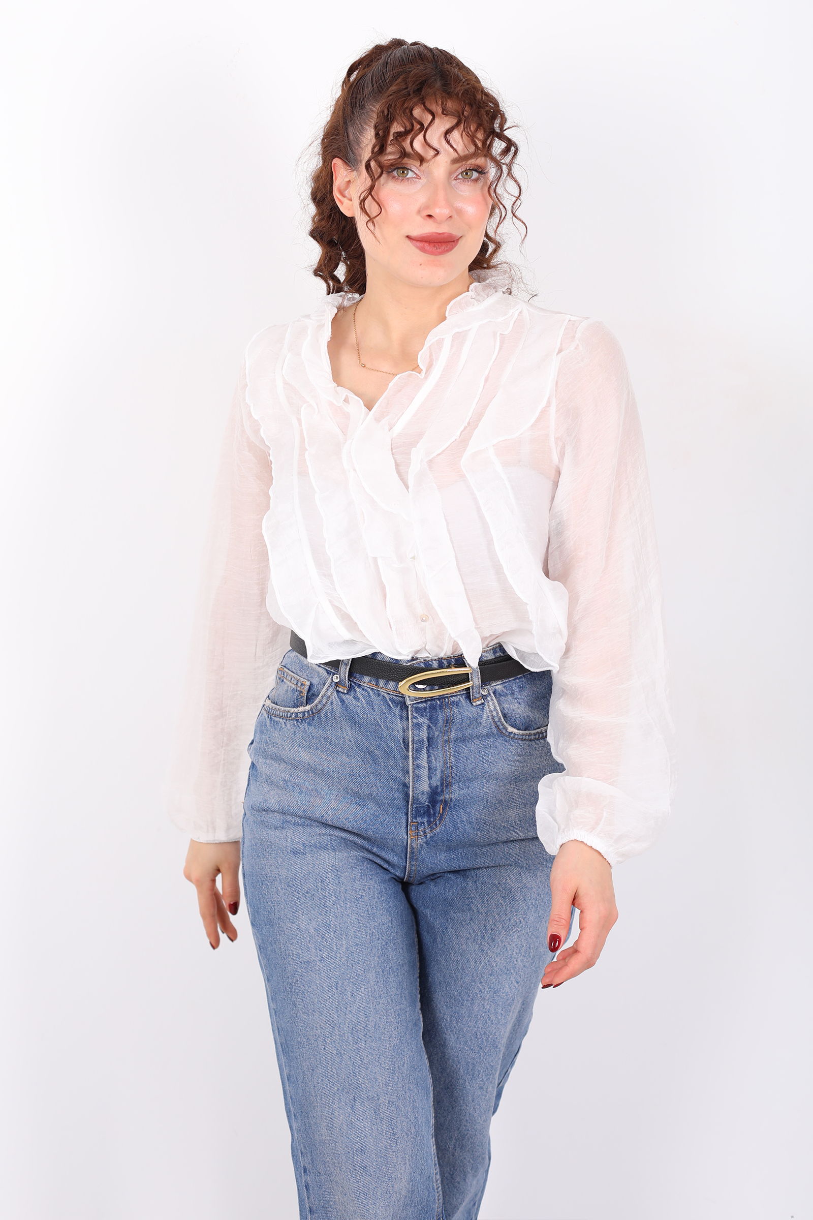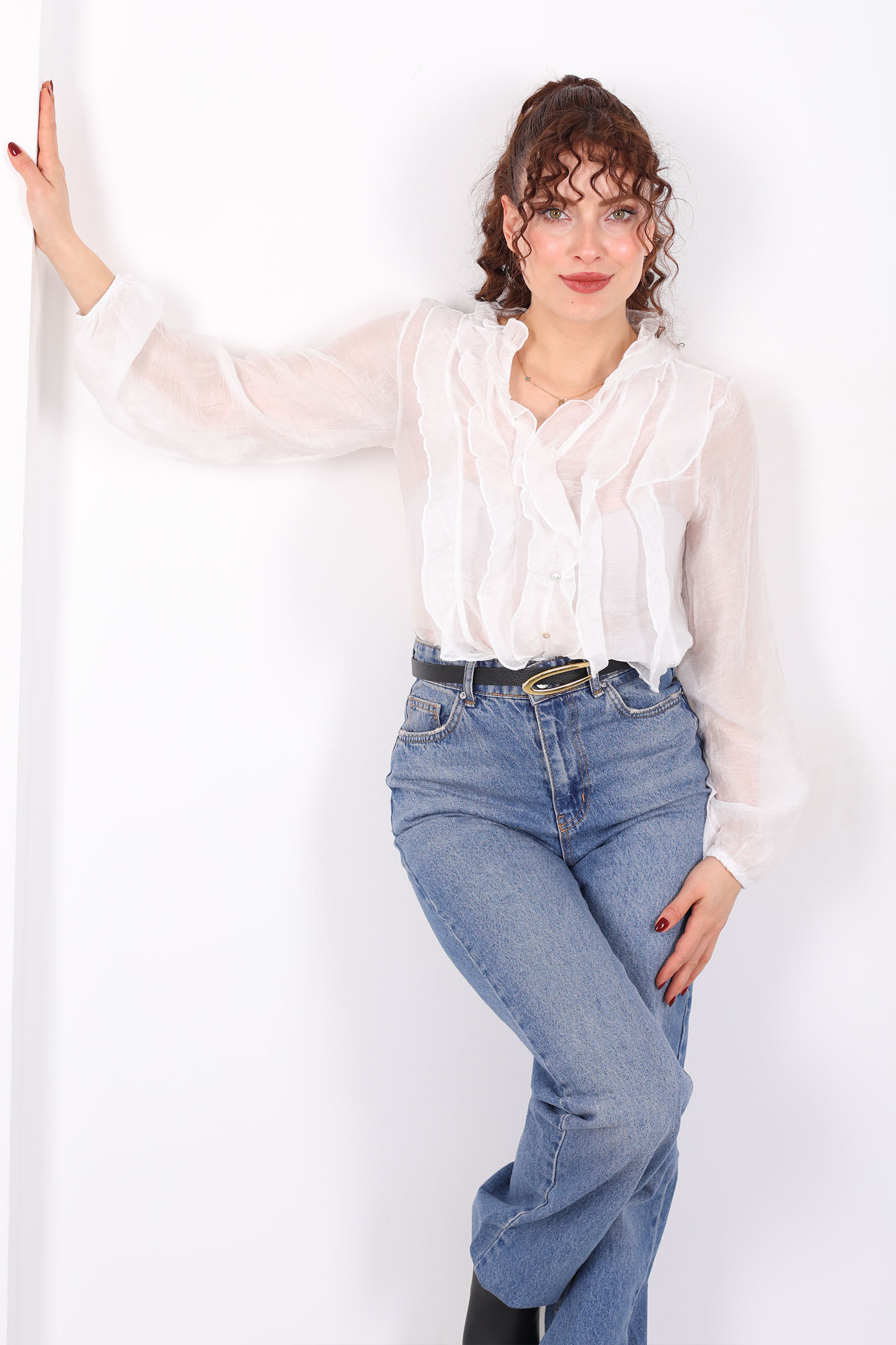 Zarafetin yumuşak dokunuşuyla modern çizgiyi bir araya getiren önü fırfırlı düğmeli beyaz kadın transparan gömlek, stiline feminen bir hava katıyor. Saf beyaz rengi ve hafif transparan yapısıyla bu gömlek, her mevsim kombinine ferahlık ve zarafet getirir. Ön kısmındaki fırfır detayları, klasik gömlek siluetine romantik ve dinamik bir dokunuş eklerken, düğmeli tasarım modernliği ve fonksiyonelliği bir arada sunar.