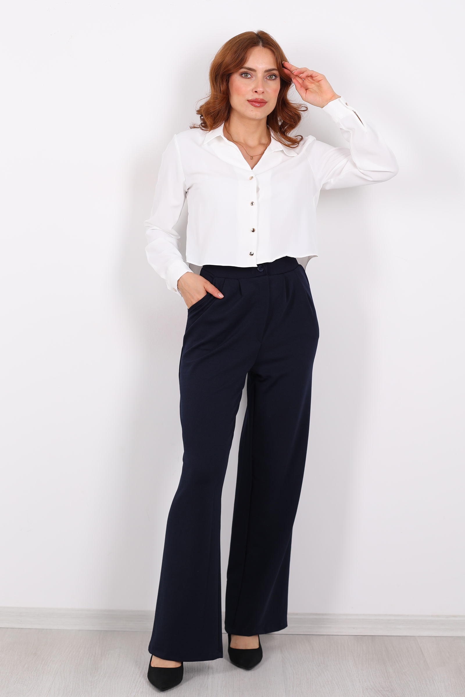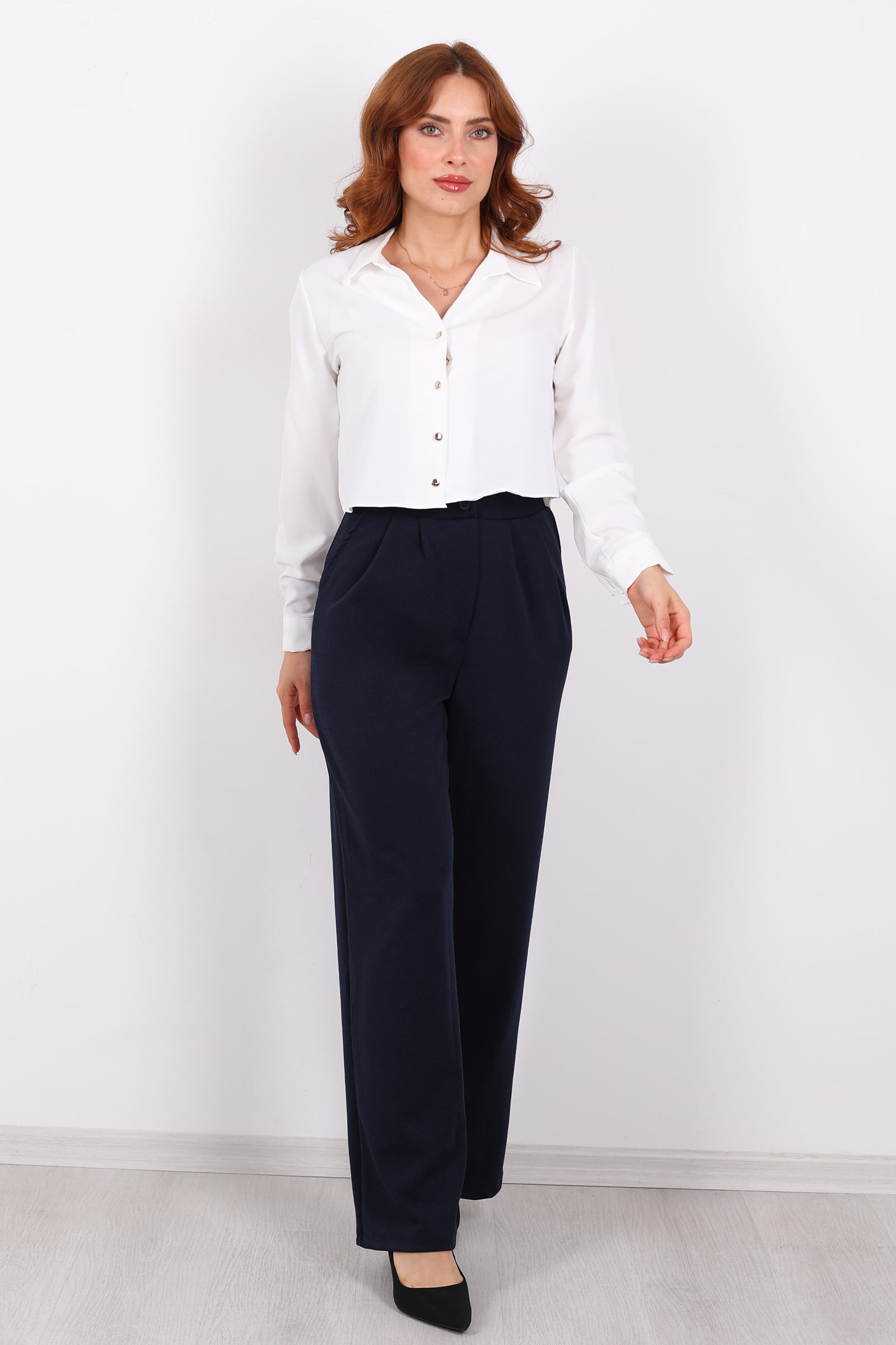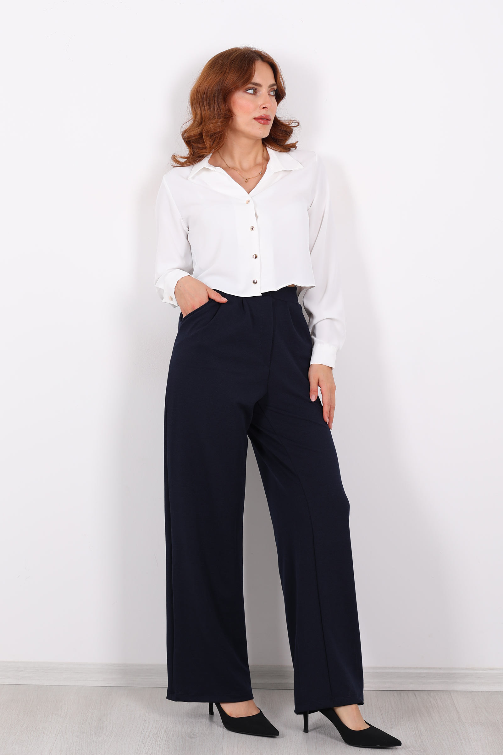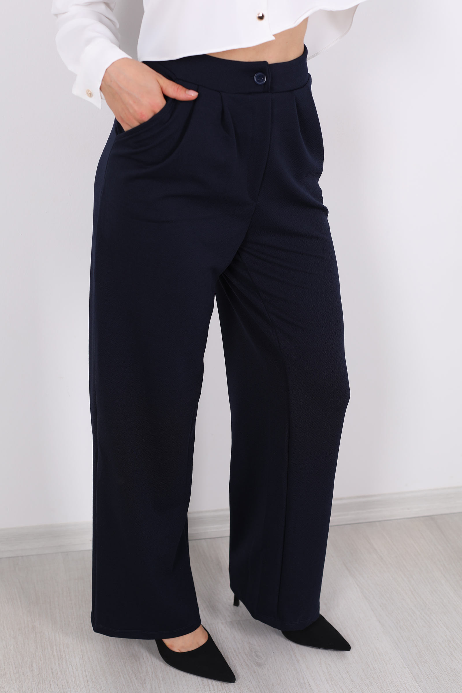 Önü Pensli Bol Paça Lacivert Kadın Krep Pantolon