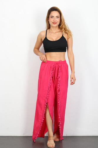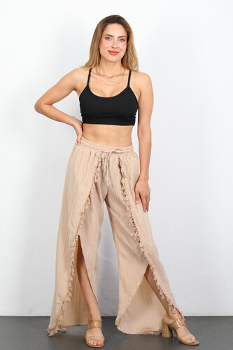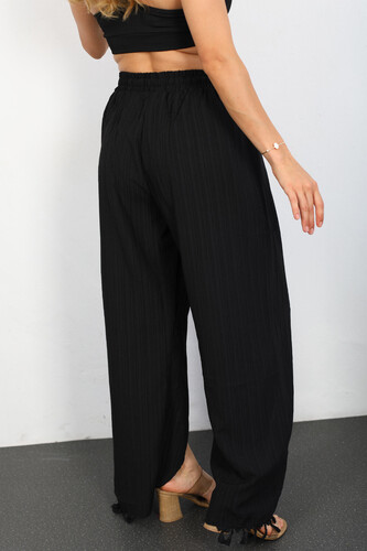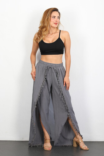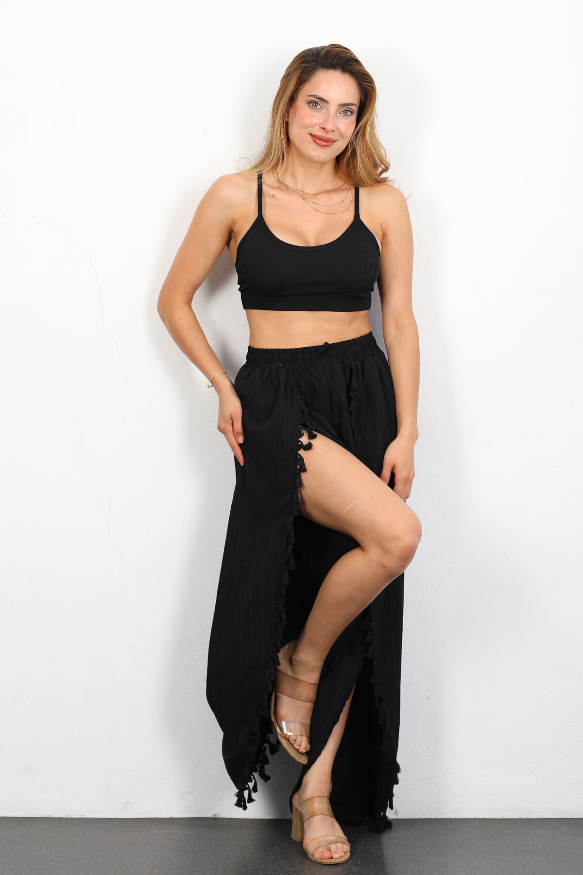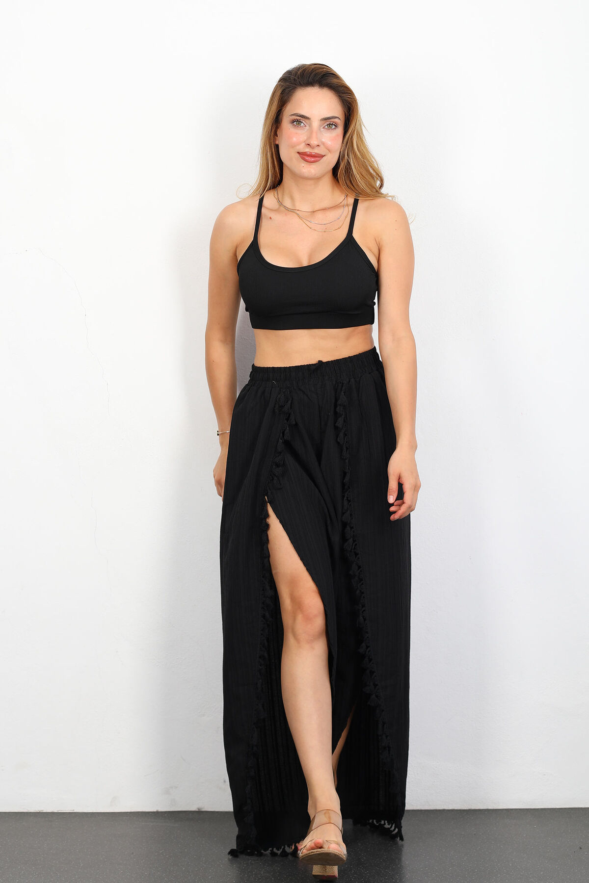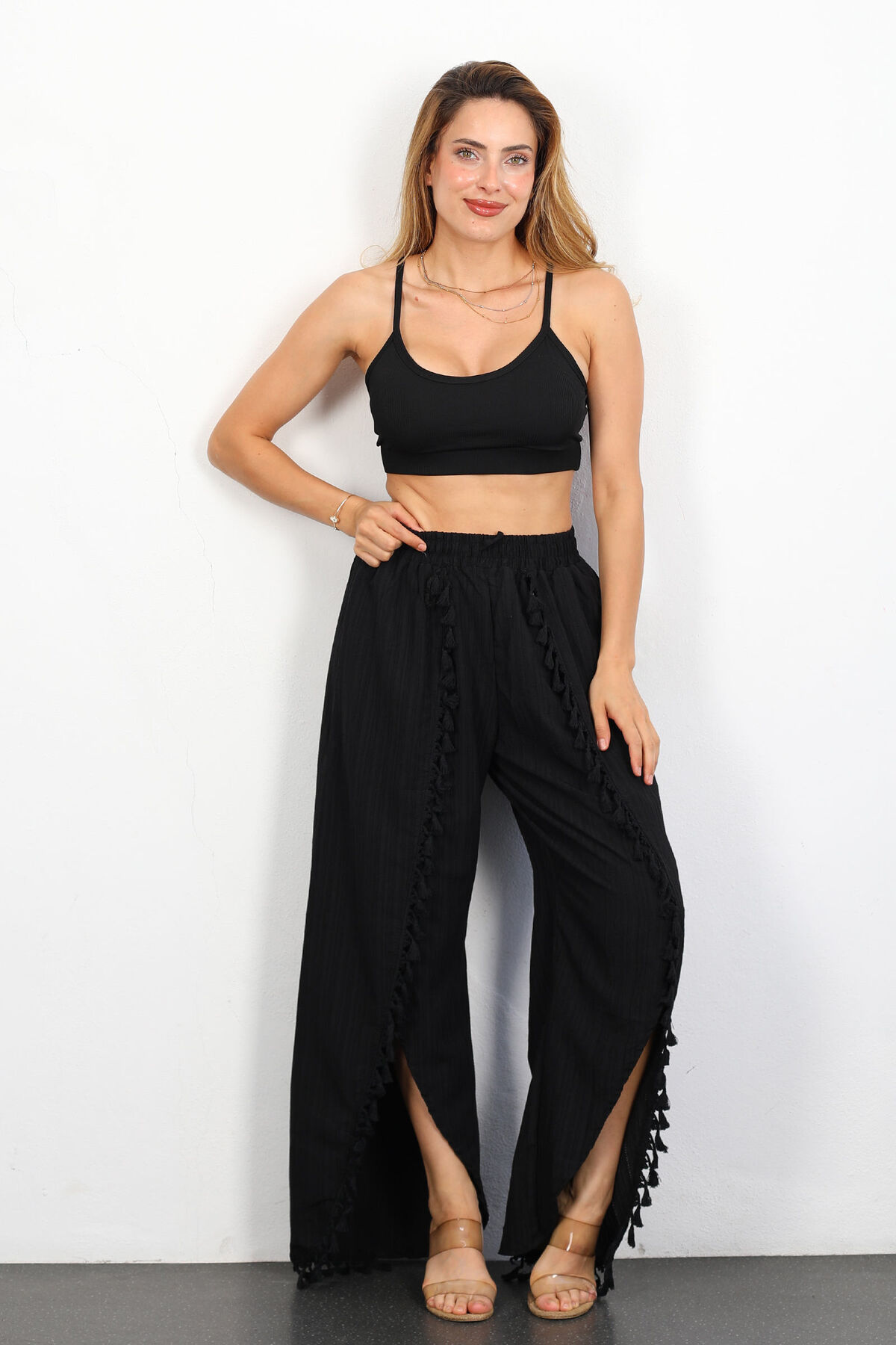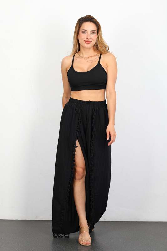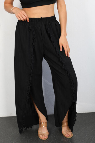 Karakterli bir duruş isteyen stil sahiplerine özel: Siyah gofre pantolon, nostaljik dokusuyla modern tavrınızı ortaya çıkarıyor. Önde dans eden püsküller adımlarınızı ritimlendirecek; yırtmaçlar ise her adımda zarif bir akış sunacak. Kendini göstermekten çekinmeyenler için yaratılmış bu tasarım, kendi stil hikayenizi yazmanız için sizi bekliyor.