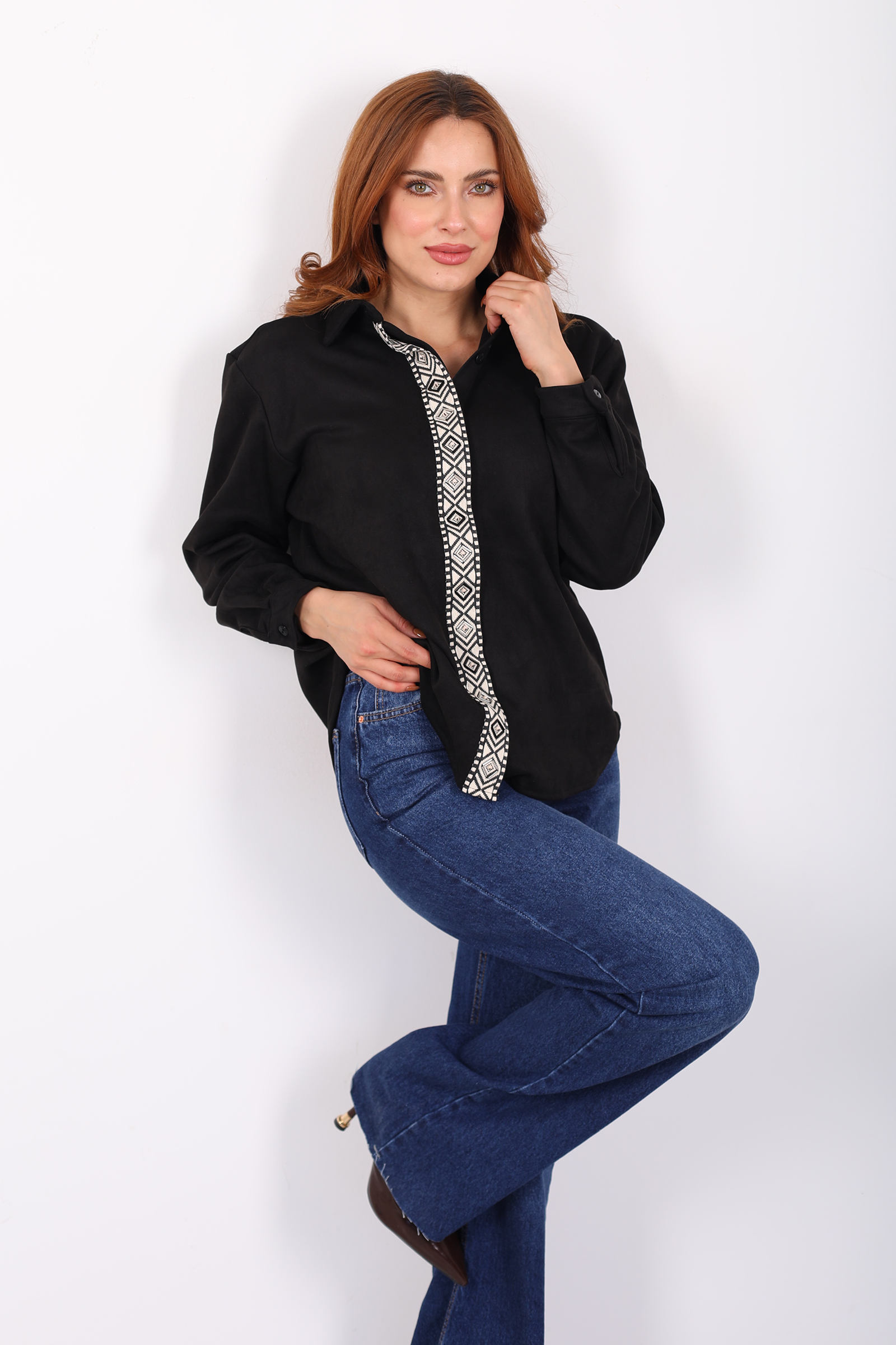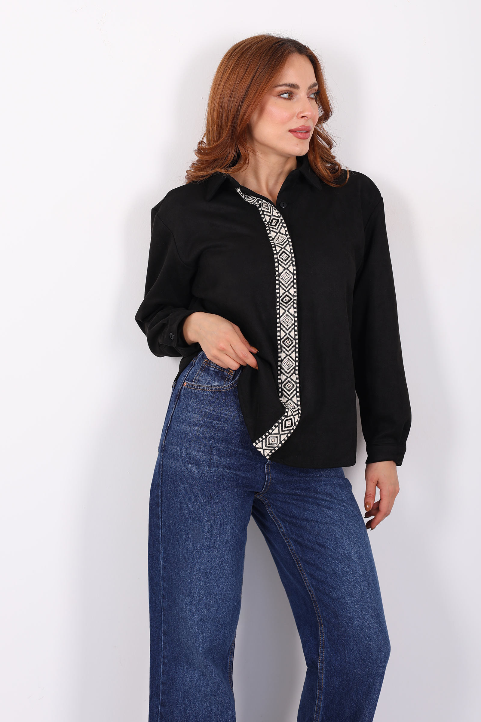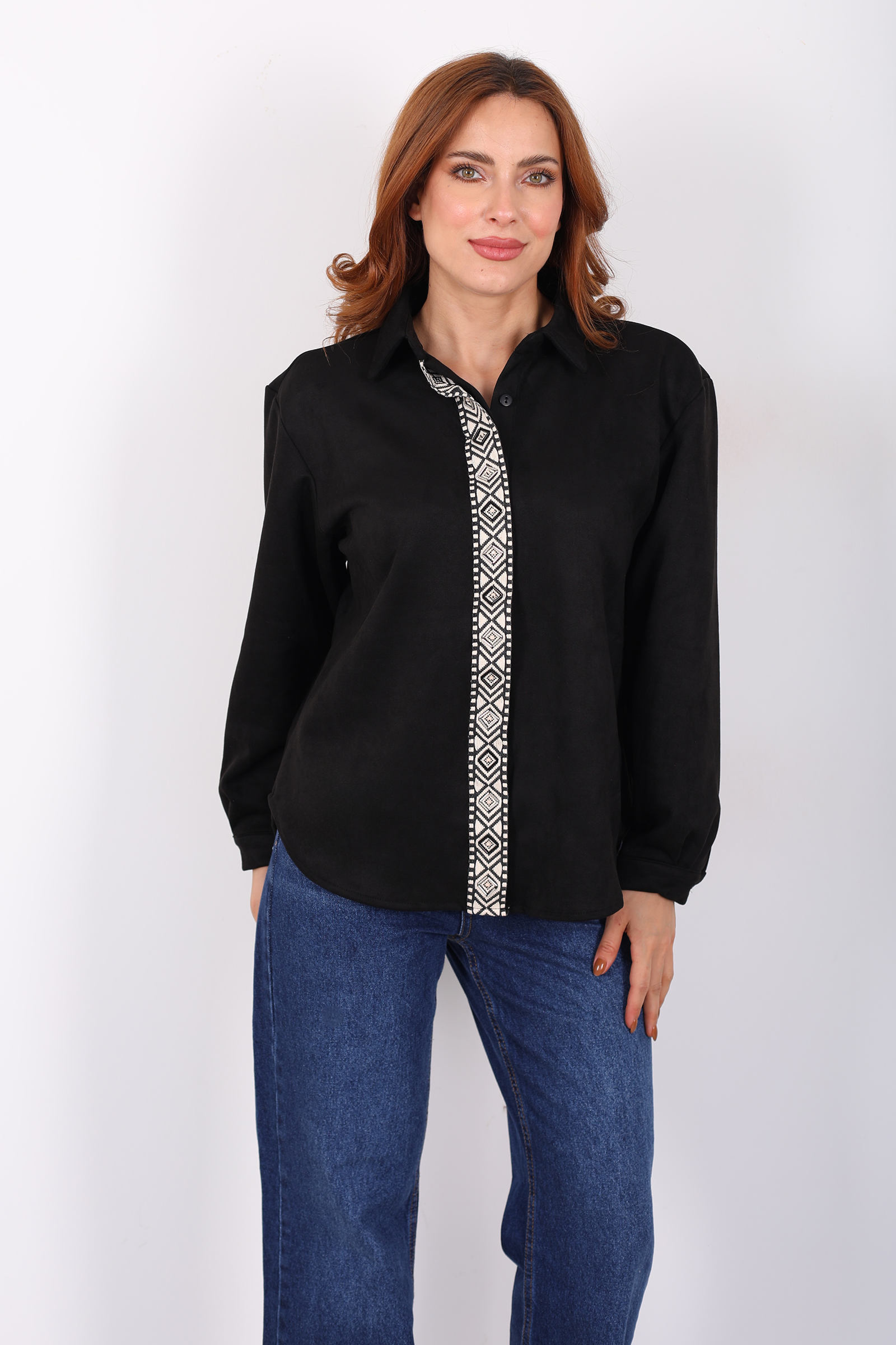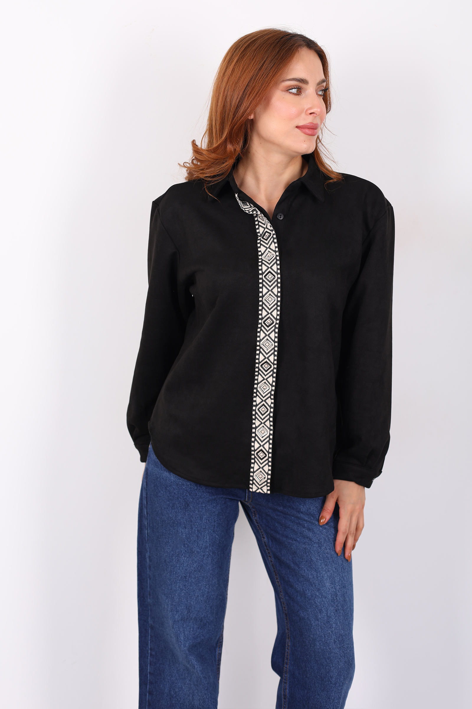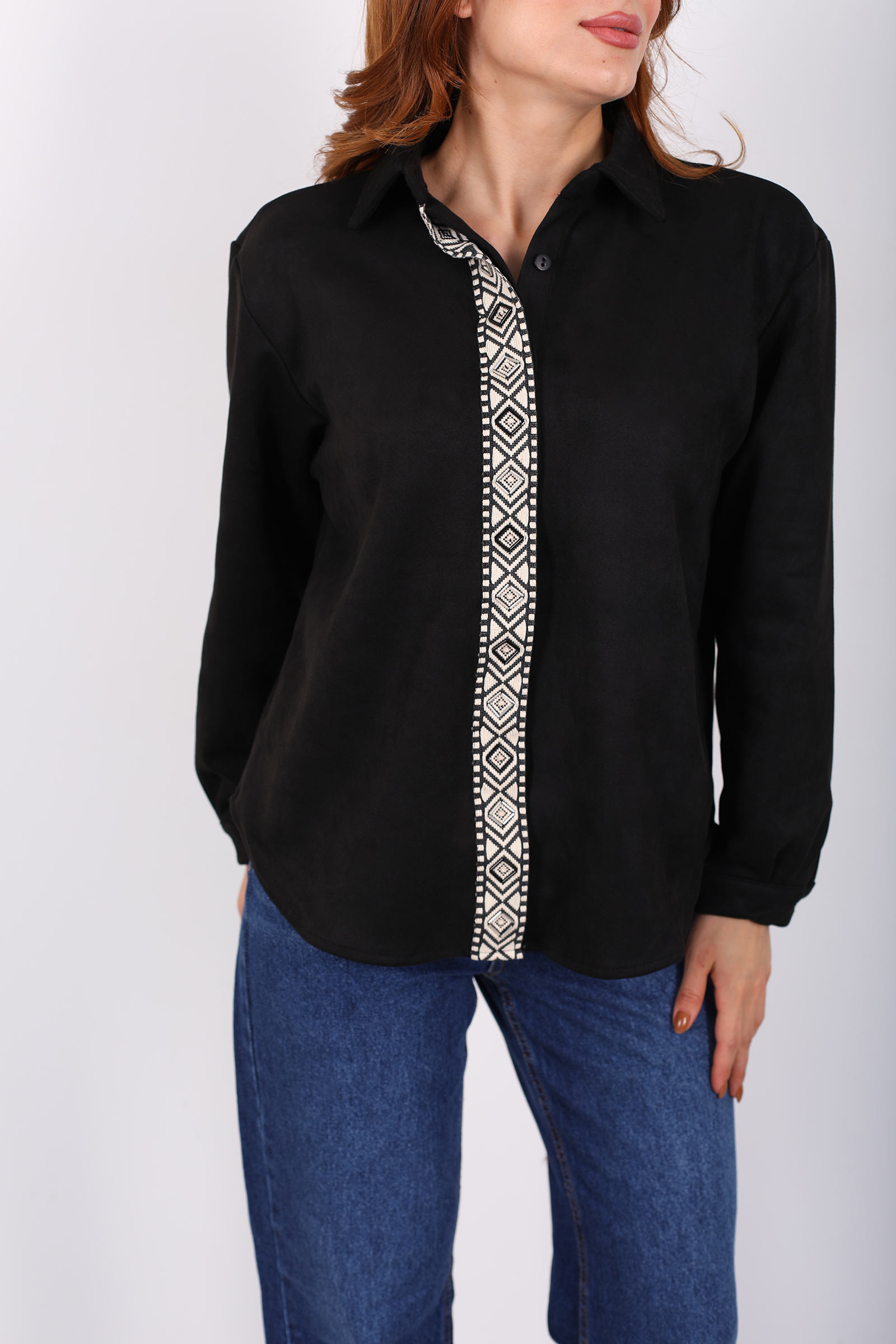 Önü Şerit Taşlı Detaylı Siyah Kadın Süet Gömlek