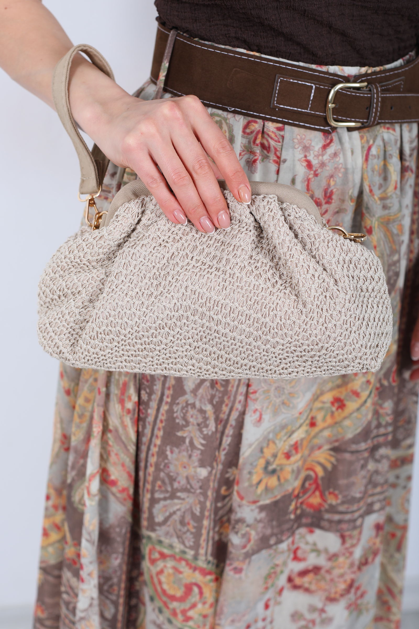 Fermuarlı Örme Krem Hasır Omuz Çantası