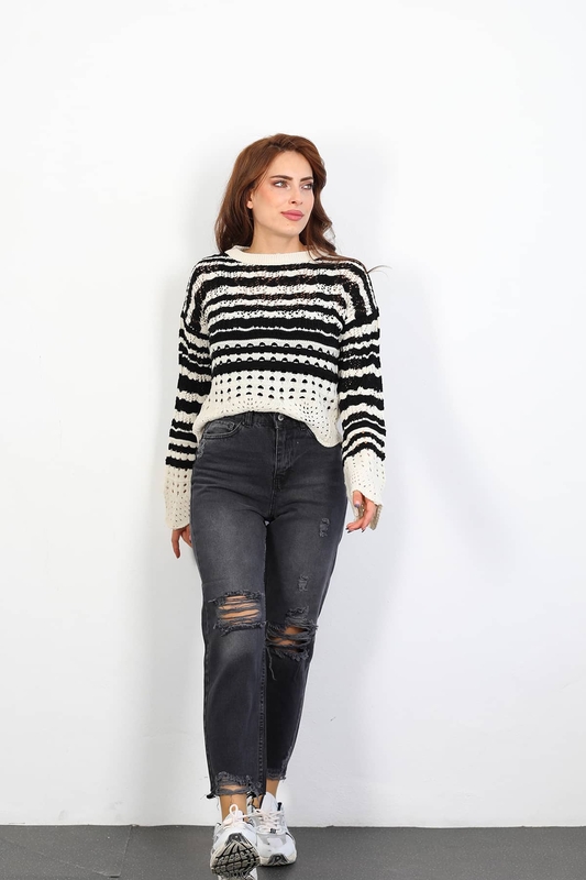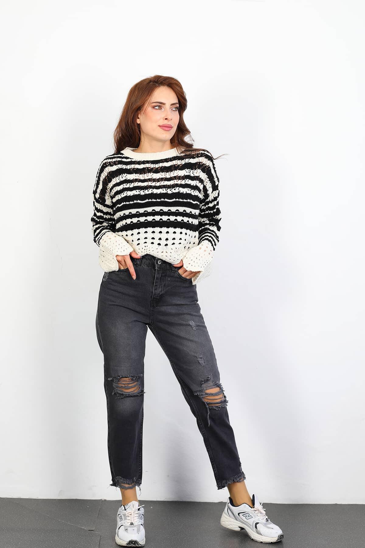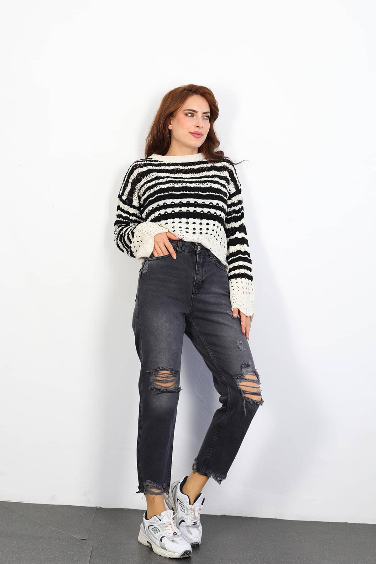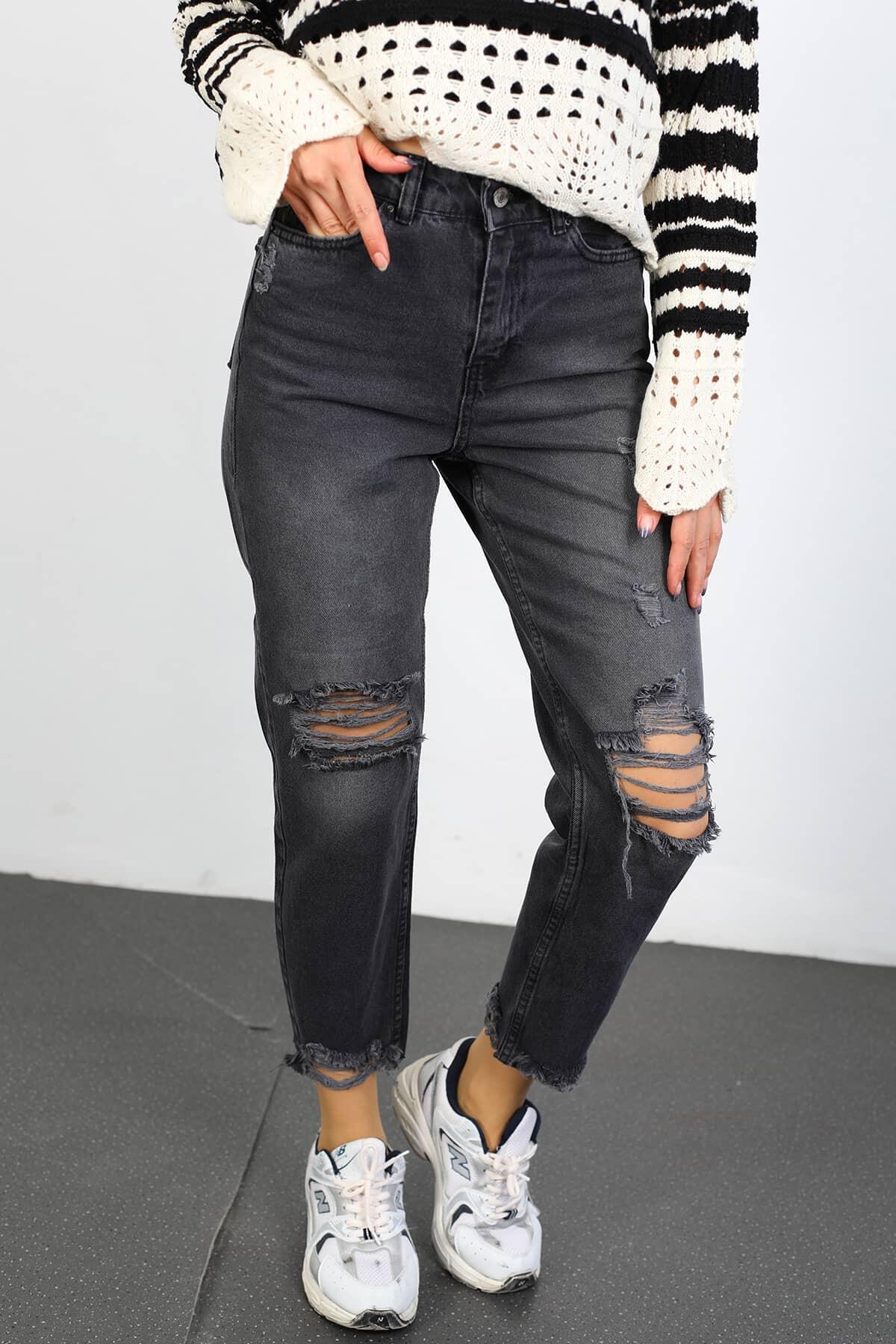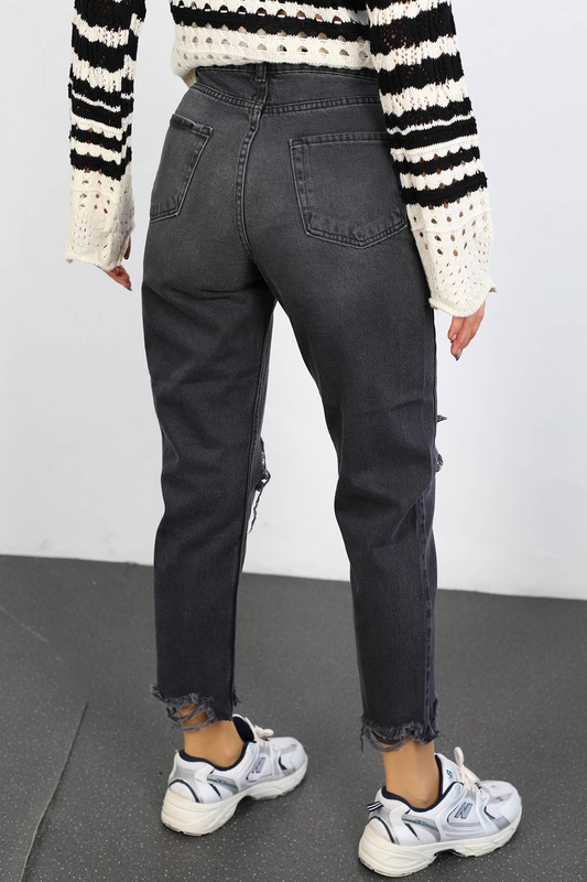Paça Kesik Lazer Kesim Yırtık Fume Kadın Mom Jean, sokak modasını yansıtan şık ve rahat bir parça. Fume rengi ve mom jean kesimi, her bedene uyum sağlar ve rahat bir kullanım sunar. Lazer kesim detayları ve paça kesik yırtıklar, pantolona dinamik bir hava katarken, modern bir görünüm yaratır.