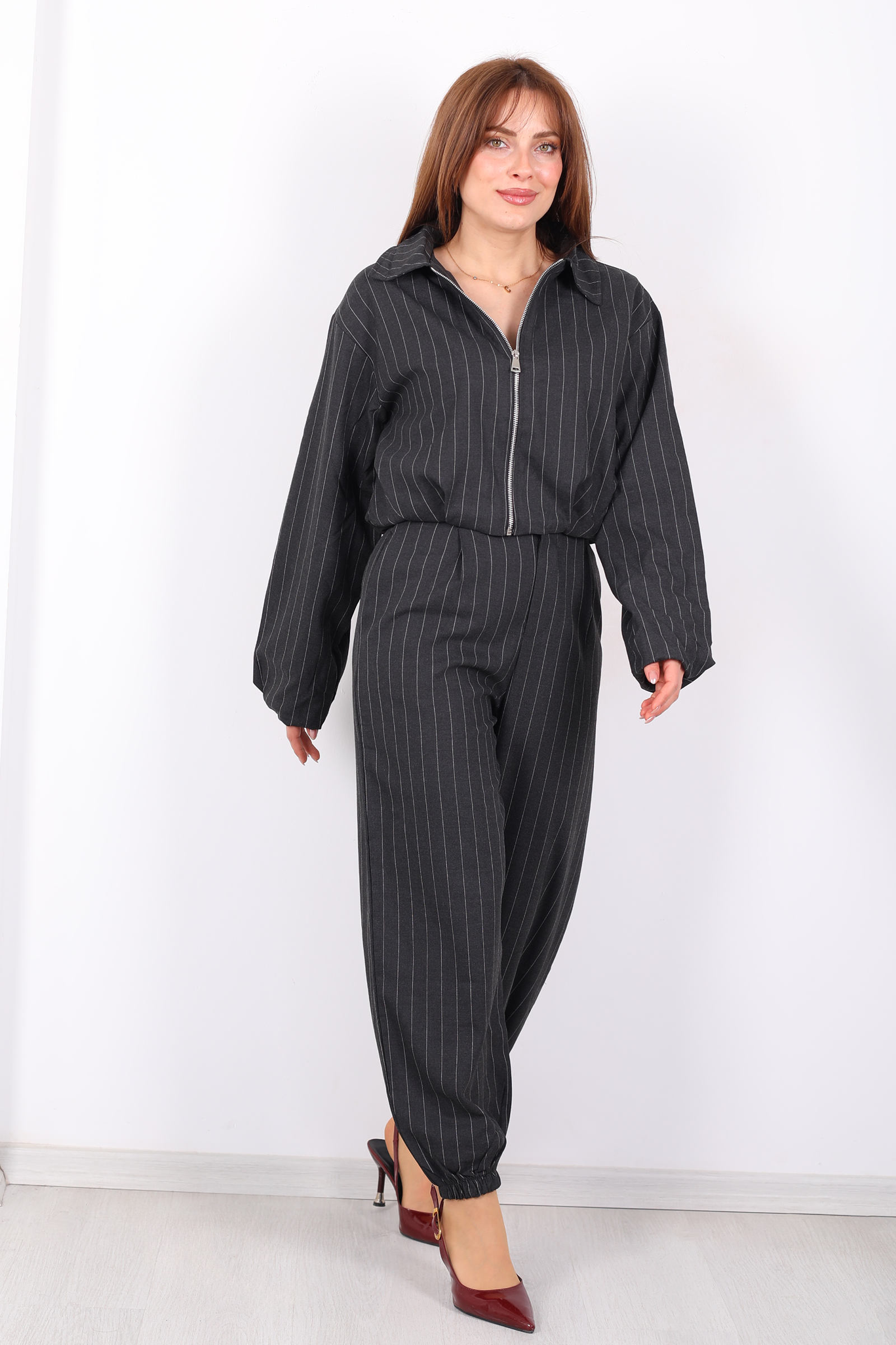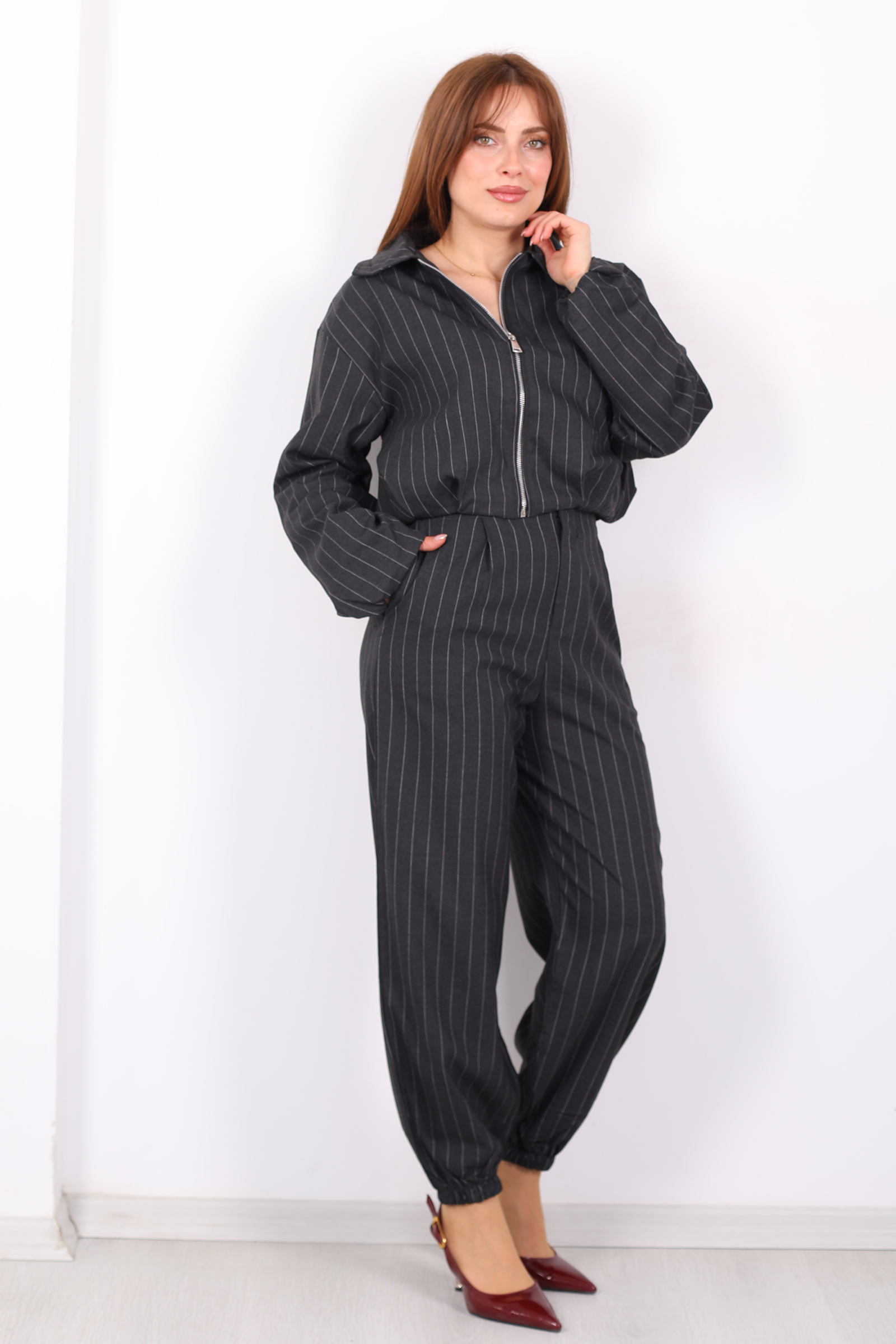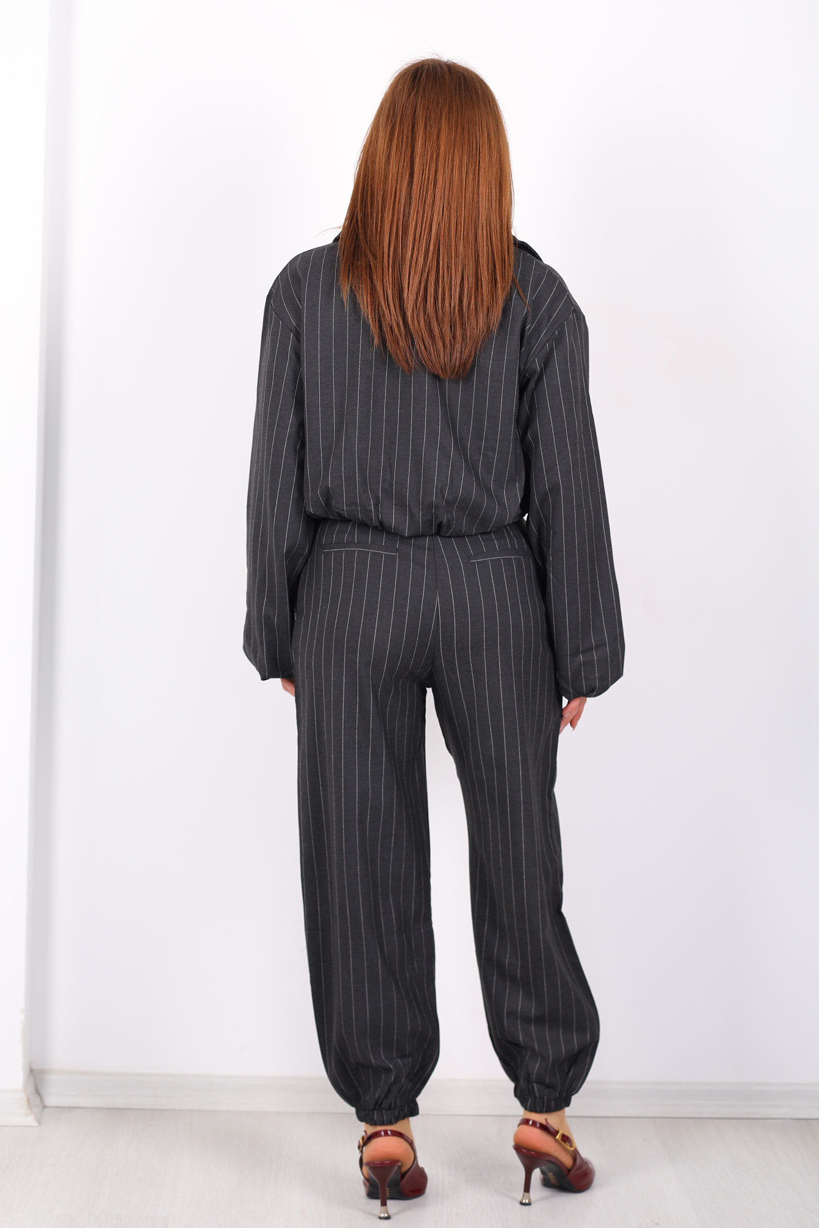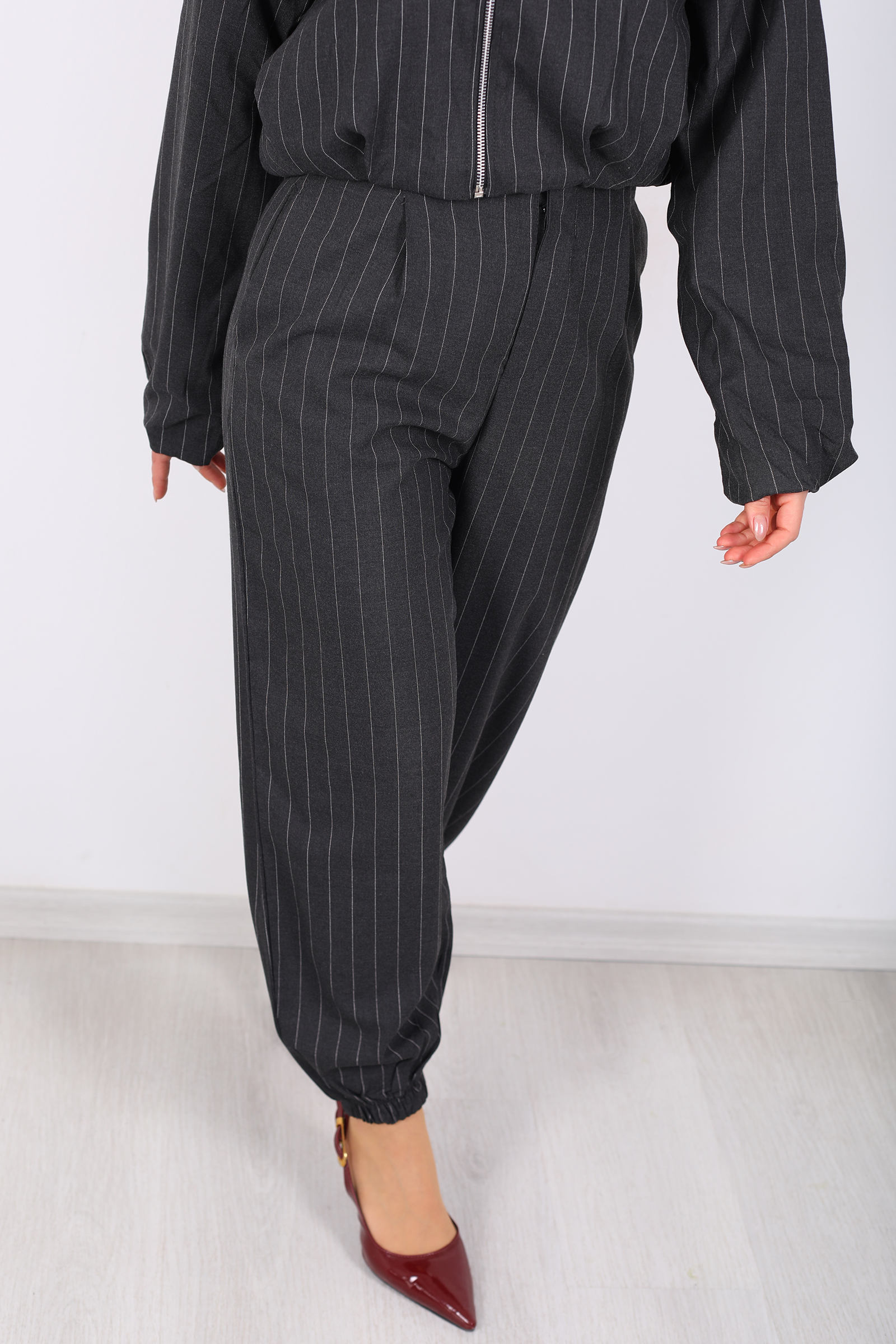 Bu antrasit tonlu şalvar pantolon, çizgili dokusu ve paça lastikli yapısıyla rahatlığı şıklıkla bütünleştiriyor. Beli esnek lastik detayı sayesinde gün boyu konfor sağlayan tasarım, hareket özgürlüğünü artırırken modern çizgiyi öne çıkarır. Çizgili deseni, minimal ve nötr renk paletiyle birleşerek her türlü üst parçayla uyum sağlar; basic tişörtlerden blazer ceketlere kadar çok çeşitli kombinlere kolayca adapte olur. Salaş kesimiyle casual şehir stiline, zarif bluz ve topuklularla daha şık akşam kombinlerine de uyumlu bir duruş sunar. Bu pantolon, gardırobunuzda hem rahat hem trend bir temel parça olacak şekilde tasarlanmıştır.