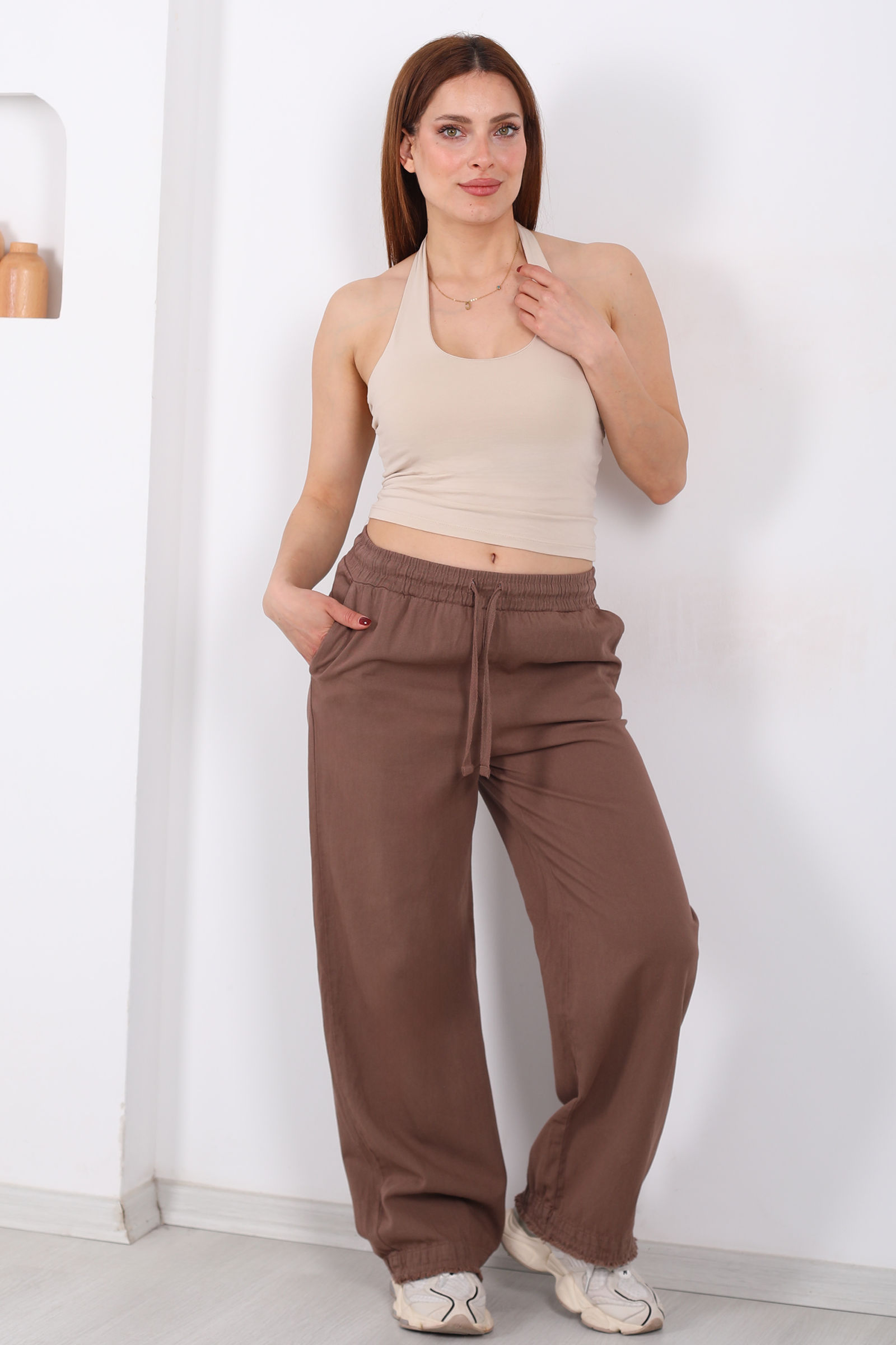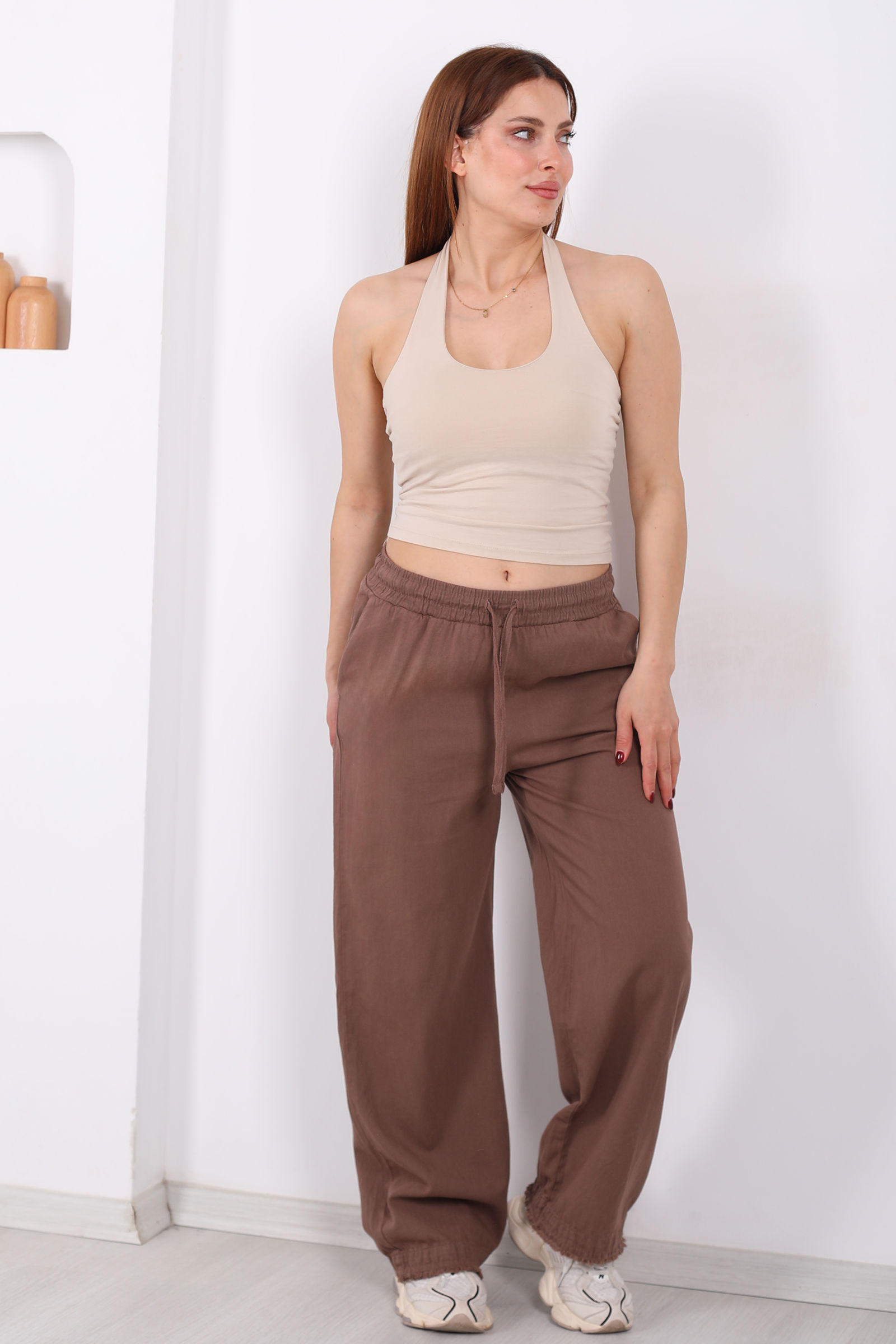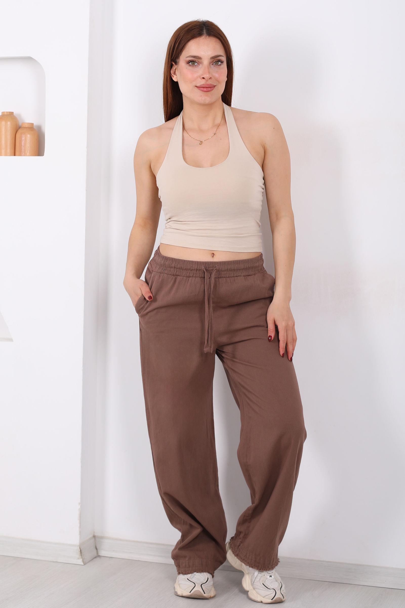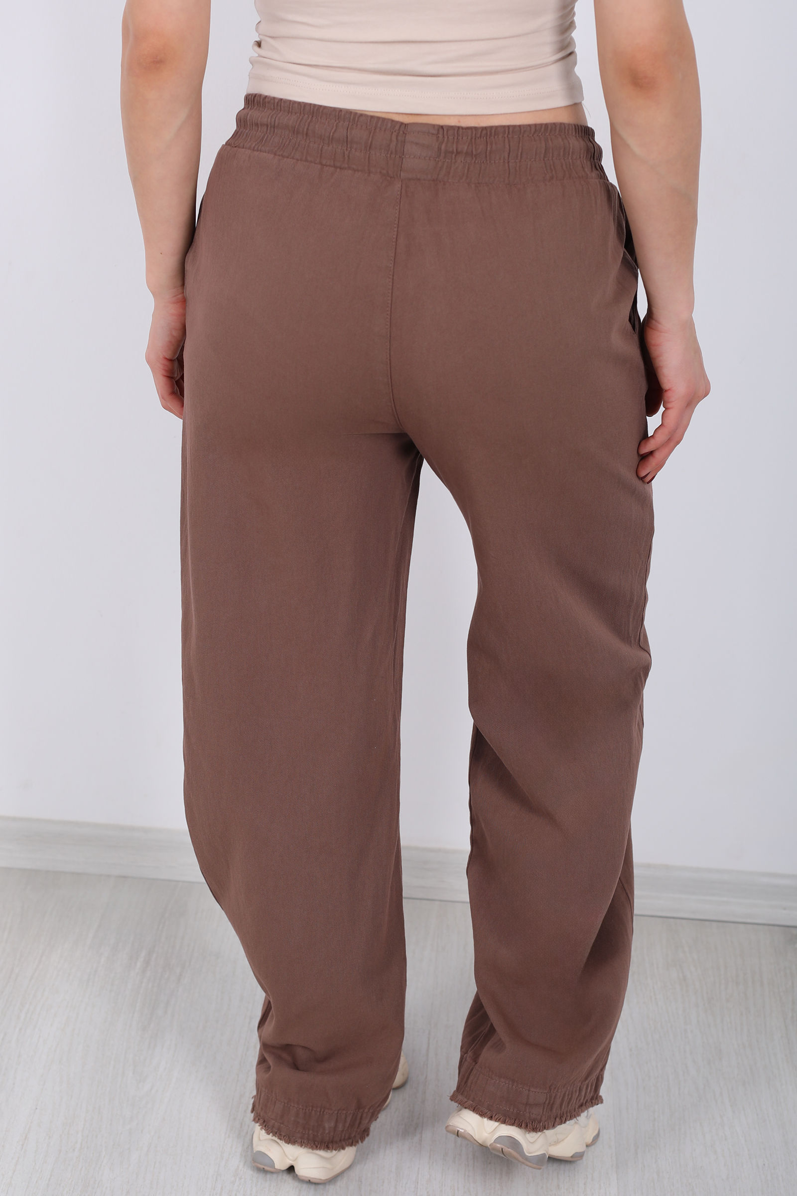 Doğal liflerin sıcaklığını taşıyan bu kahverengi keten pantolon, bohem dokunuşlarıyla stilinizde fark yaratır. Keten kumaşın gözenekli yapısı sayesinde yaz aylarında bile serin ve ferah hissettirirken, paça uçlarındaki püskül detaylar modele eşsiz bir karakter kazandırır.