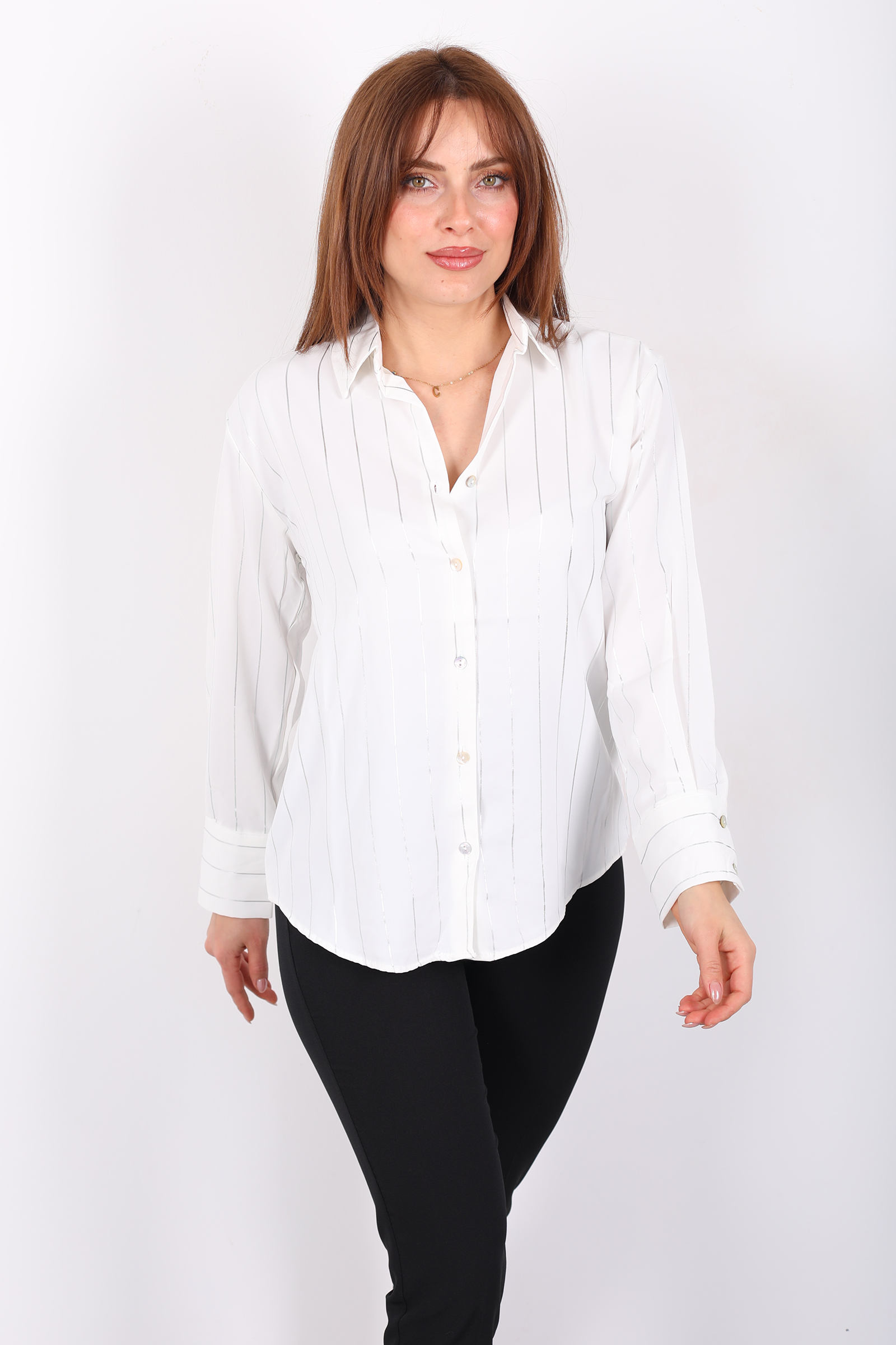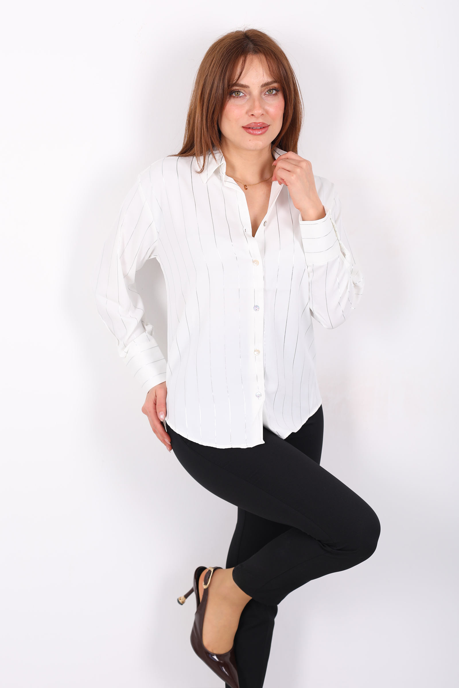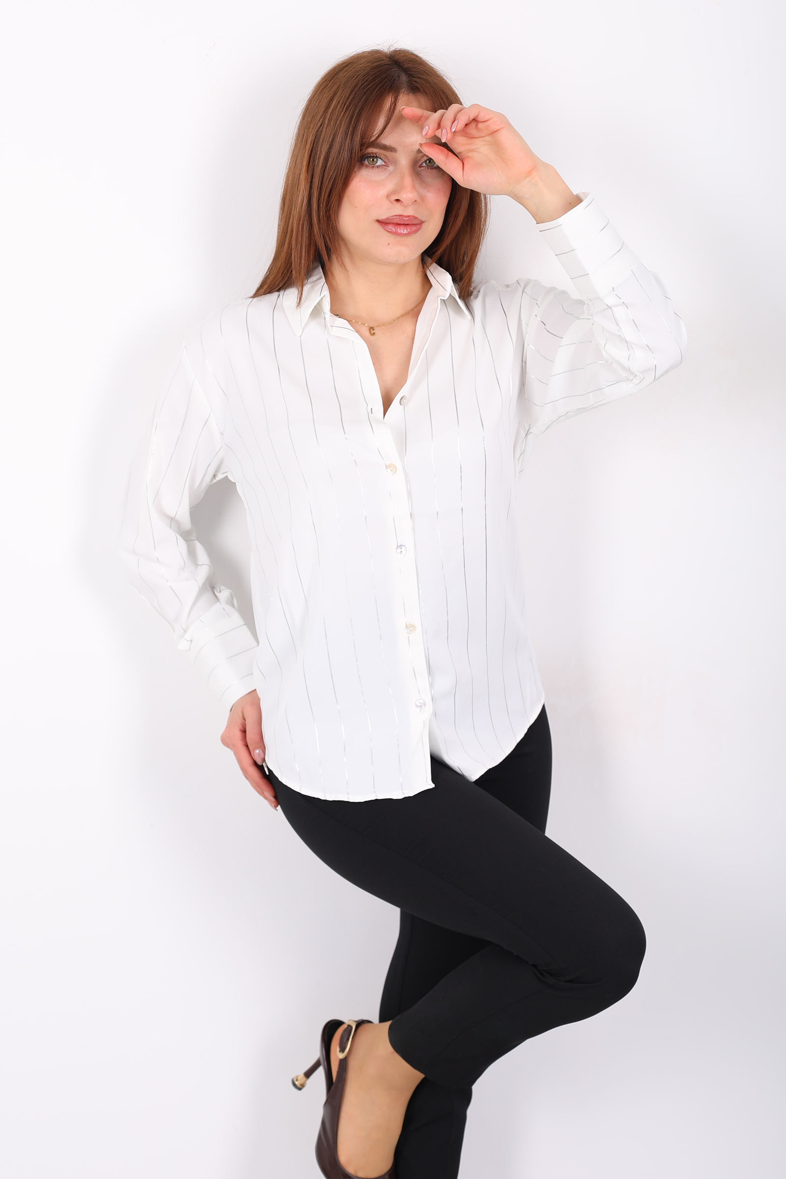 Bu ekru saten gömlek, parlak çizgili dokusuyla klasik gömlek modelini zarif ve modern bir havaya dönüştürüyor. Saten kumaşın yumuşak parlaklığı, gömleğe yüksek bir stil kazandırırken, çizgili deseni görünümünüze ritmik bir karakter ekler. Gömlek yaka ve düğmeli kapama gibi geleneksel detaylar, parçayı hem ofis hem de şık günlük kombinlere uygun hale getirir. Hafif dökümlü yapısı sayesinde üst beden çevresinde zarif bir akış sağlar; jean, kumaş pantolon veya eteklerle farklı stiller yaratmanızı kolaylaştırır. Bu gömlek, nötr ekru tonu ve parlak yüzeyiyle gardırobunuzun hem temel hem de özel an kombinlerinin yıldızı olacak çok yönlü parça.