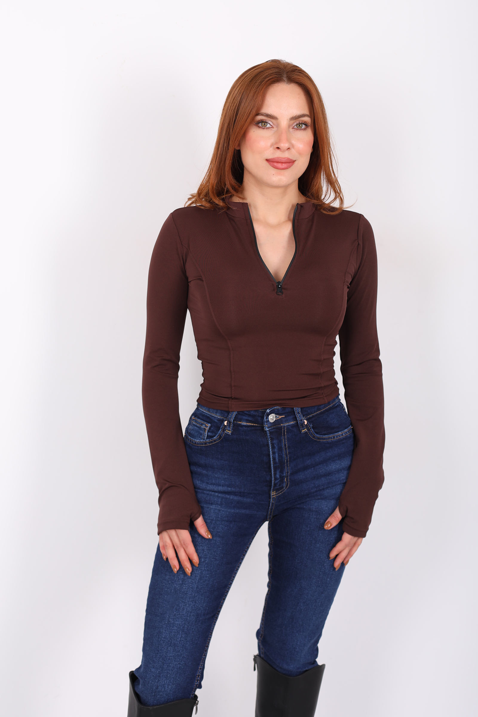 Parmak Geçirmeli Yarım Fermuarlı Kahverengi Kadın Slim Bluz