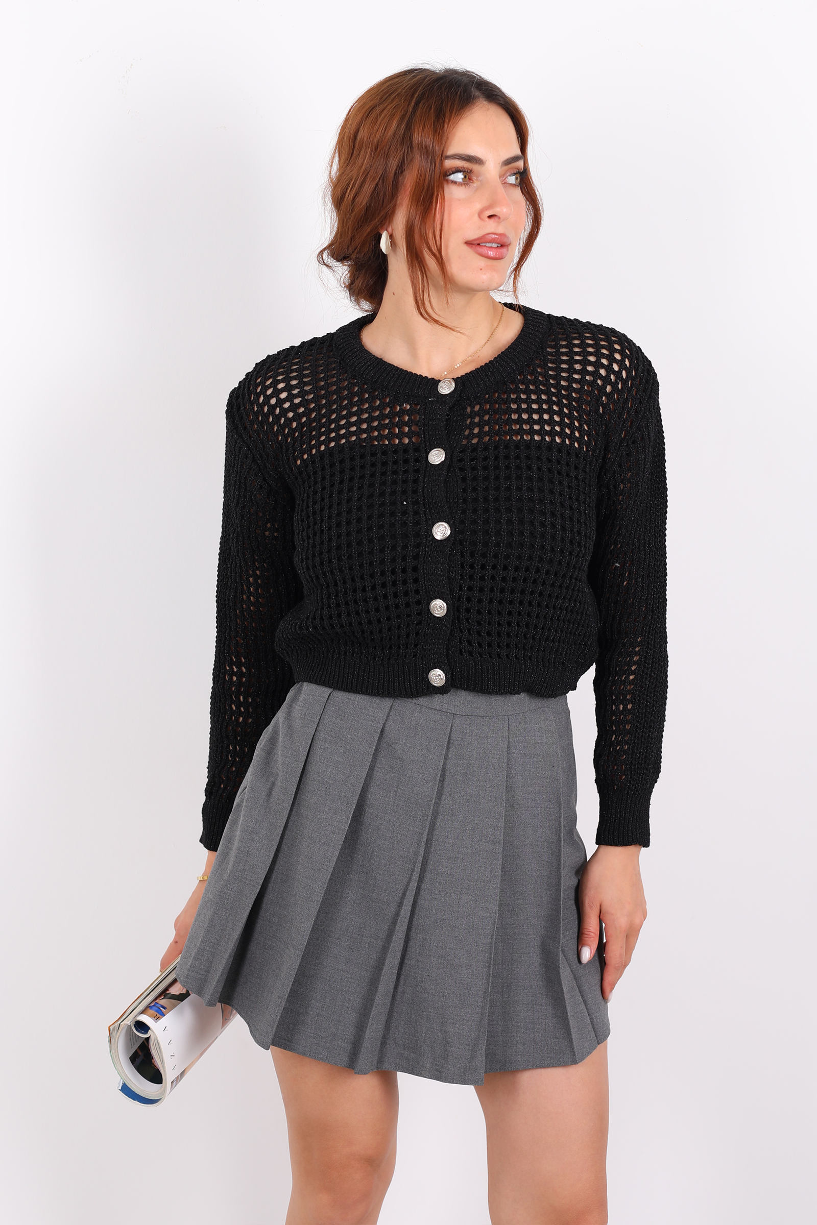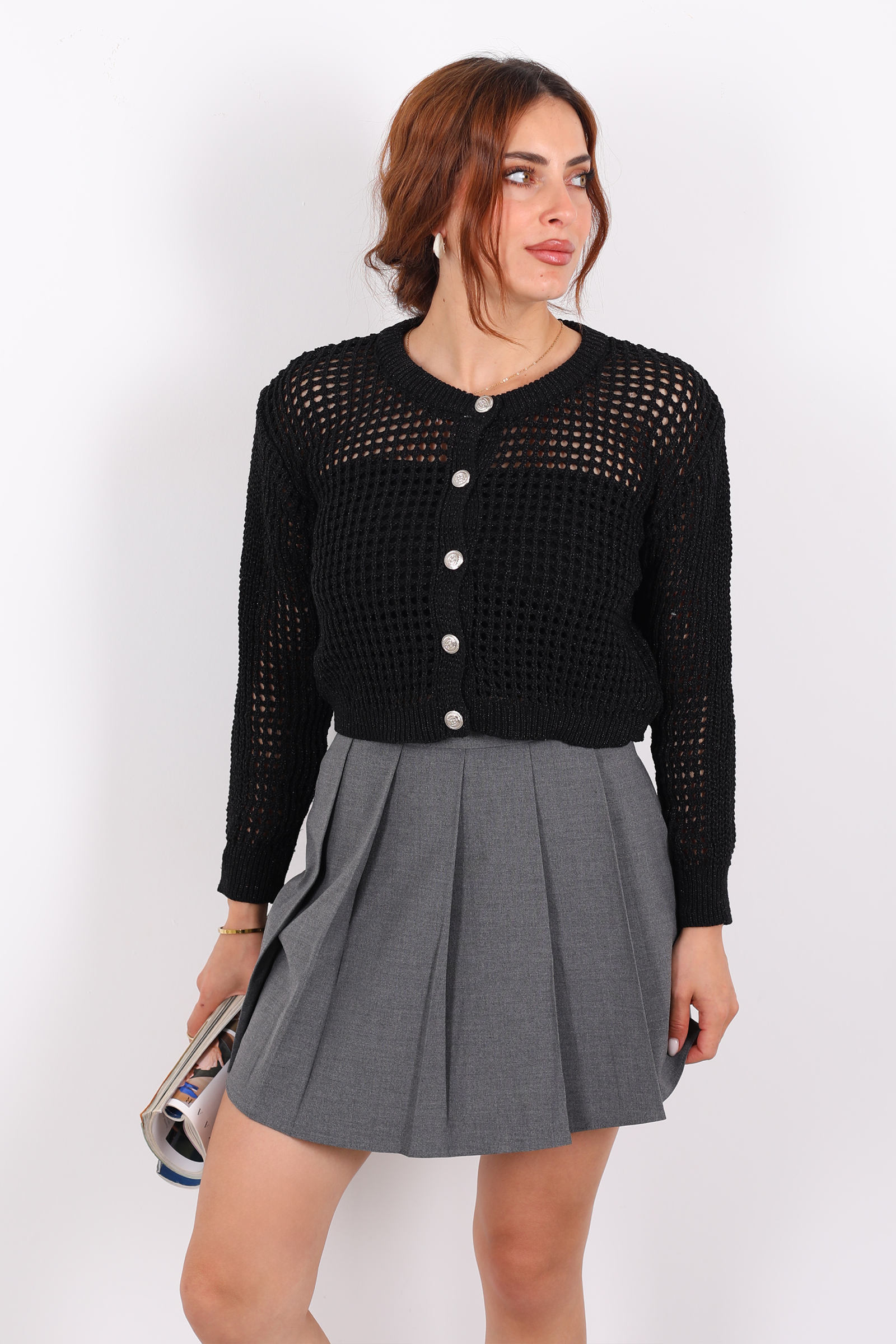 Antrasit rengindeki bu pileli mini şort etek, zarif fiyonk bağcık detayıyla feminen bir dokunuş sunuyor. Ön kısmındaki pileli tasarım, hareket özgürlüğü sağlarken şıklığınızı da ön plana çıkarır. Kısa boyu ve normal kalıbıyla sıcak havalarda rahat bir kullanım sunar. %100 yerli üretim olan bu etek, Türkiye'de özenle tasarlanıp üretilmiştir.