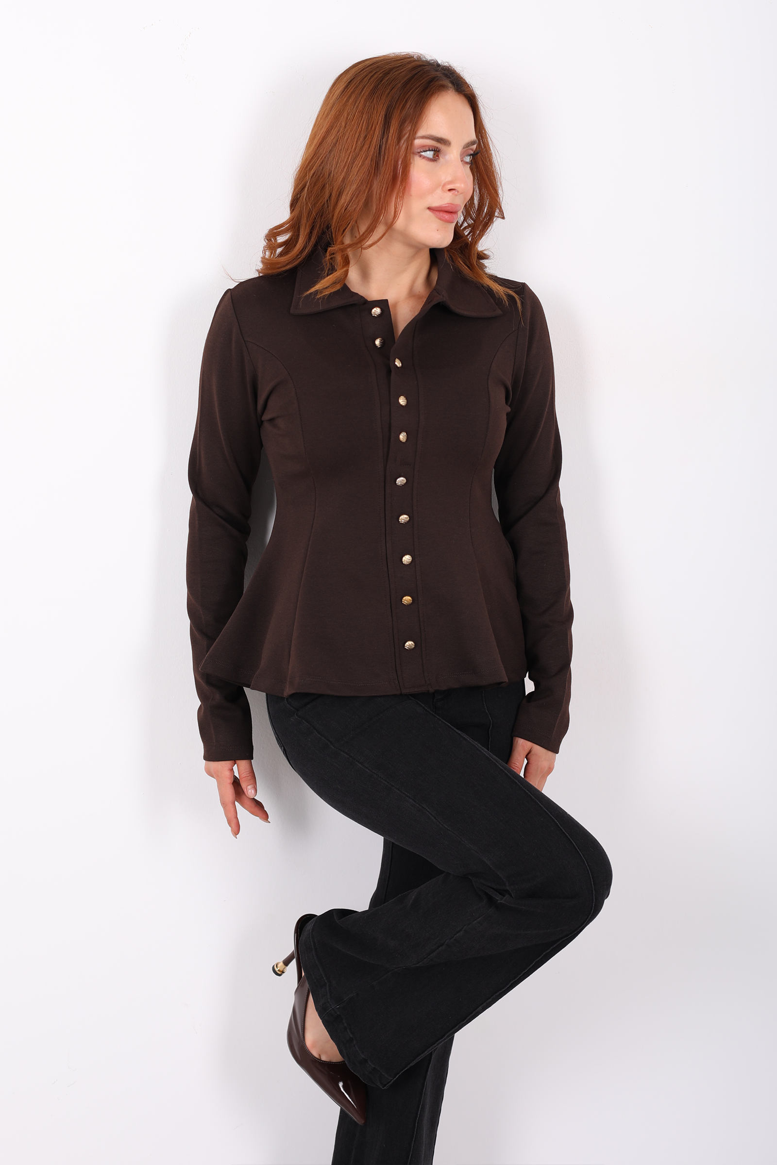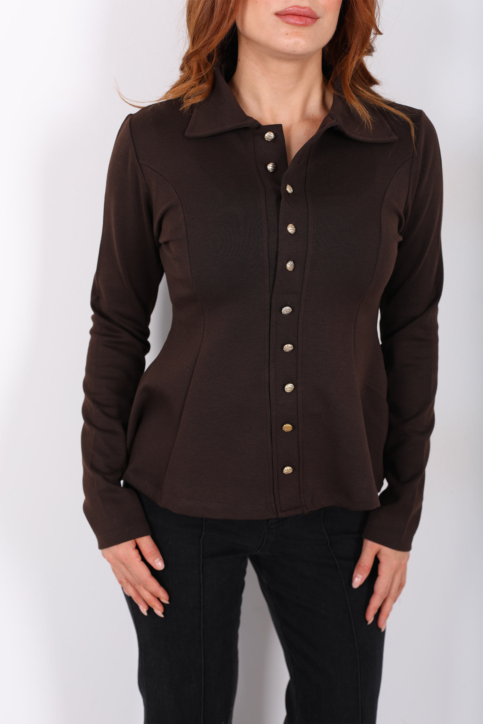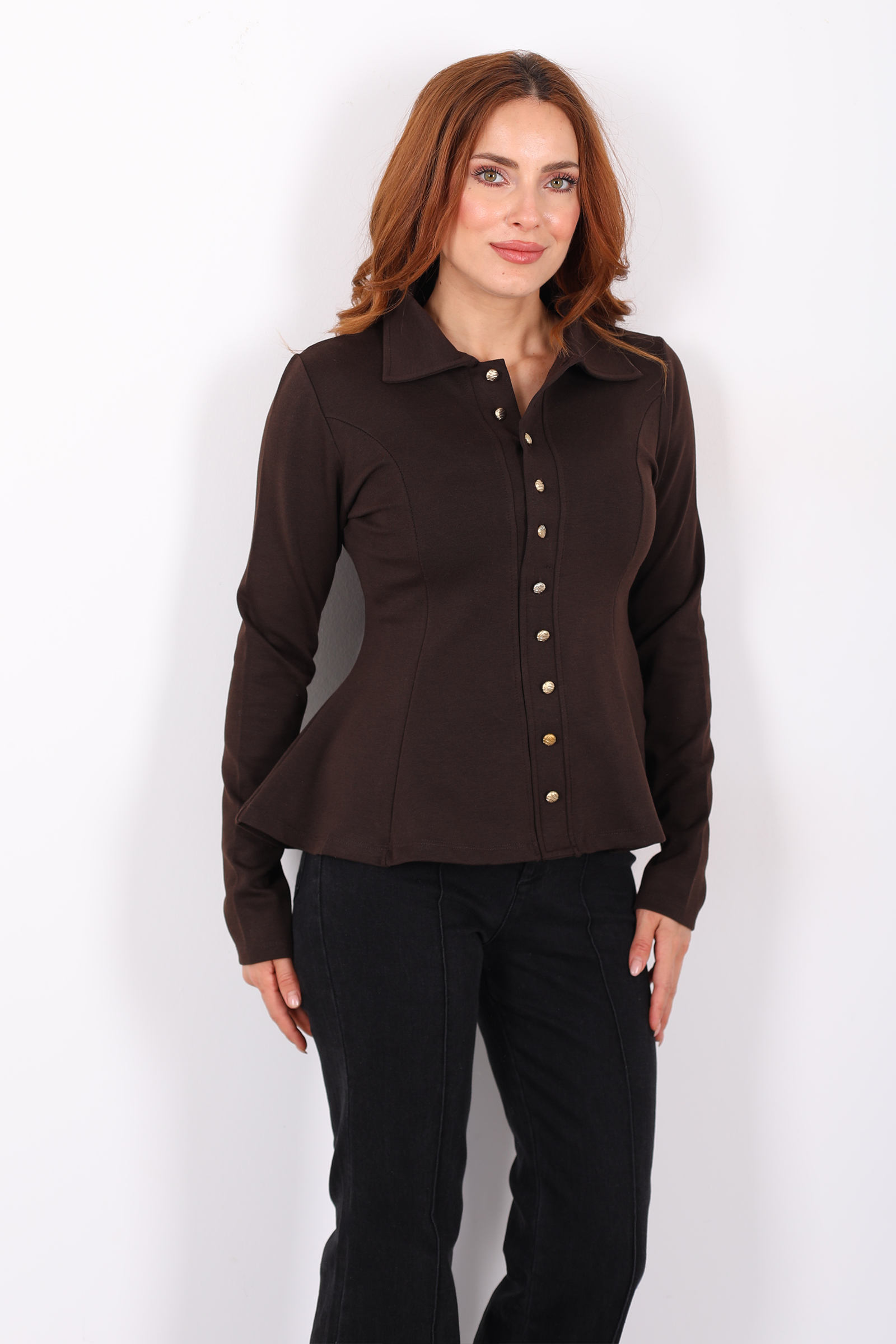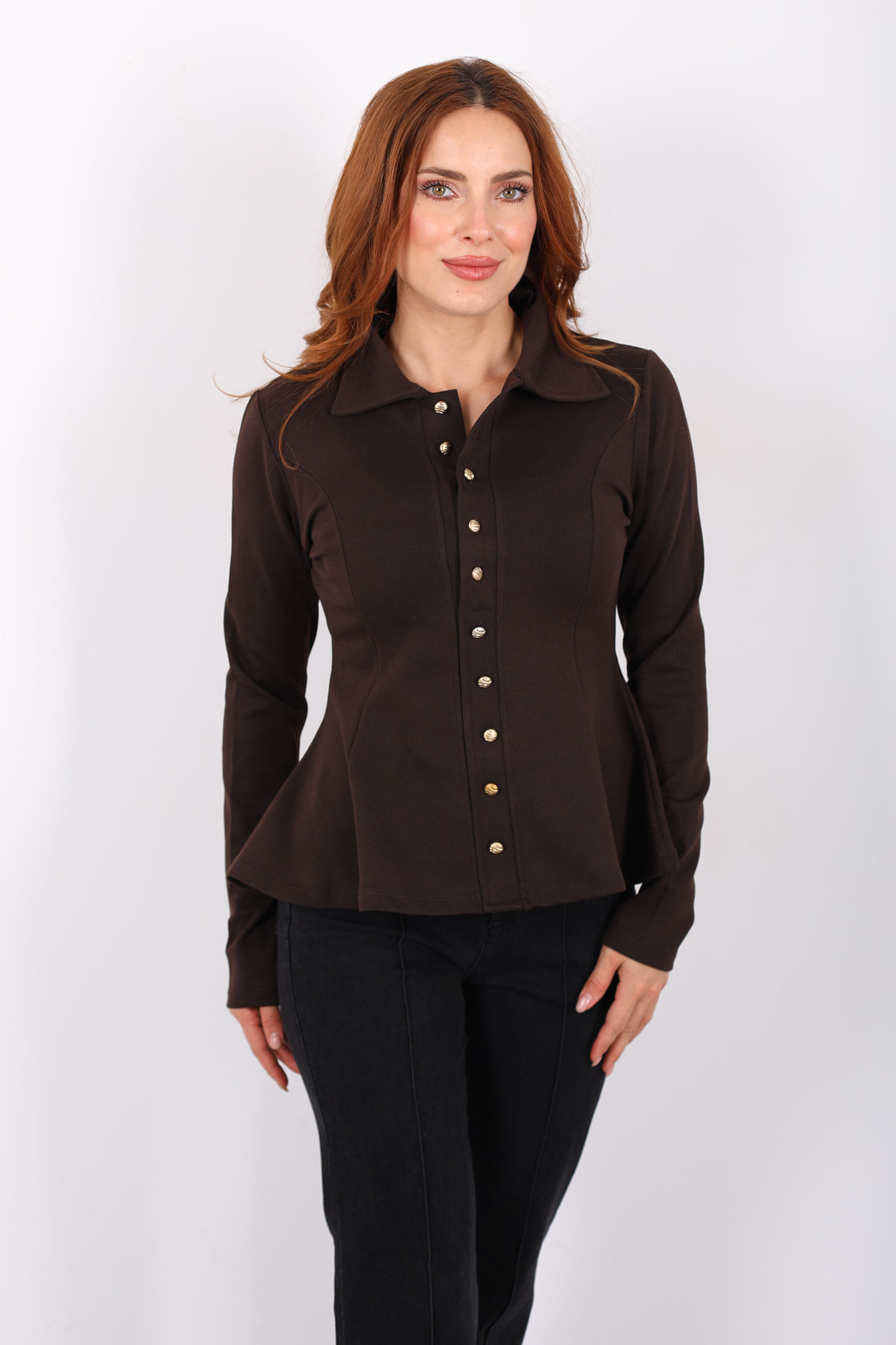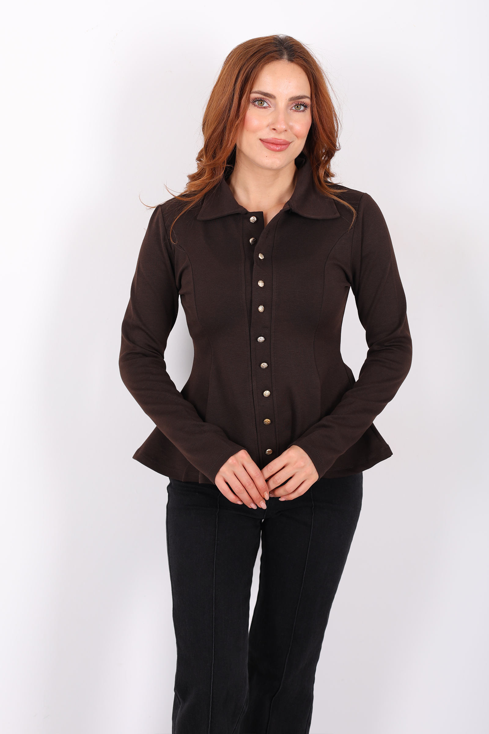 Polo Yaka Düğmeli Acı Kahve Kadın Volan Bluz