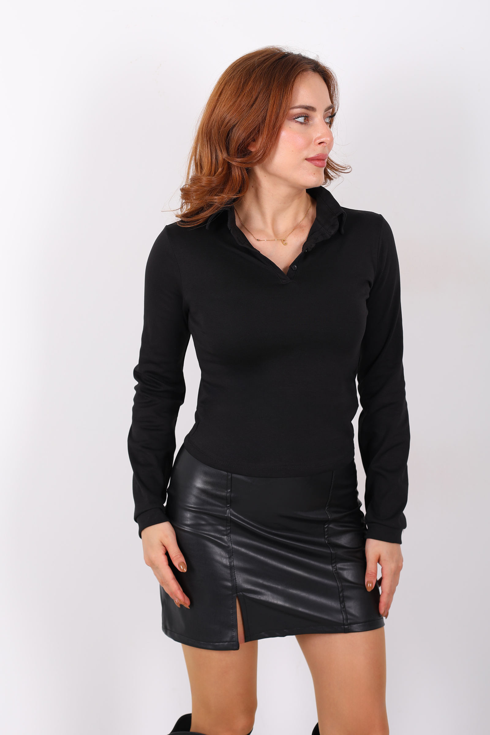 Polo Yaka Düğmeli Siyah Kadın Bluz