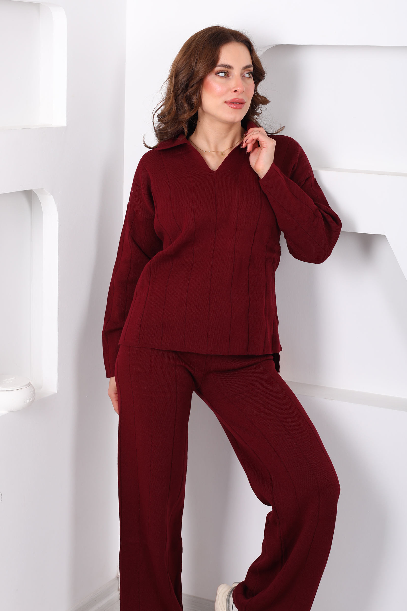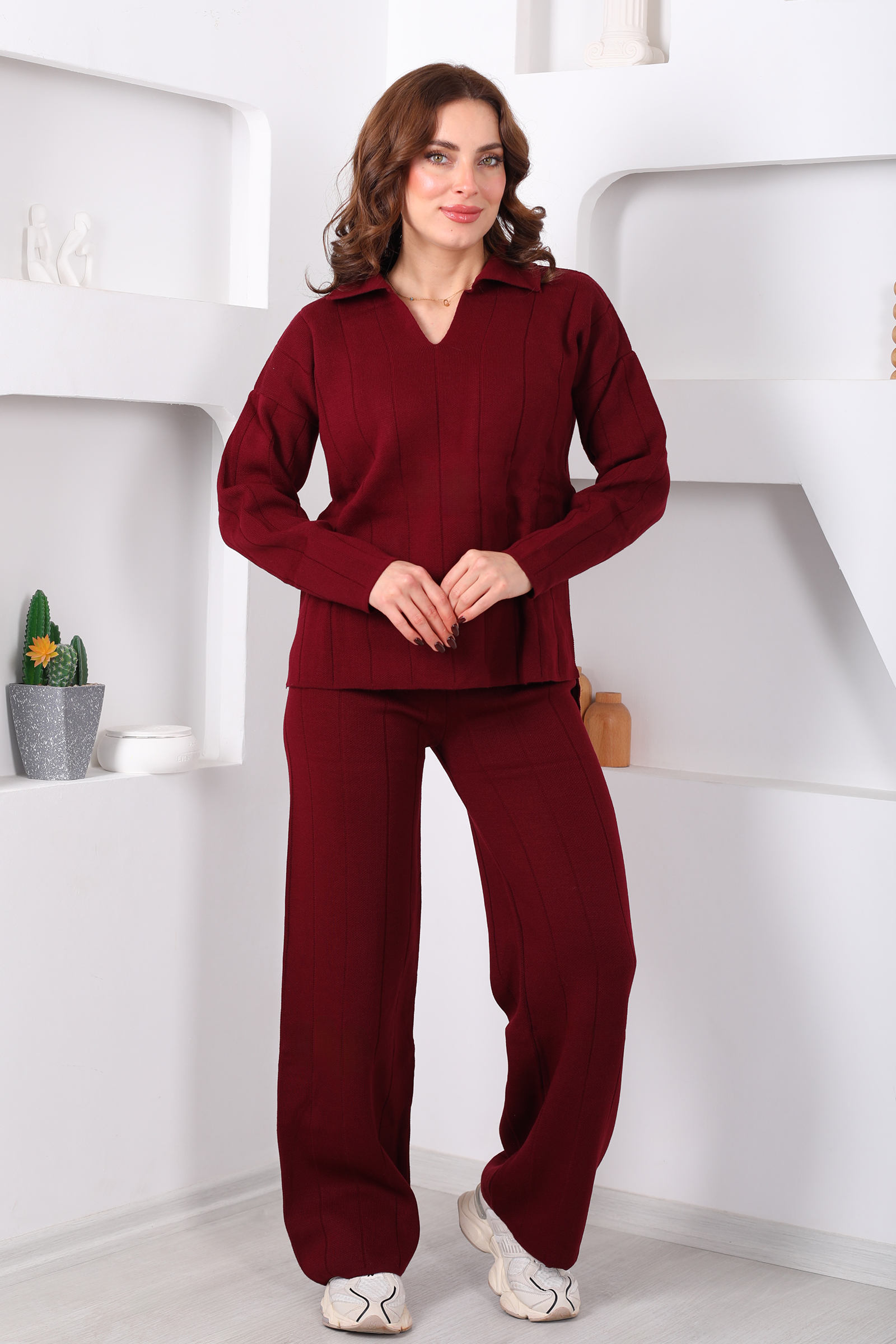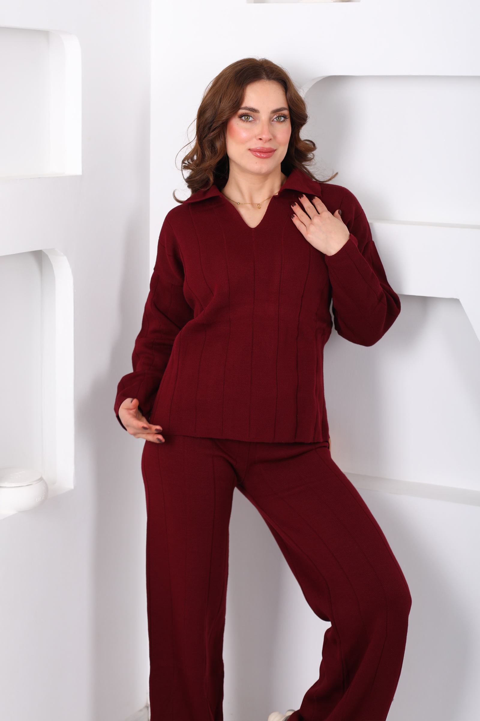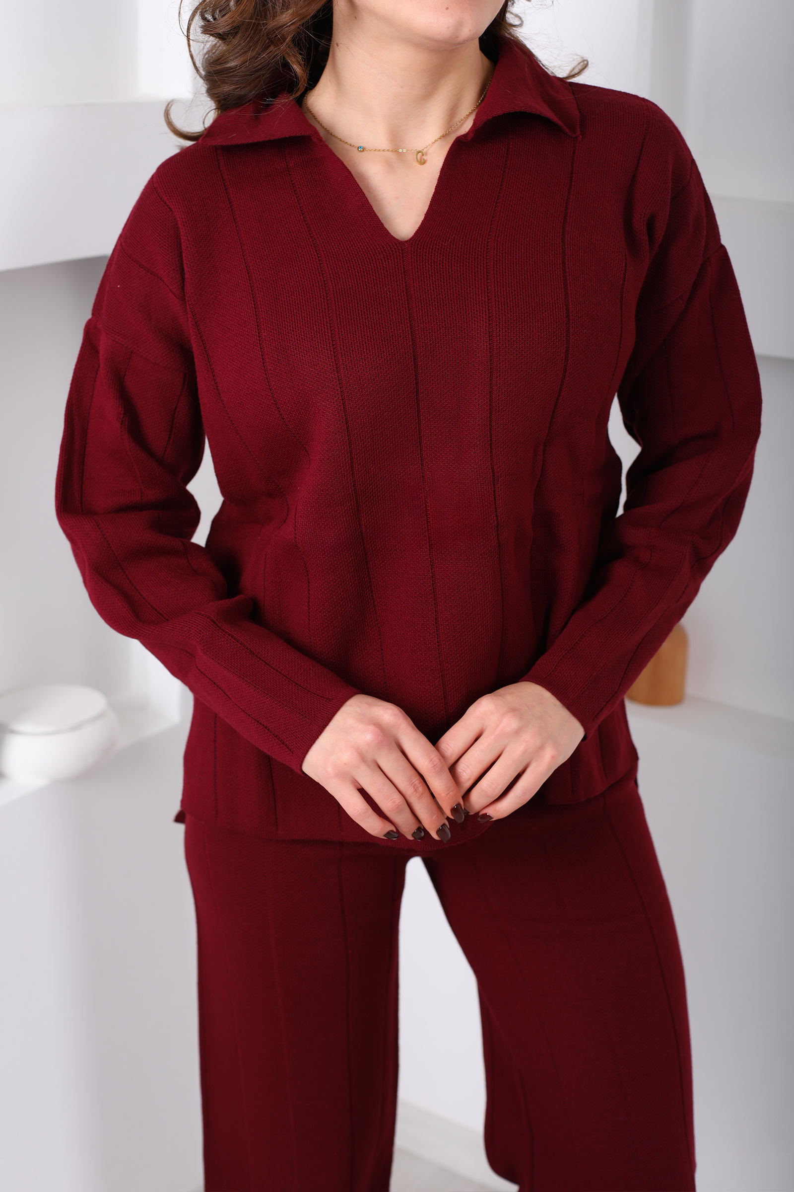 Polo Yaka Fitilli Bordo Kadın Triko Takım