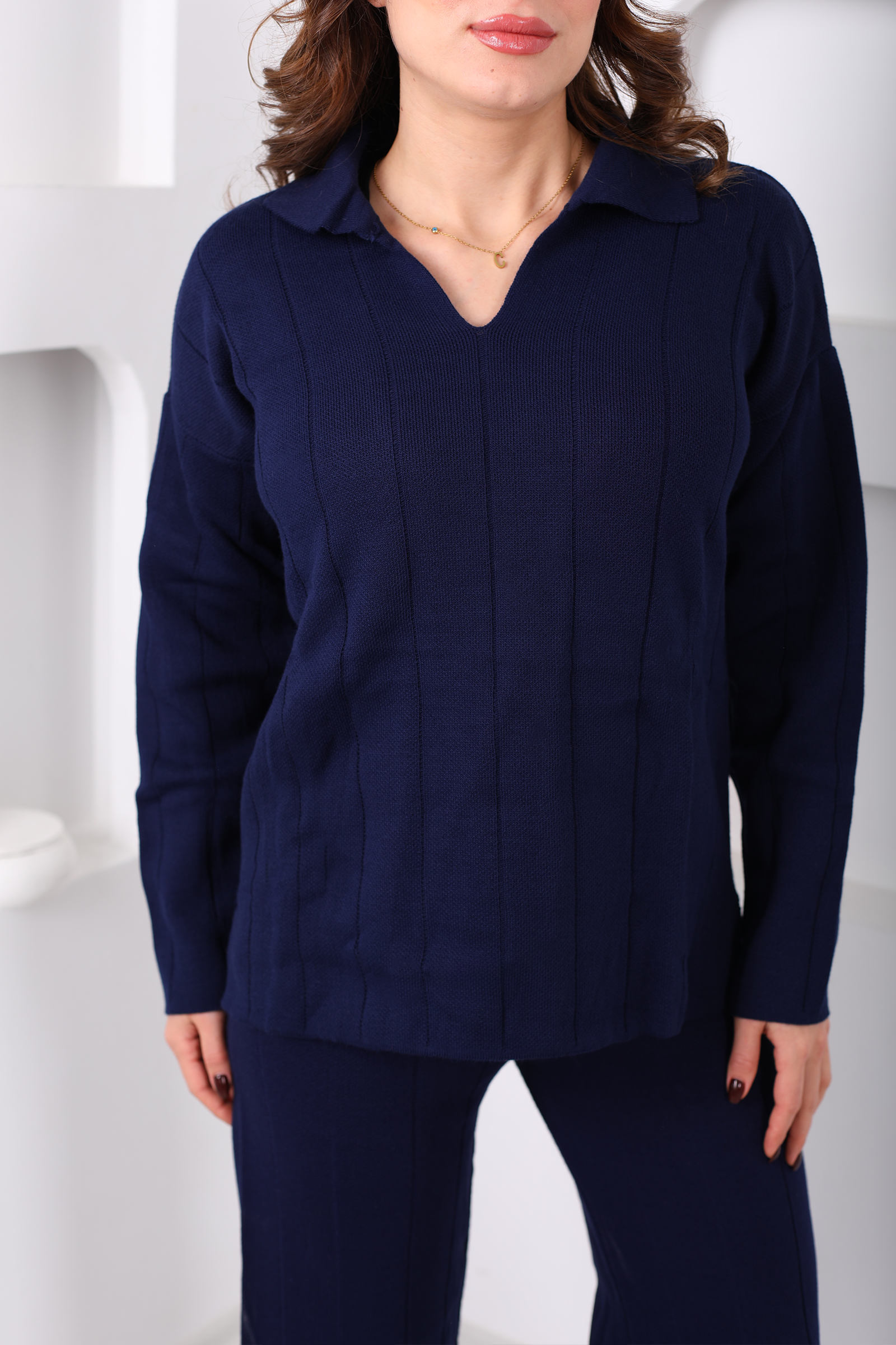 Polo Yaka Fitilli Lacivert Kadın Triko Takım