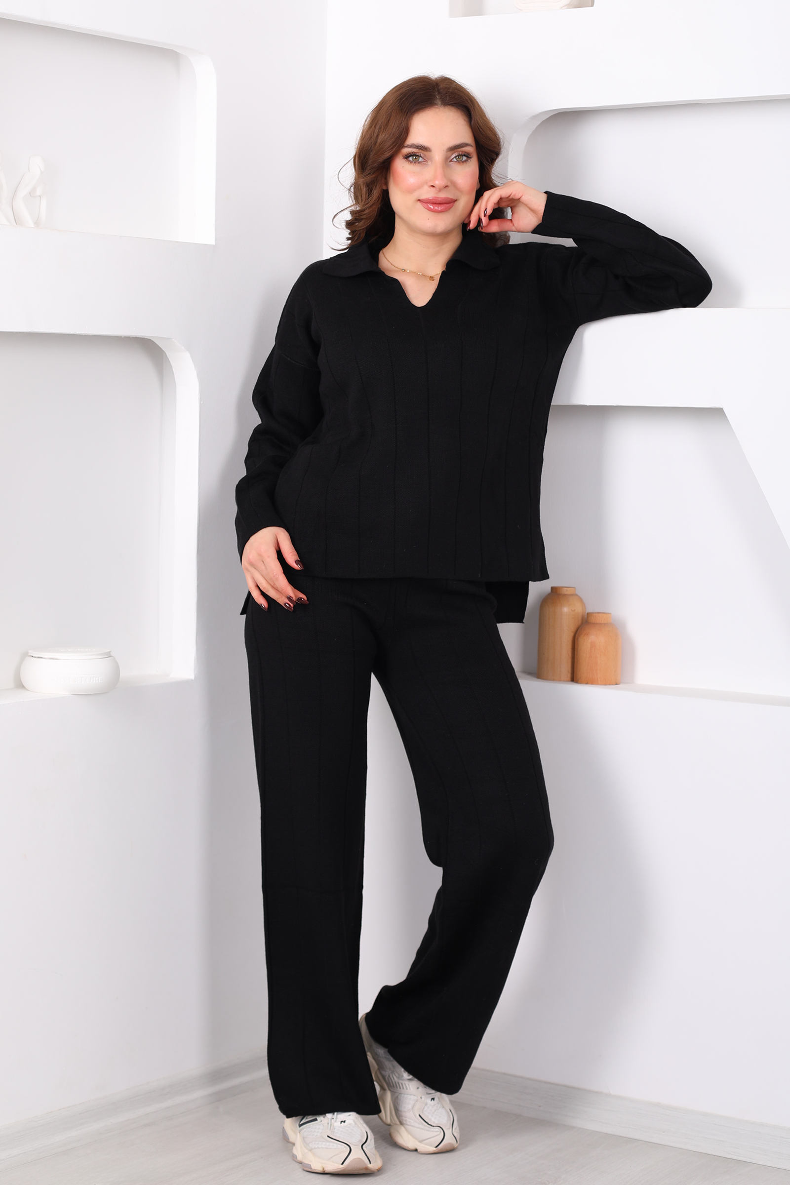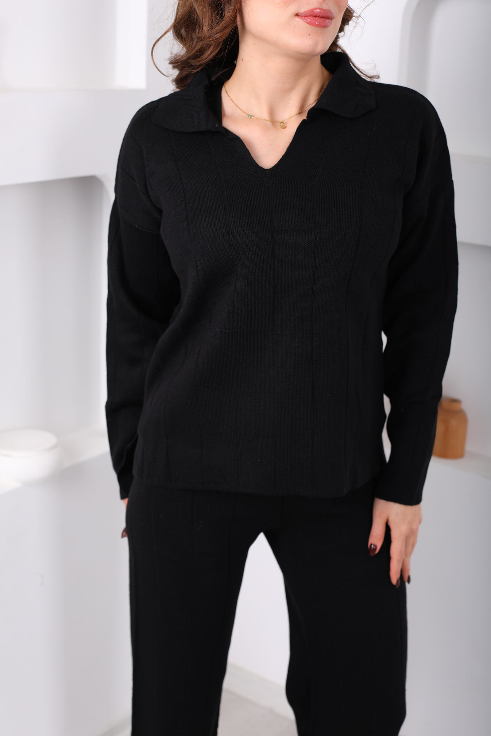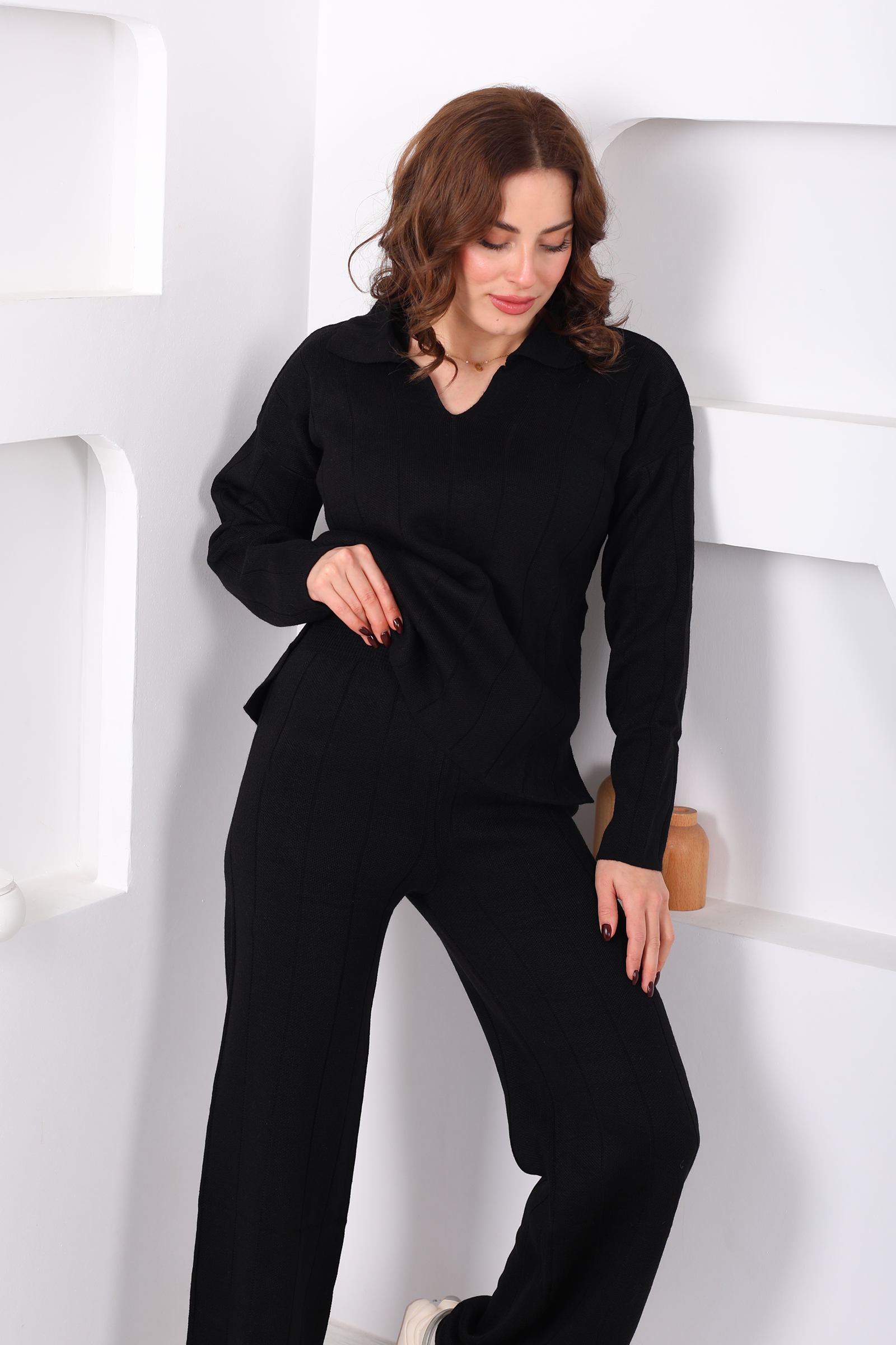 Polo Yaka Fitilli Siyah Kadın Triko Takım