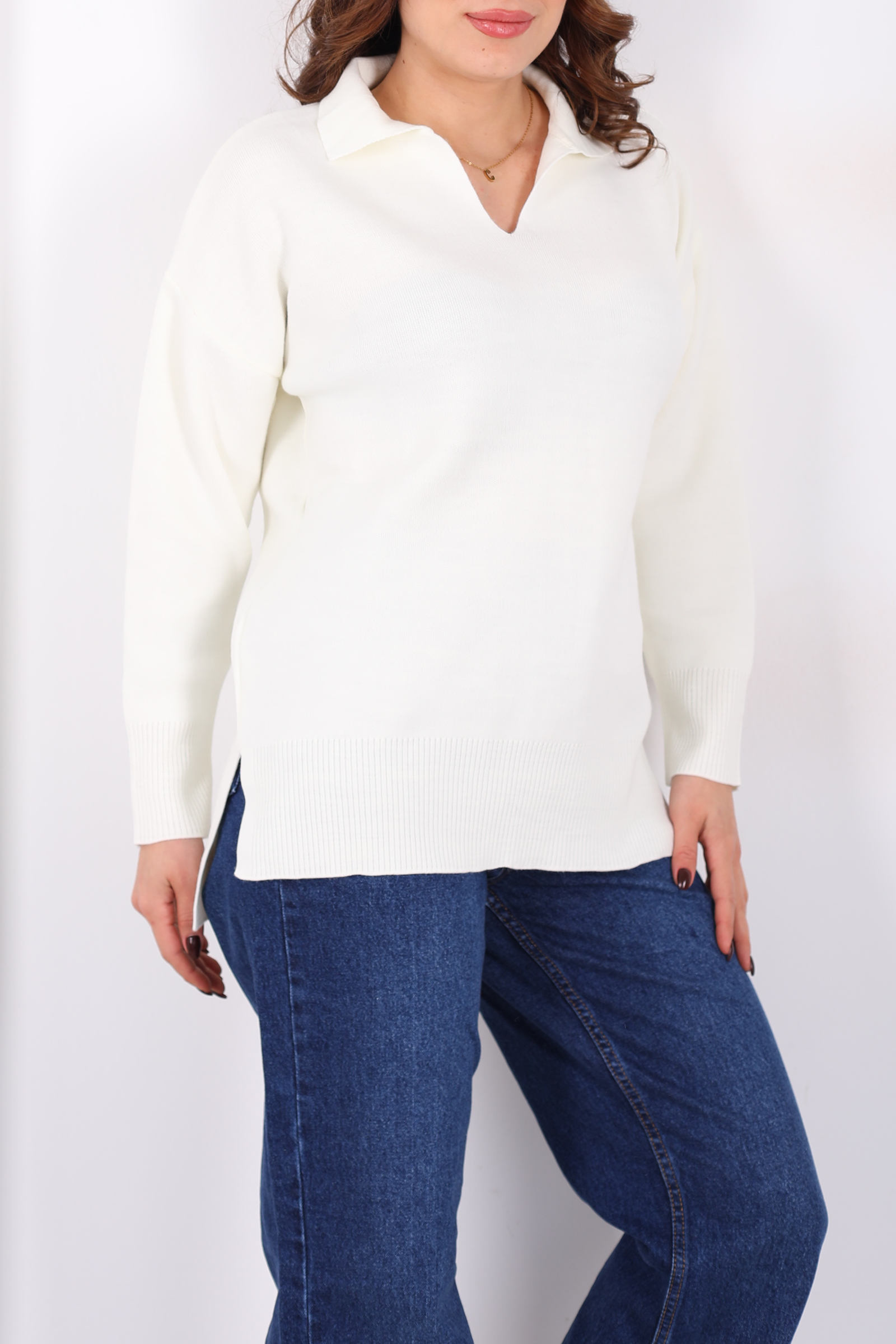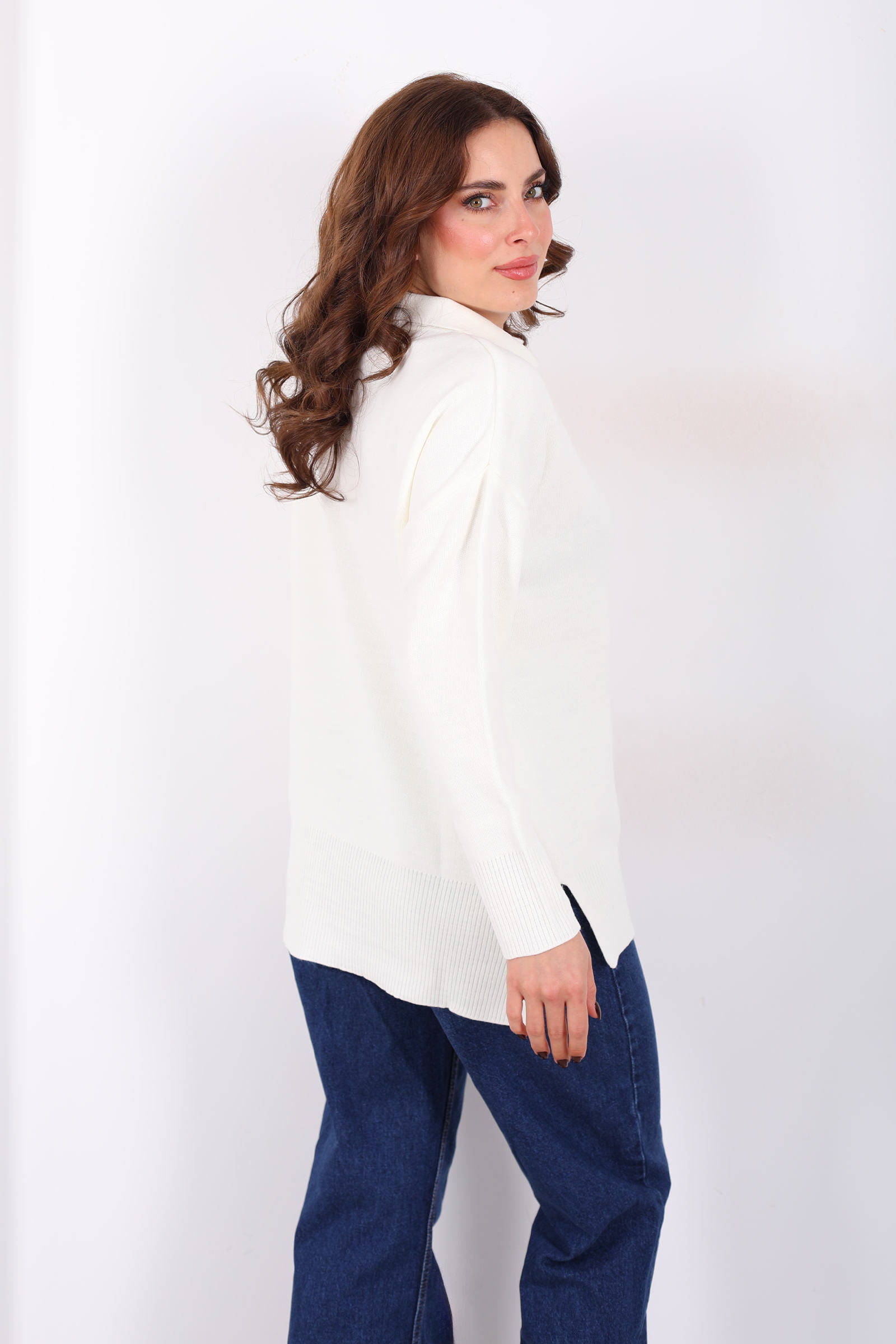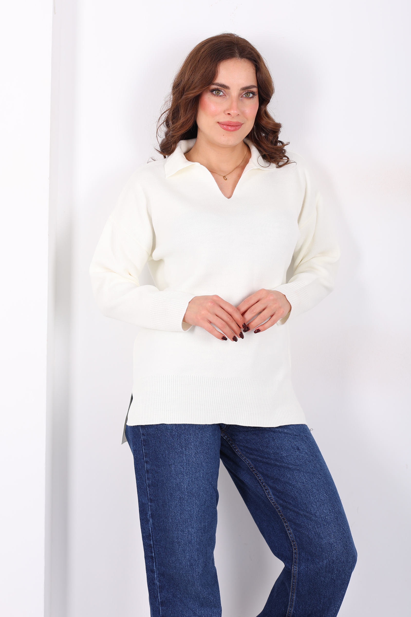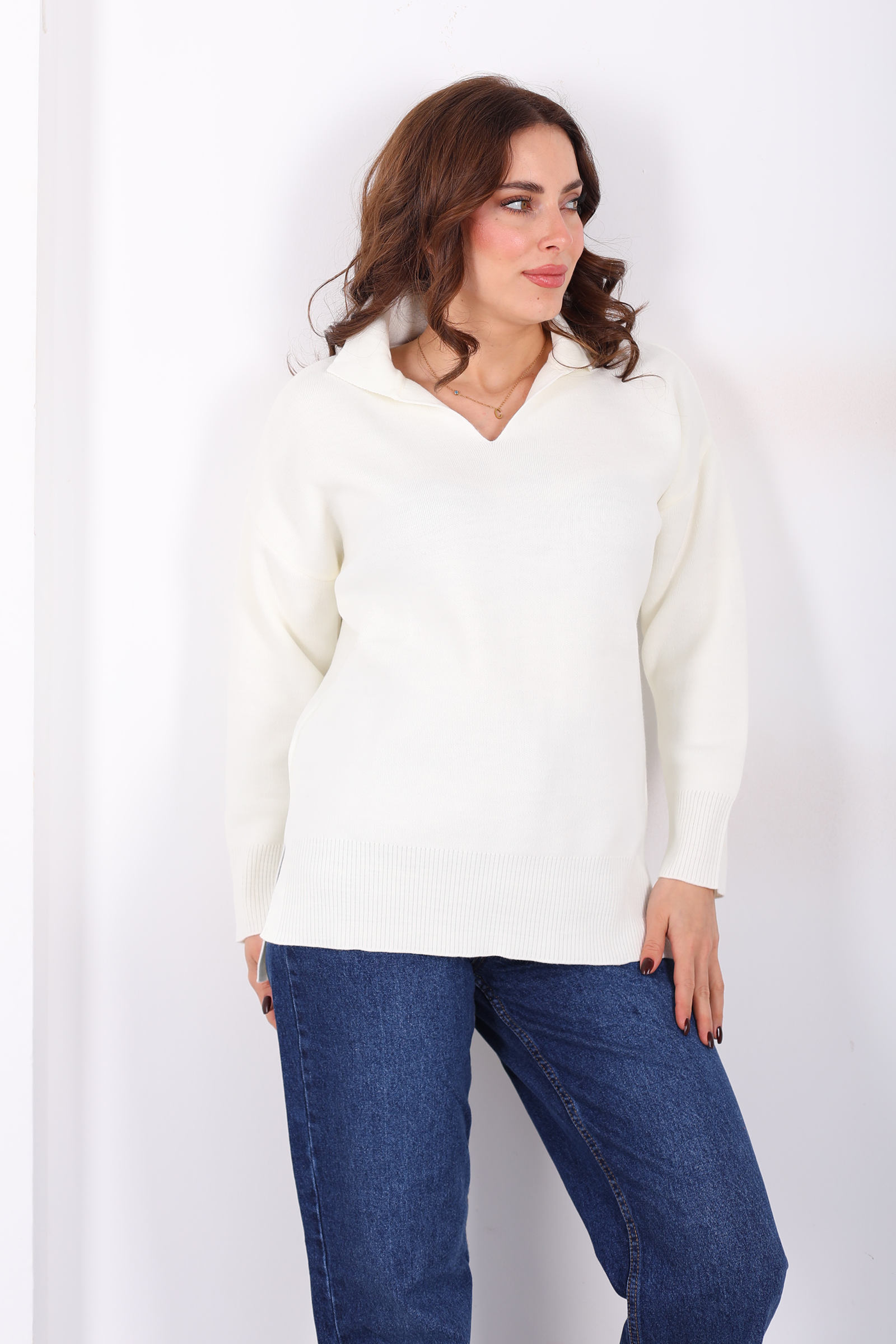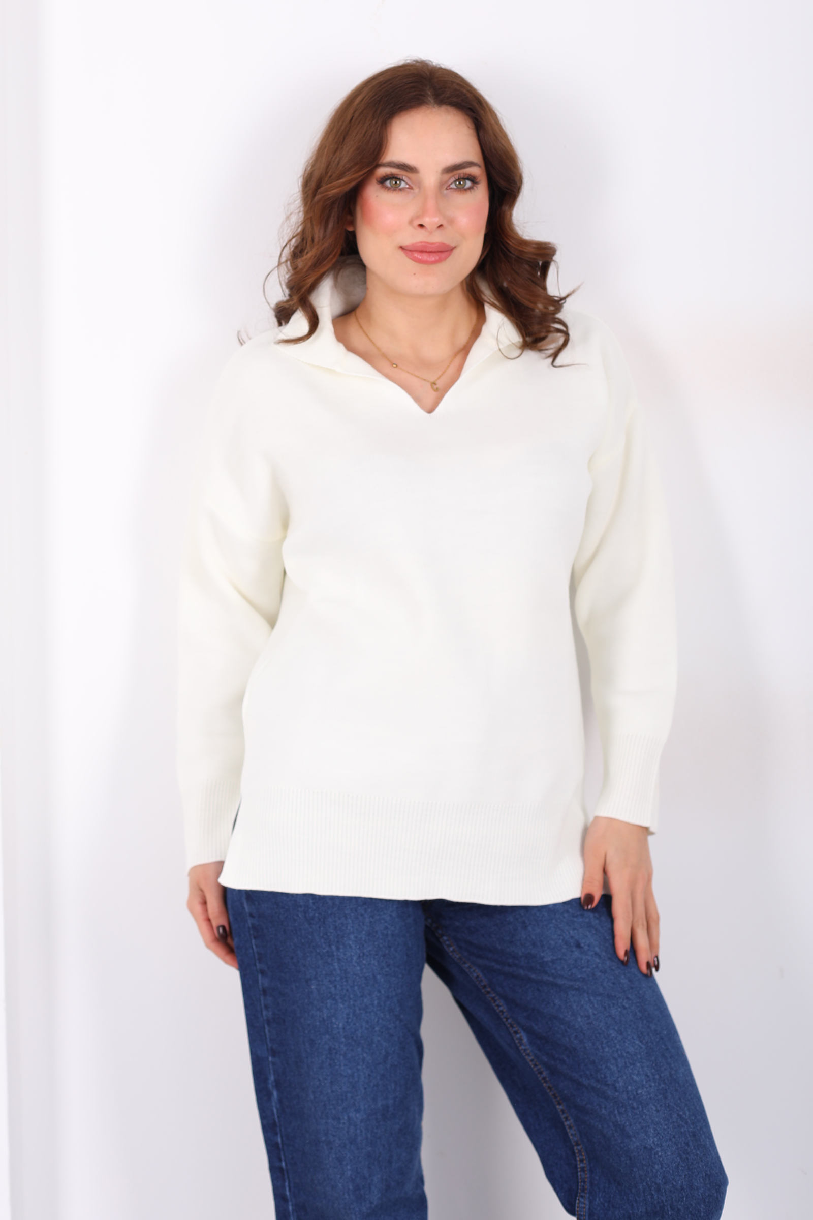 Polo Yaka Salaş Krem Kadın Triko Kazak