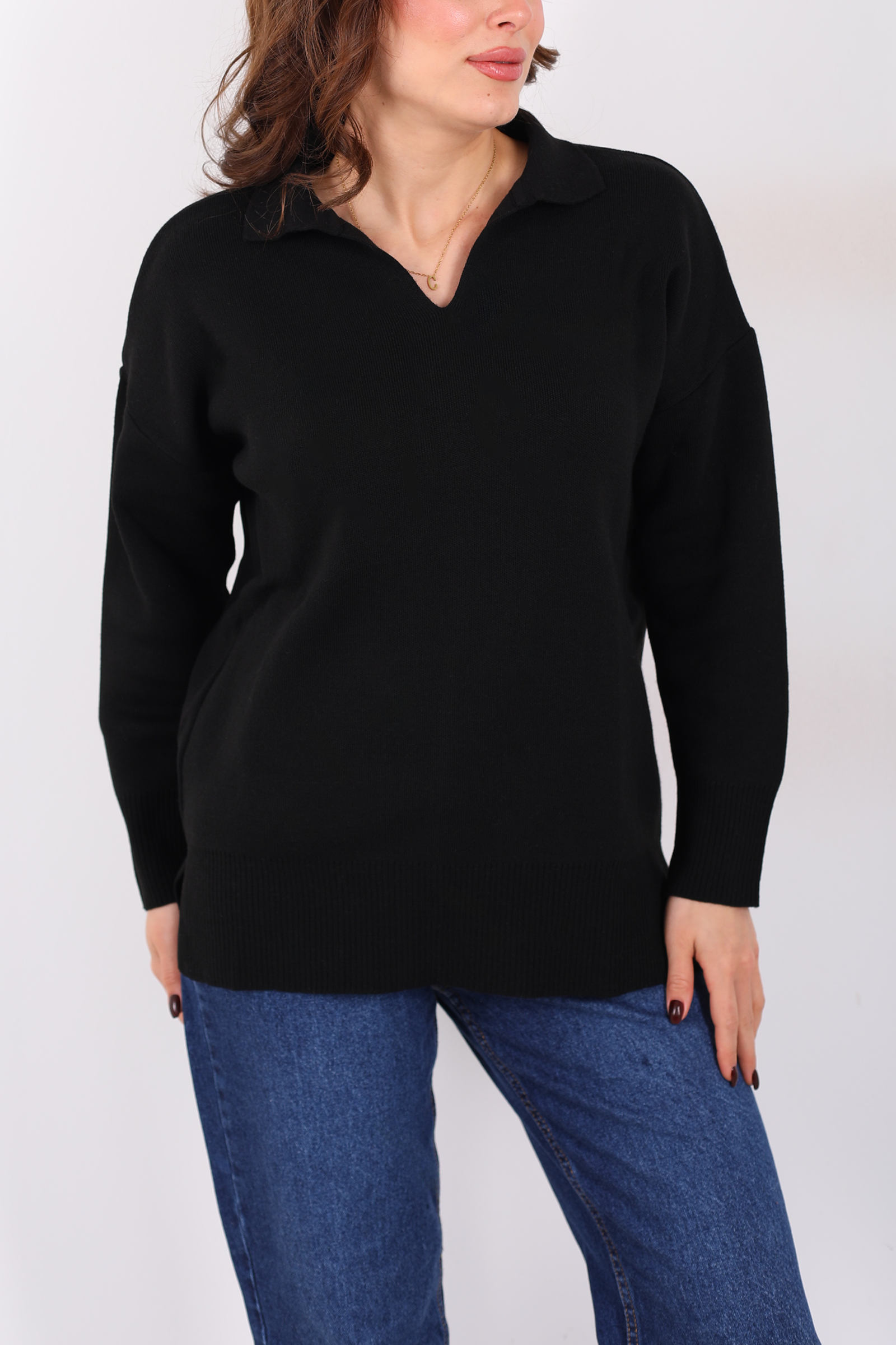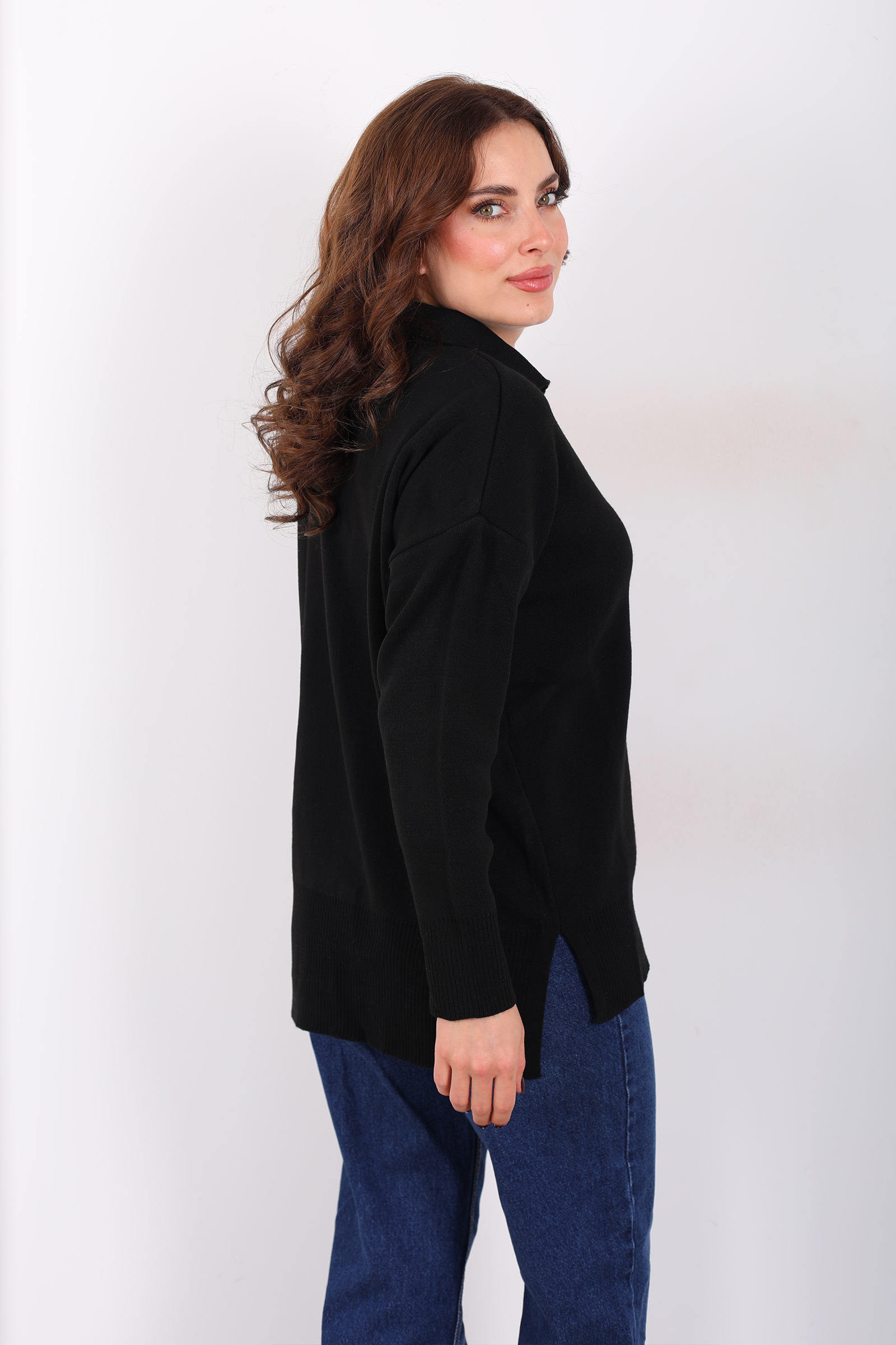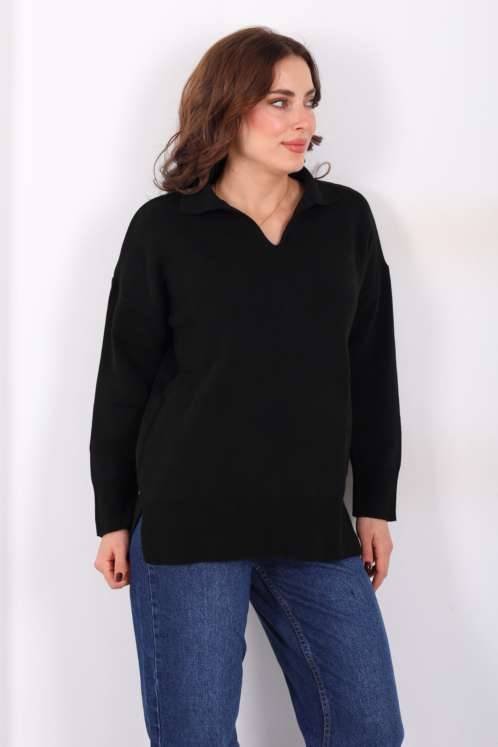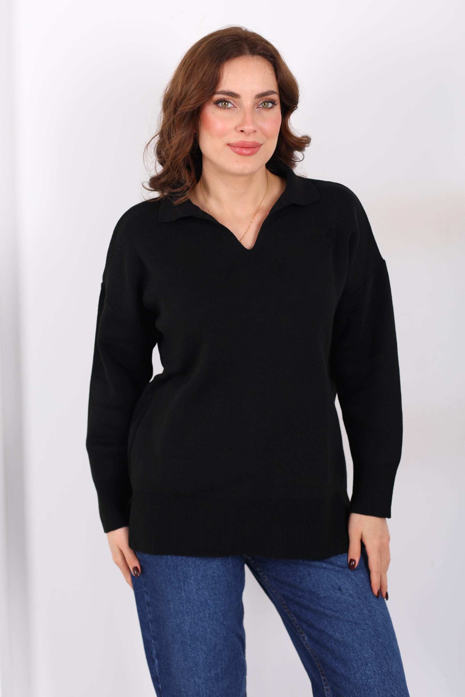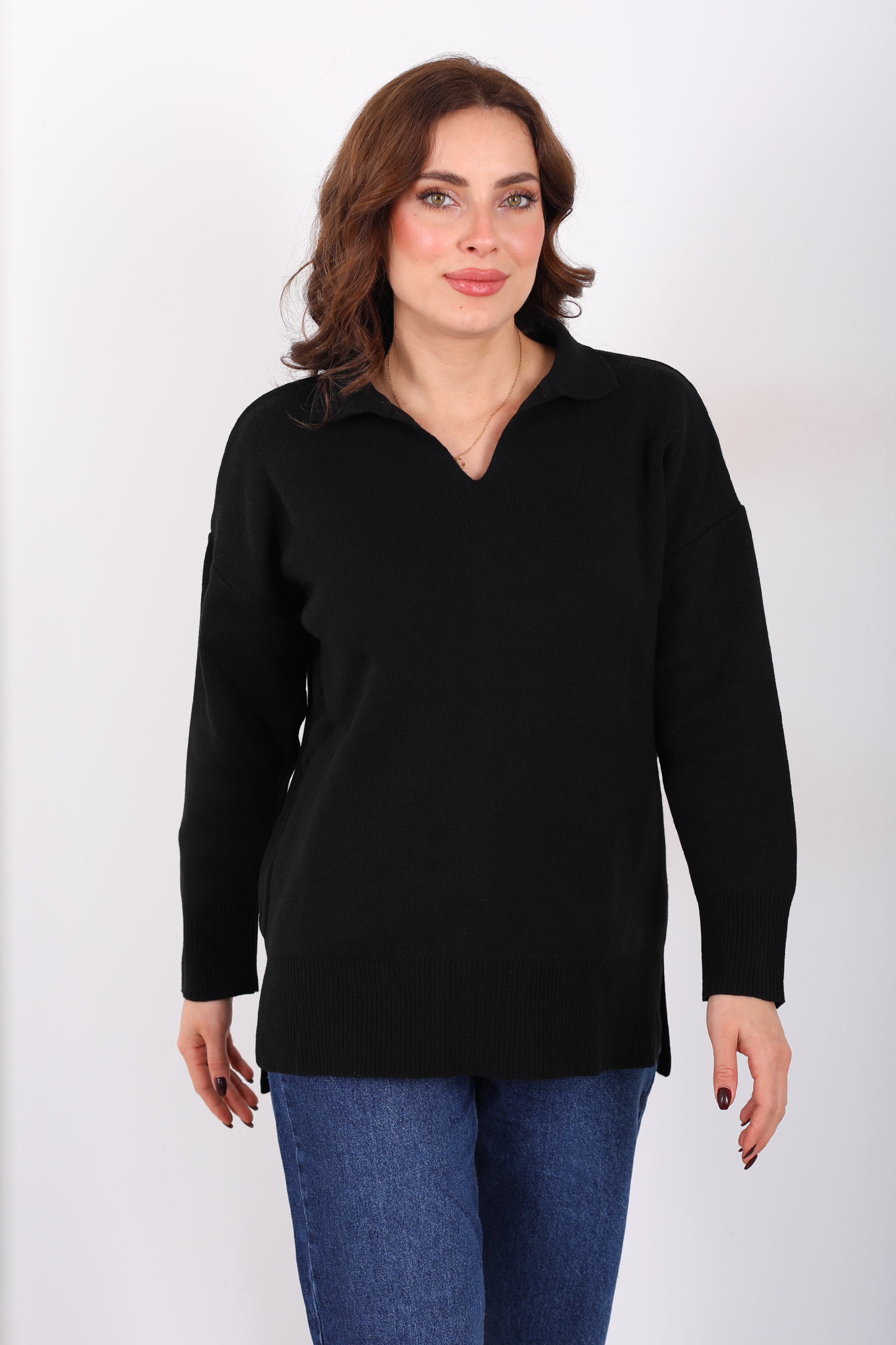Polo Yaka Salaş Siyah Kadın Triko Kazak