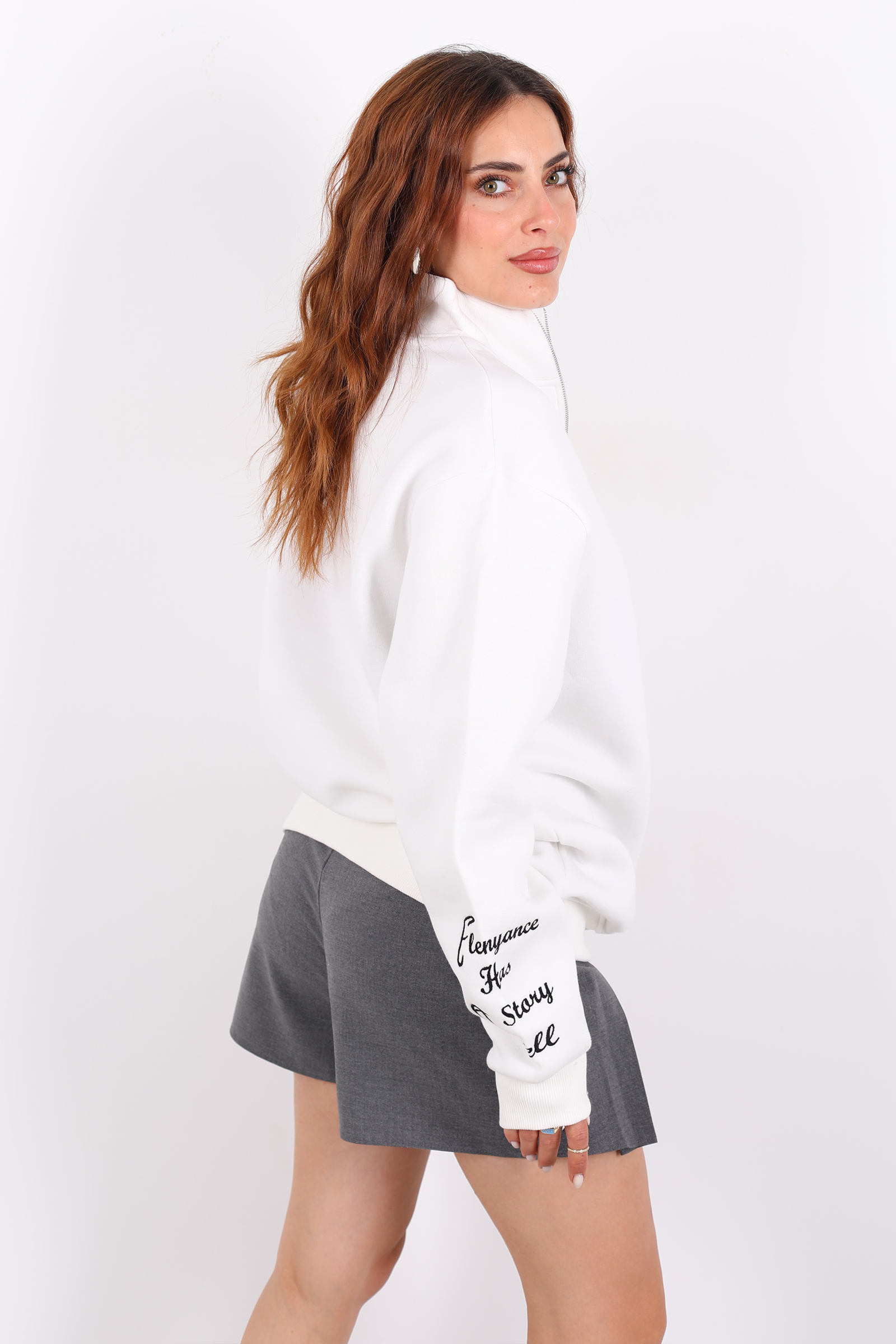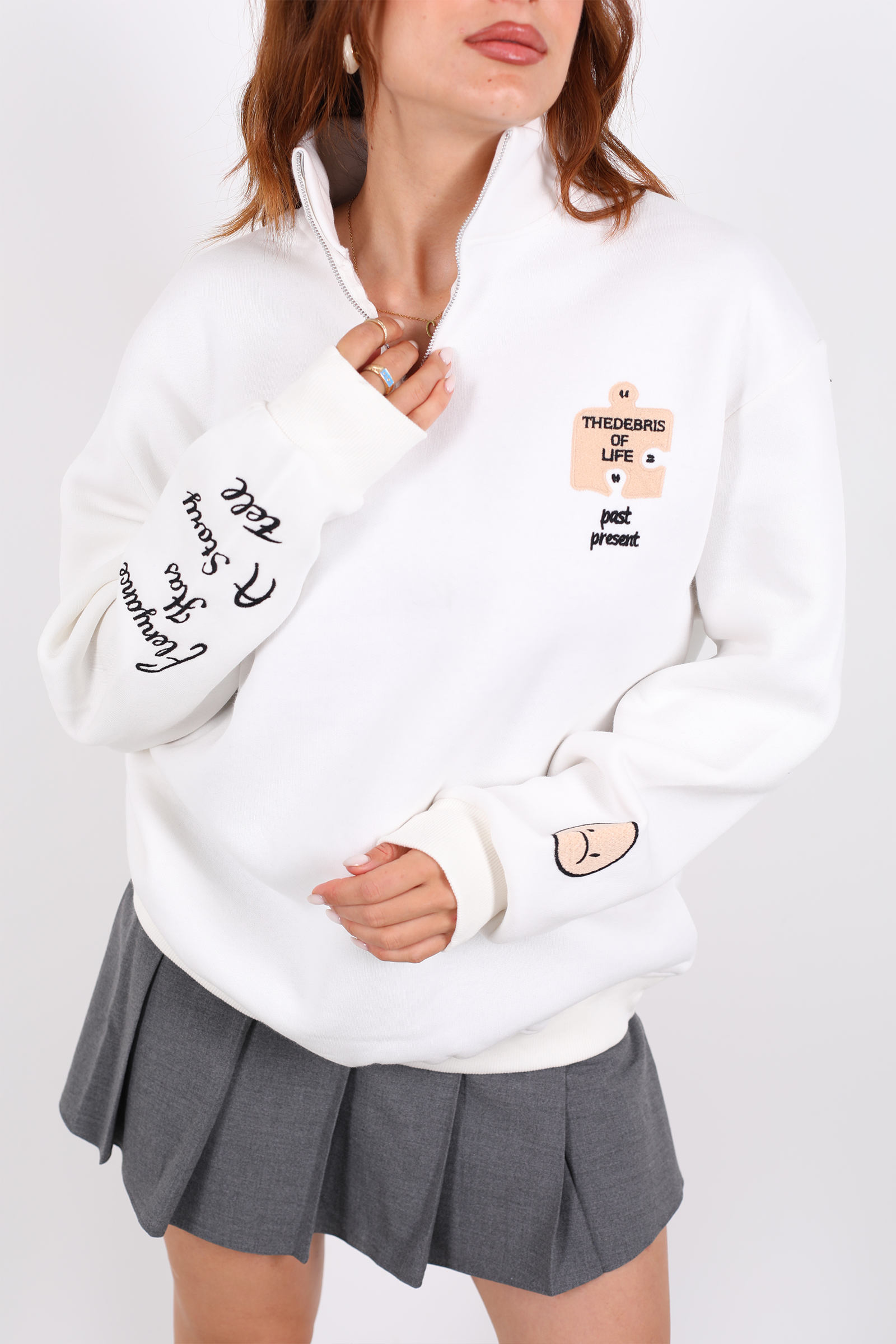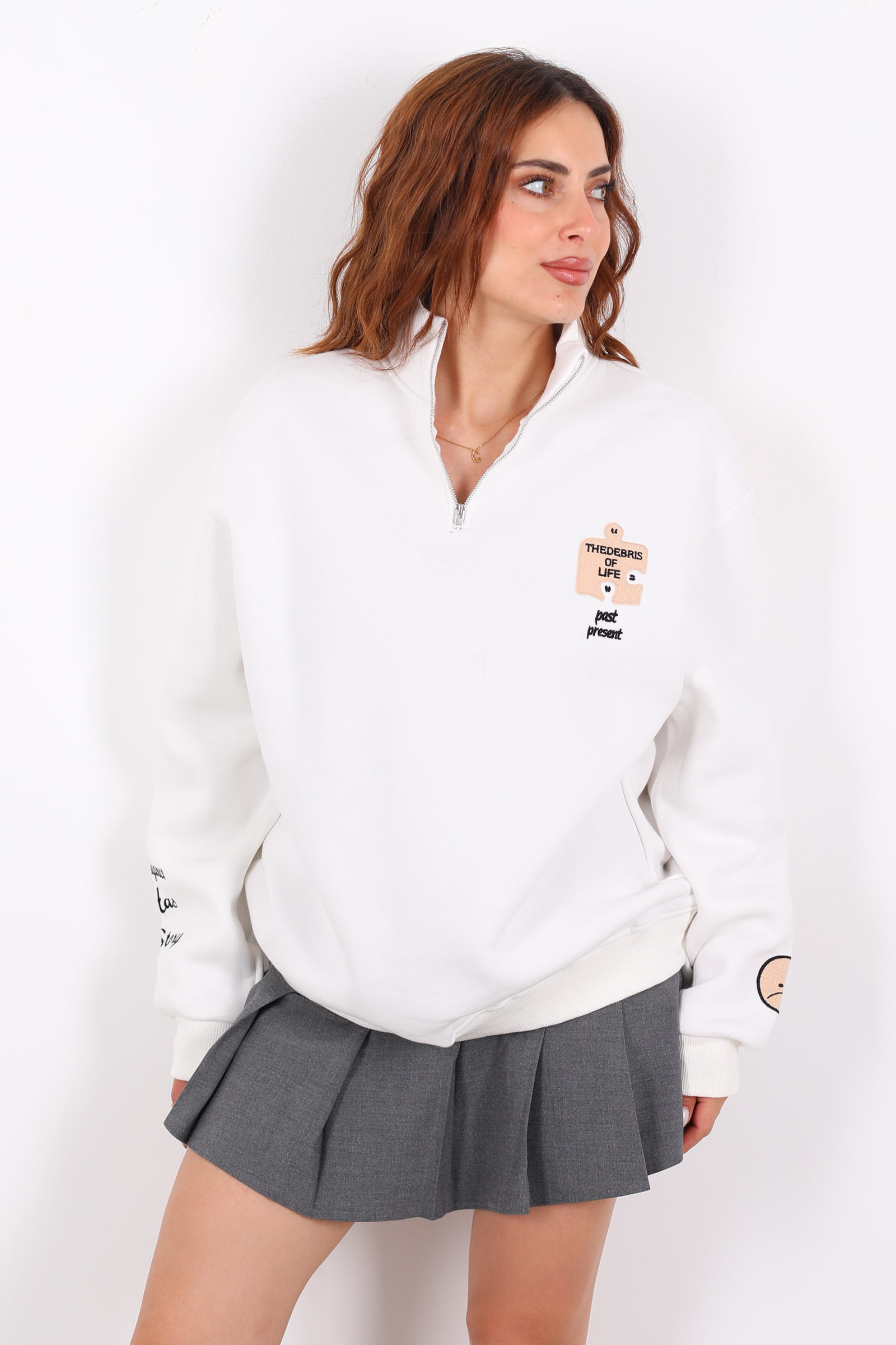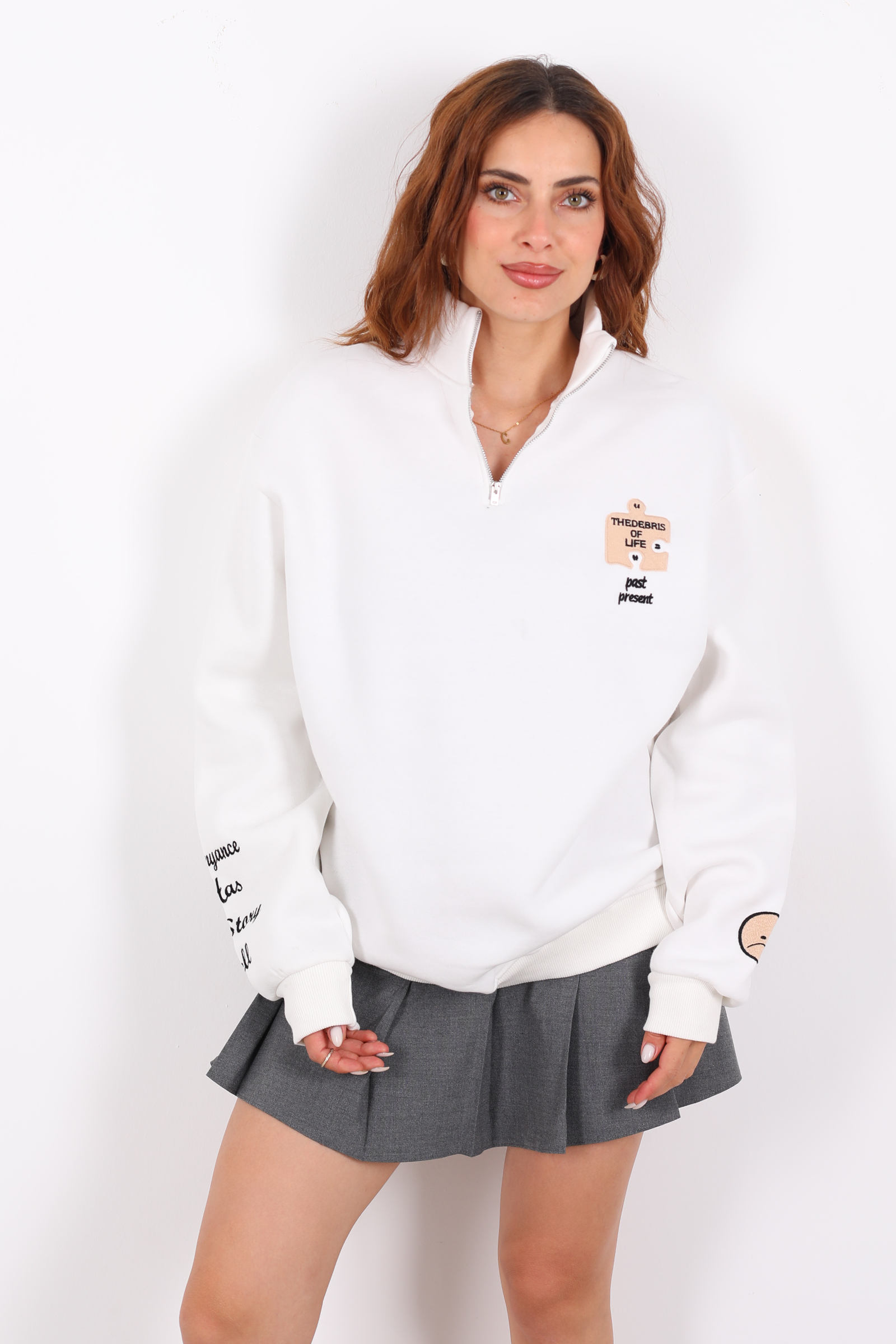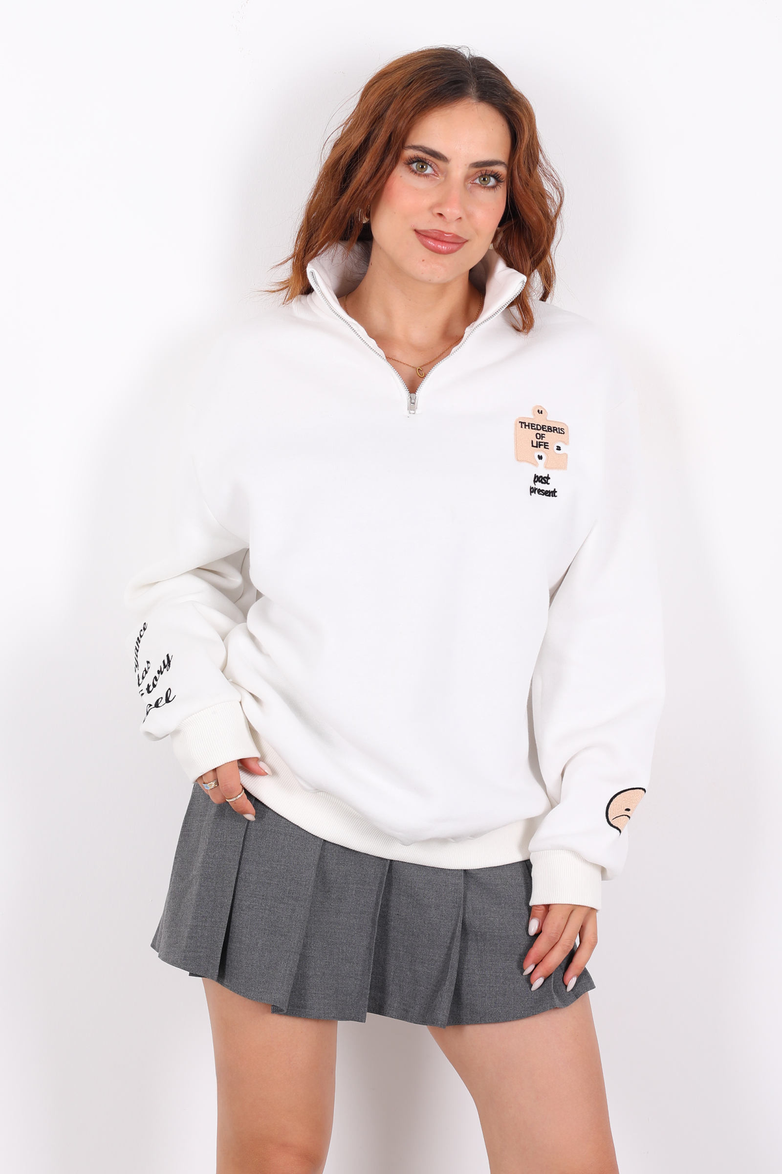 Günlük stilinize hem rahatlık hem de modern bir dokunuş katmak istiyorsanız, Post Present baskılı yarım fermuarlı beyaz kadın sweat tam size göre! Yumuşak dokulu üç iplik kumaşı sayesinde serin havalarda sizi sıcak tutarken, oversize kalıbı ile gün boyu konfor sunar. Ön kısmındaki “Post Present” yazı detayı, sade görünümünüze hareket katar ve minimal sokak stilinizi öne çıkarır. Yarım fermuar detayı ise ürünü hem spor hem de casual kombinlerde kullanmanıza olanak tanır.