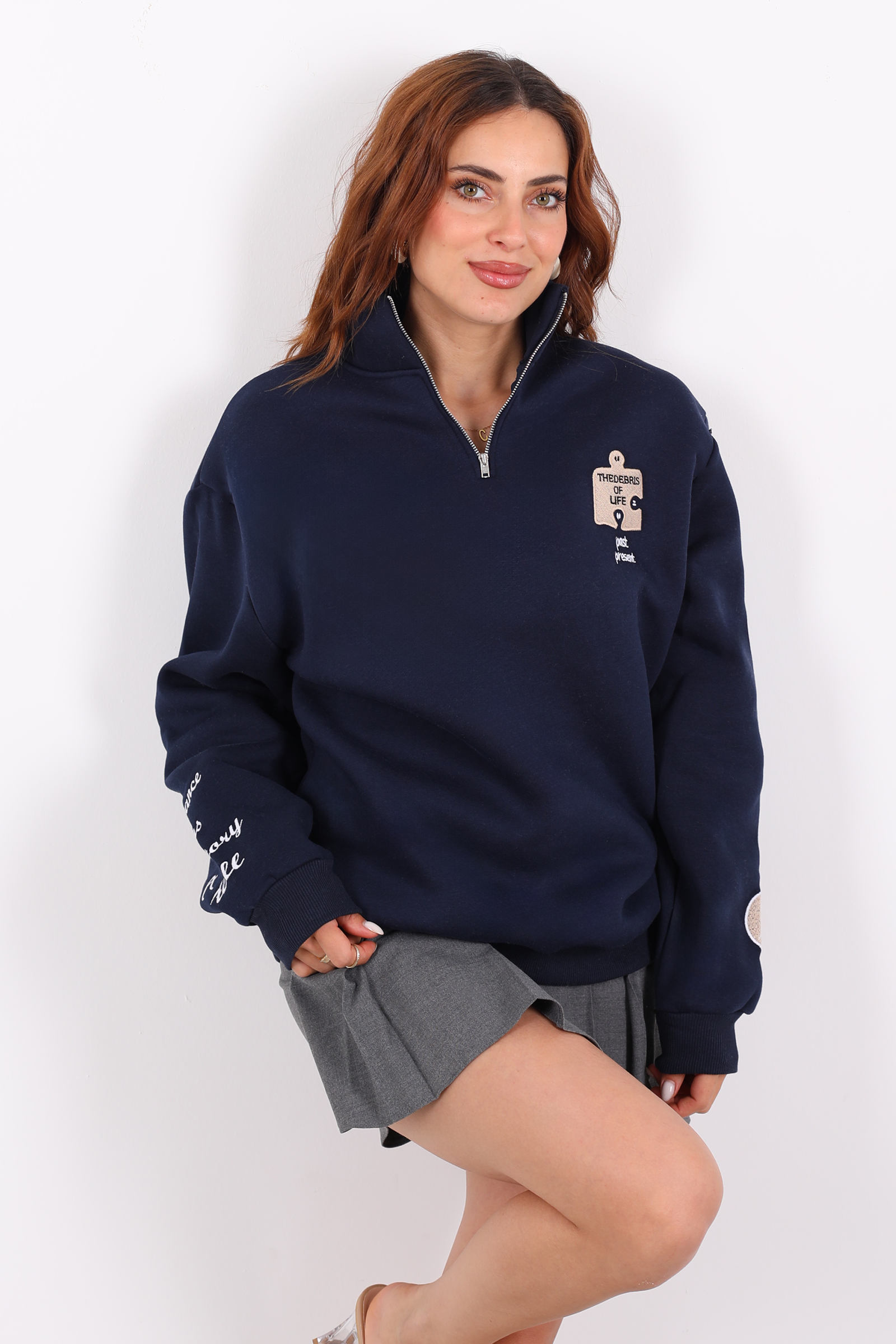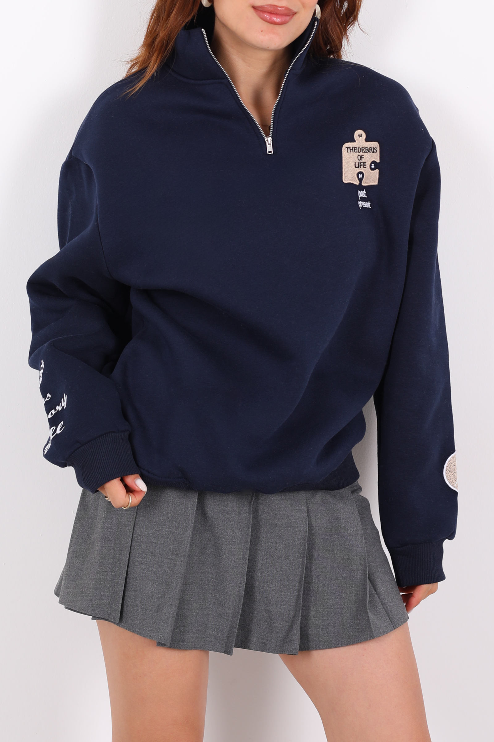 ünlük kombinlerinize sportif bir dokunuş katan Post Present baskılı yarım fermuarlı lacivert kadın sweat ile tarzınız hem konforlu hem dikkat çekici olacak. Oversize kesimi sayesinde salaş ve rahat bir kullanım sunan bu sweatshirt, %70 pamuk ve %30 polyester kumaşıyla nefes alabilen, sıcaklık ve yıkama sonrası formunu koruyan bir yapıya sahiptir.