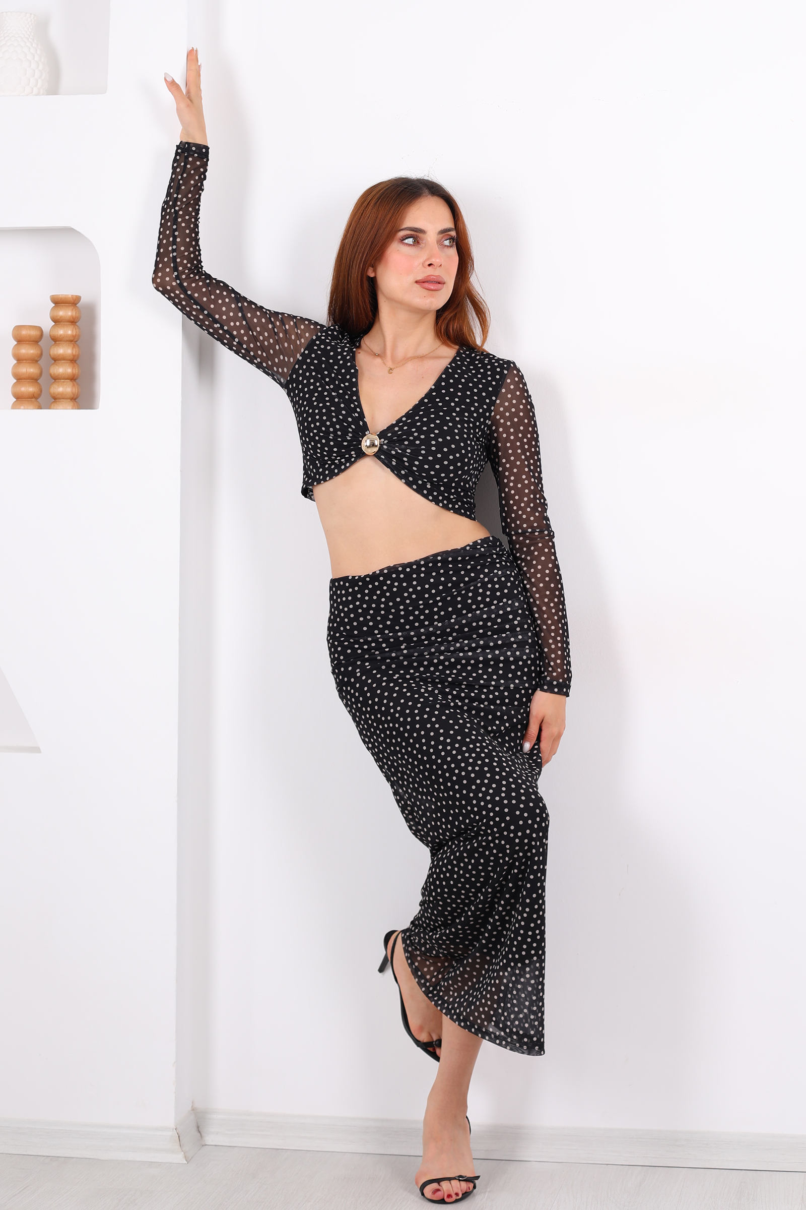 Siyahın büyüleyici duruşu, altın aksesuarların zarafeti ve puantiye deseninin enerjisi bu etek takımıyla buluşuyor. Hem klasik hem modern dokunuşlarla stilinize sofistike bir hava katarken, vücuda oturan kesimiyle feminen çizginizi ön plana çıkarır. Özel günlerinizin favorisi, günlük şıklığınızın ise vazgeçilmezi olacak.Siyah stiletto ve kırmızı rujla klasik ve iddialı bir görünüm yaratın.