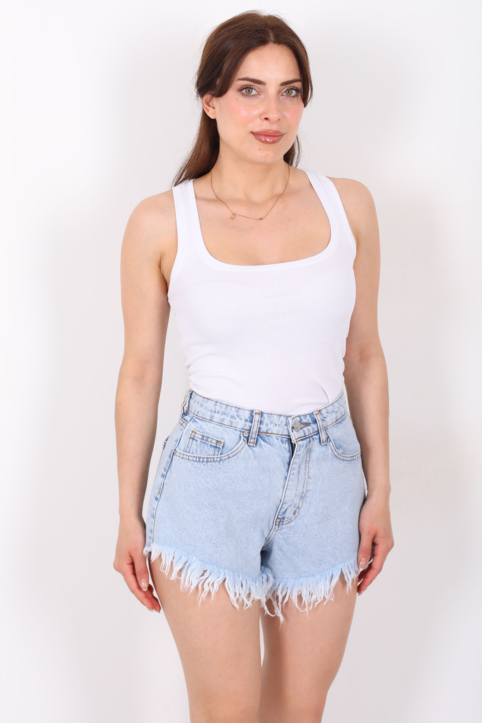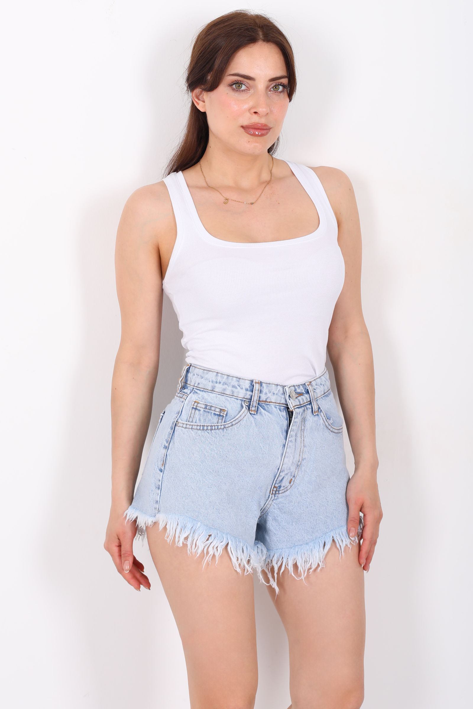 Püsküllü Kadın Açık Mavi Kar Yıkama Denim Mini Şort