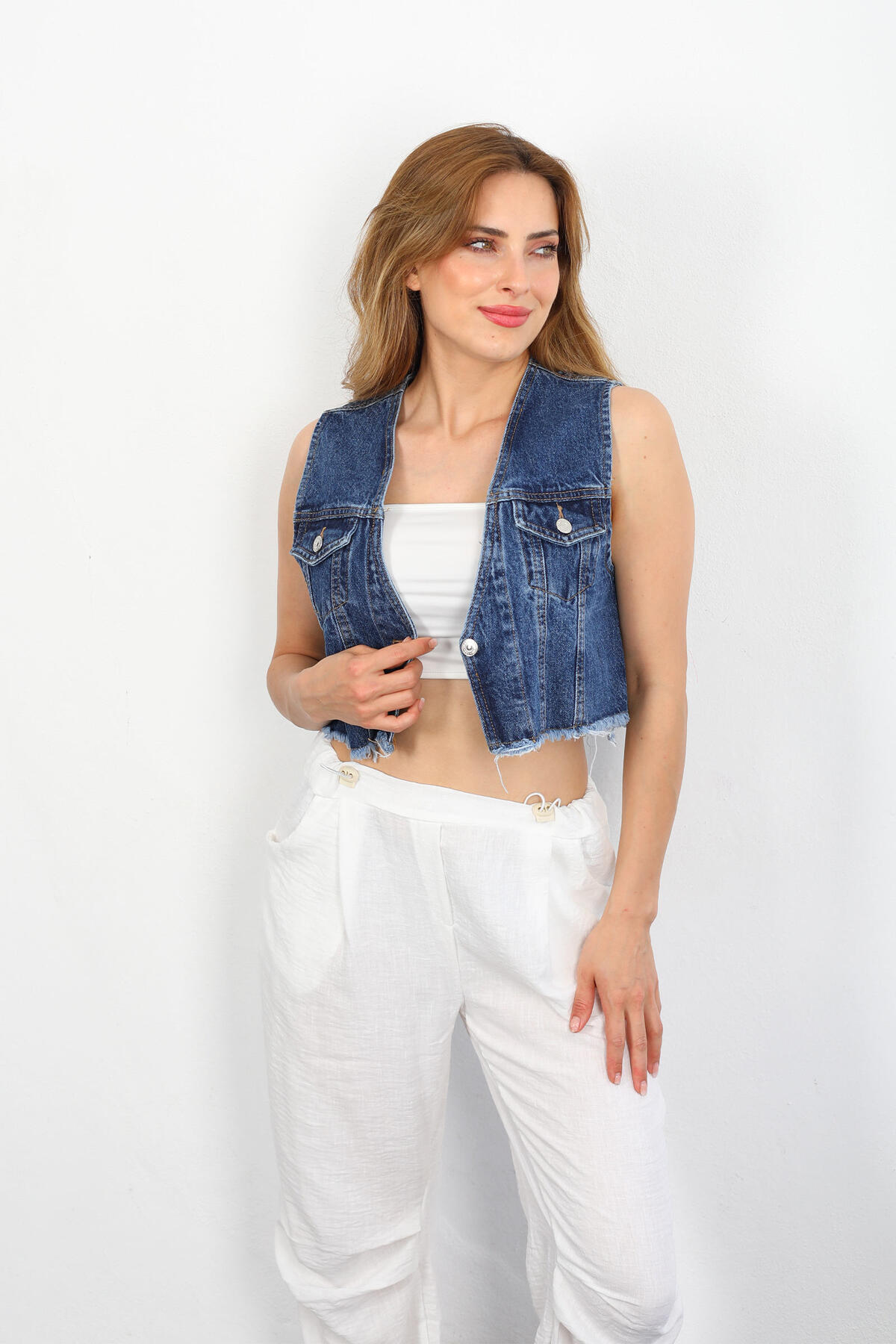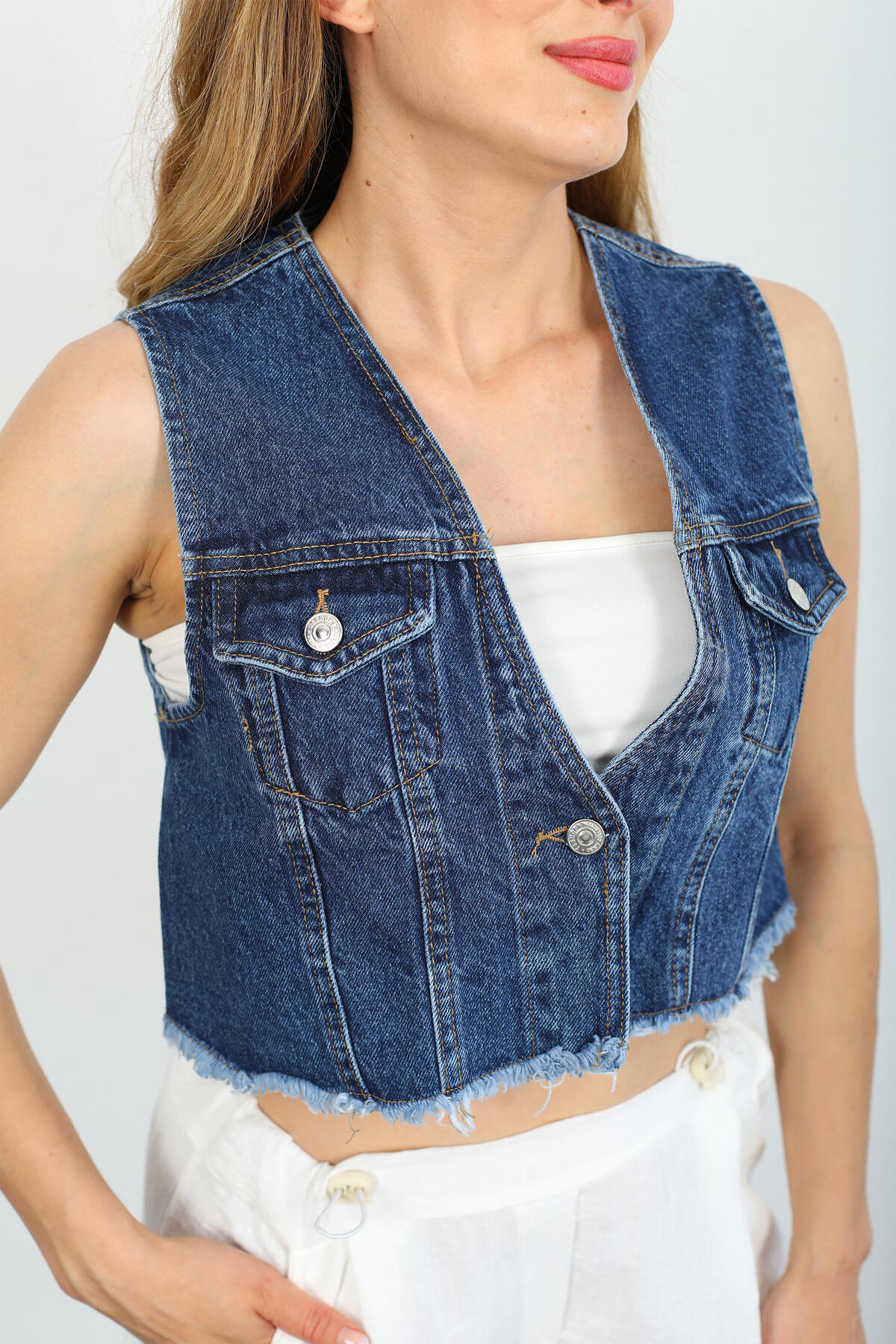 Koyu buz tonlarıyla modern ve şık bir görünüm sunan bu denim yelek, gardırobunuzun vazgeçilmez parçalarından biri olmaya aday. Özellikle püskül detayları, yeleğe bohem bir hava katarak yaz aylarının enerjisini yansıtır. Klasik yaka ve düğme kapama detayları, yeleğe zarif bir dokunuş ekler. Normal kalıp tasarımı, vücuda oturmadan rahat bir silüet sağlar.