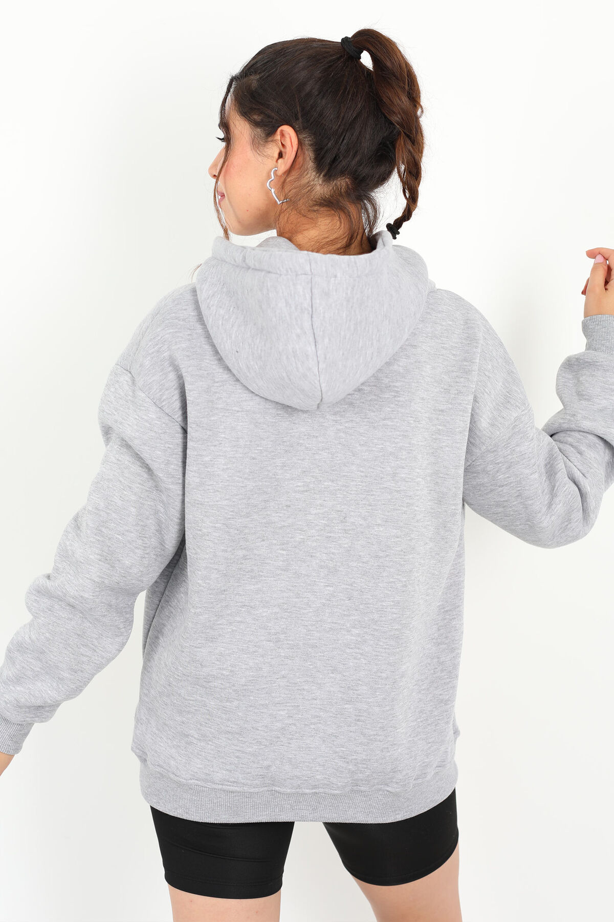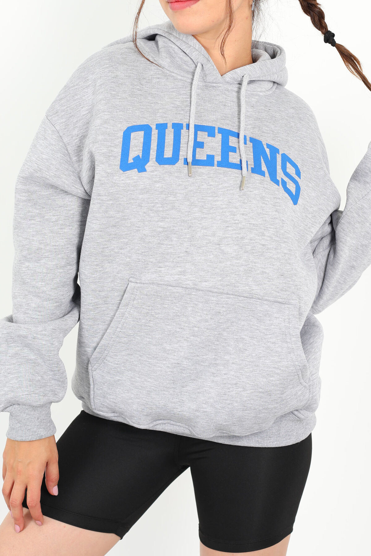 Queens Baskılı Kapüşonlu Gri Kadın Üç İplik Sweat