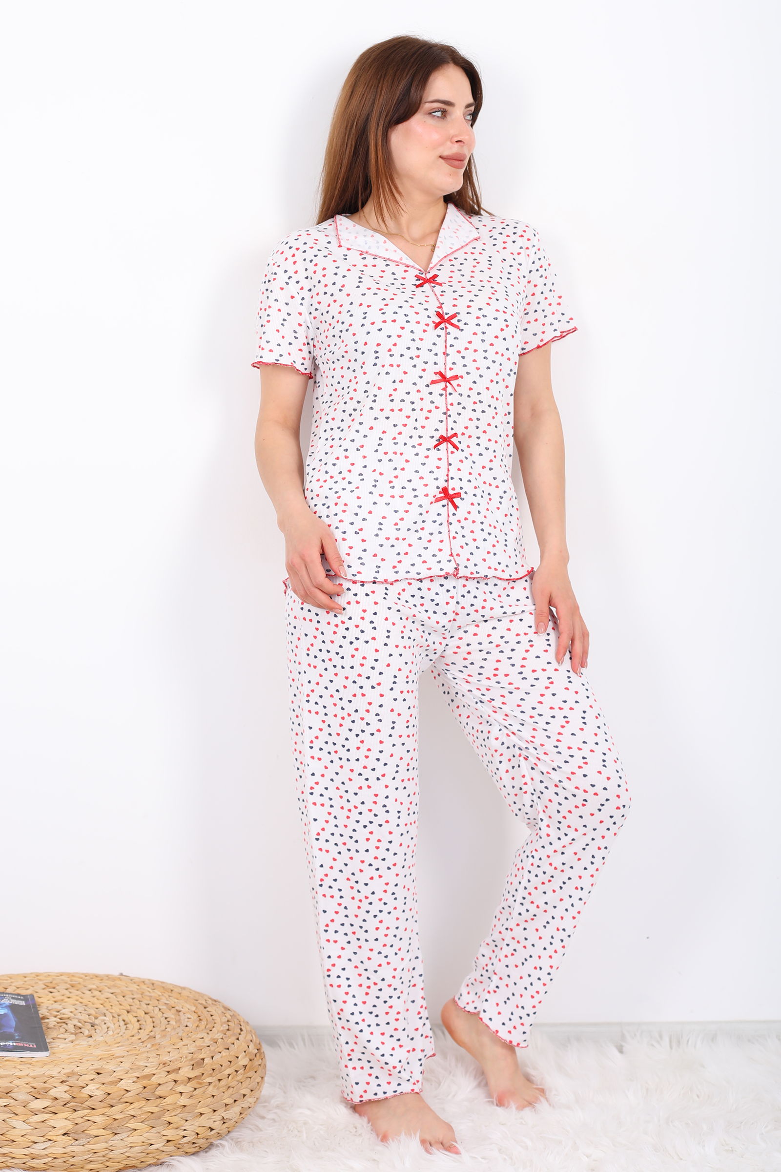 Mini Kalpli Gül Kurusu Kadın Yarım Düğmeli Pijama Takımı