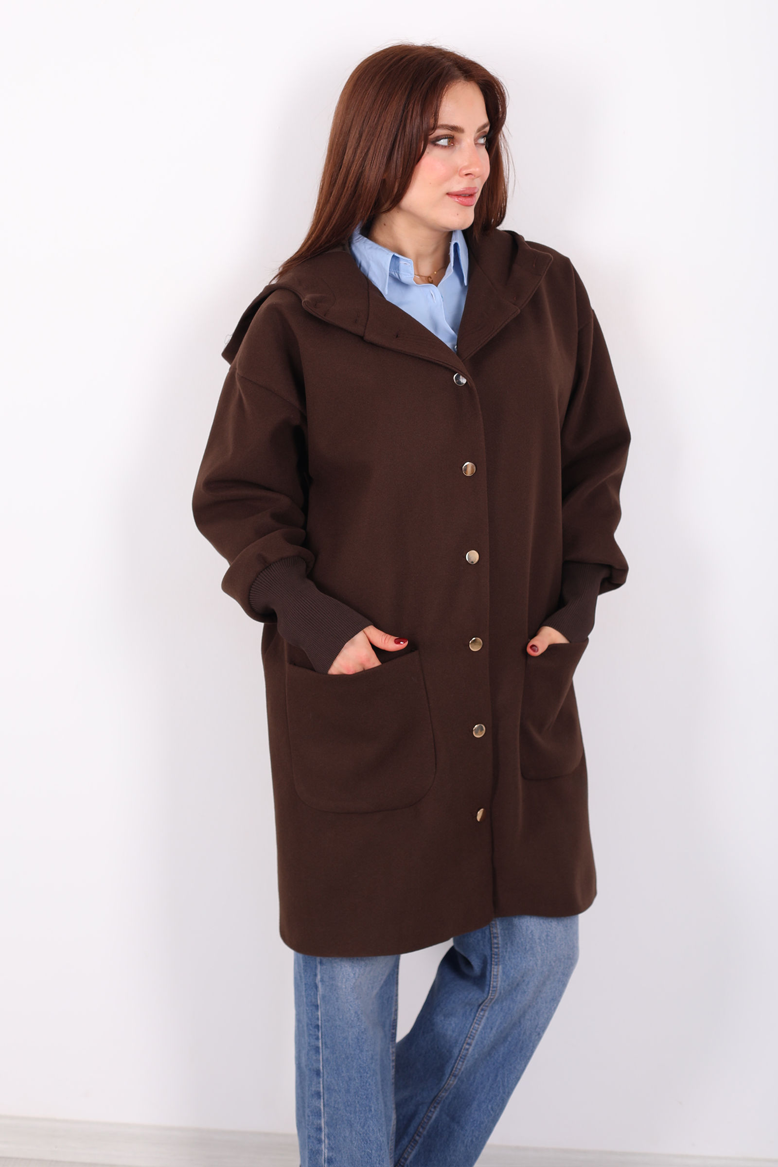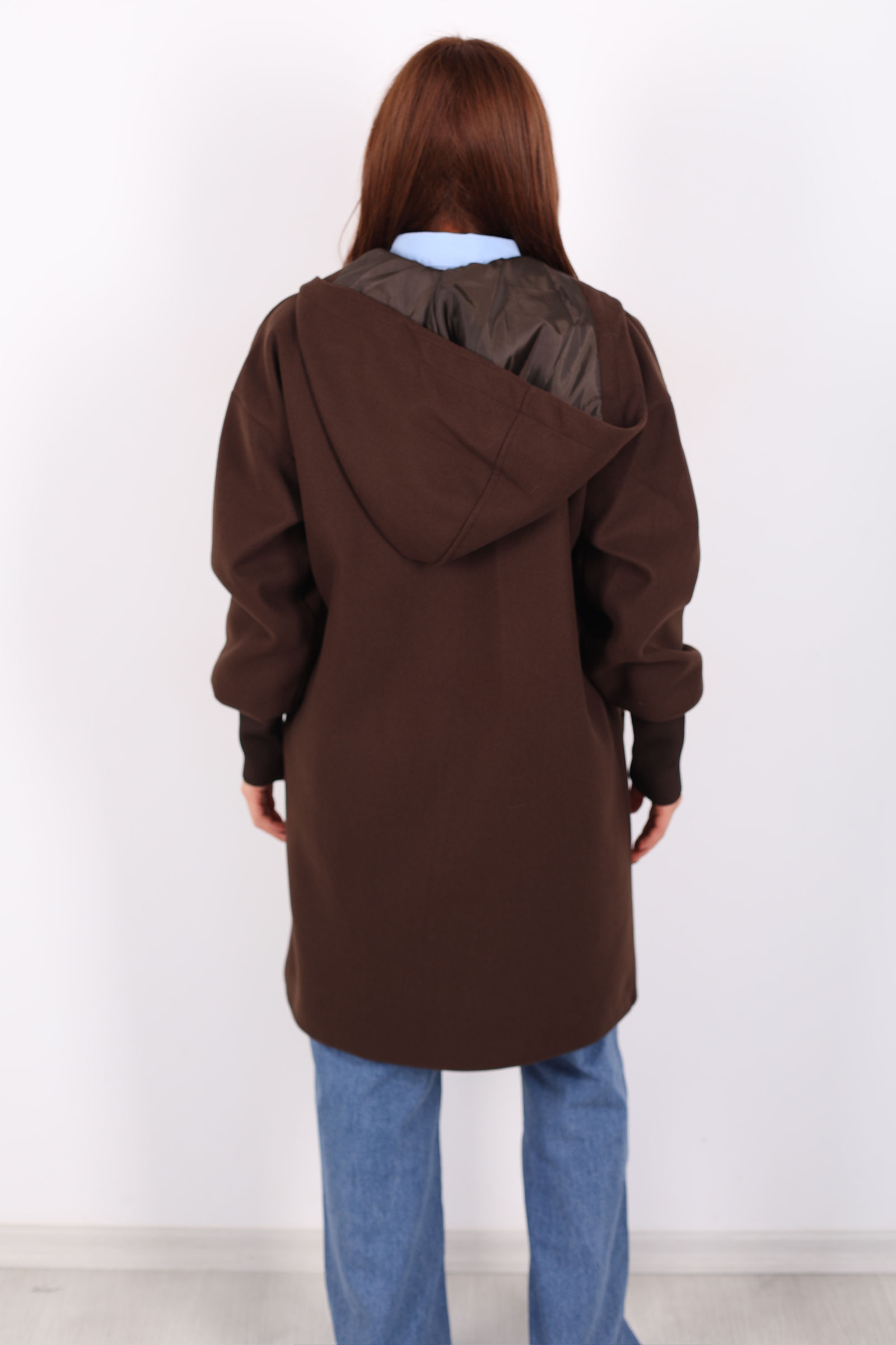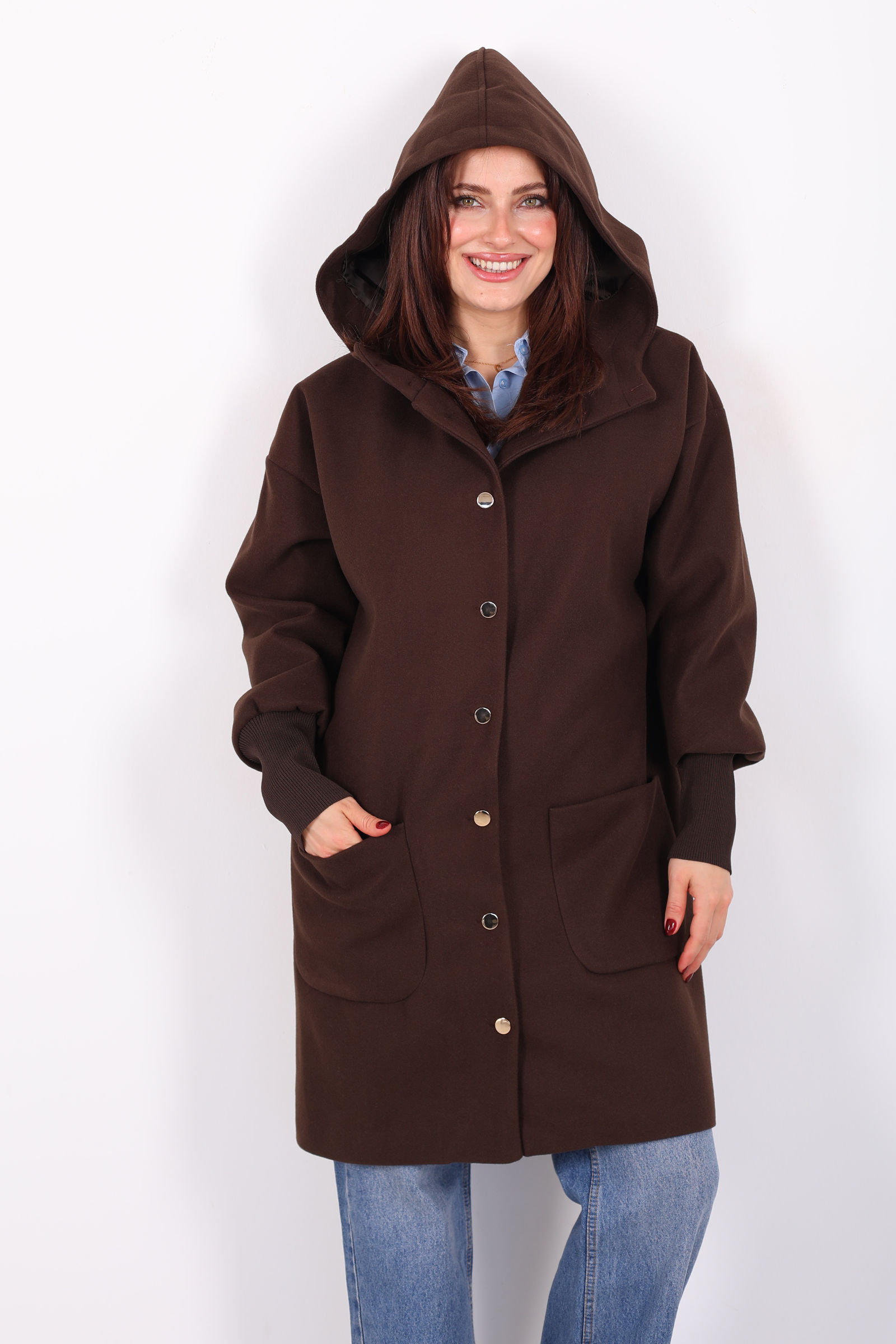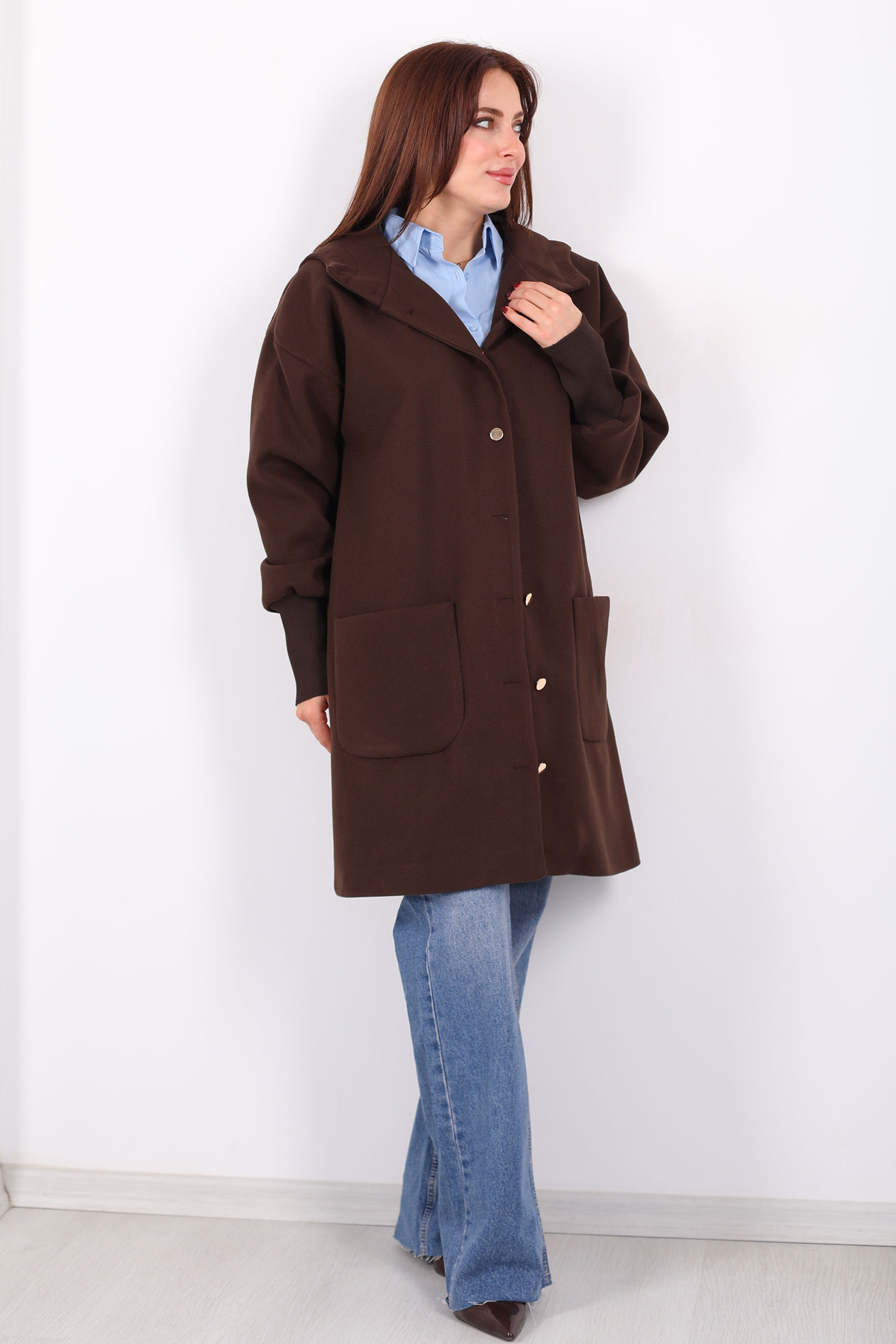 Ribana Kol Düğmeli Oversize Kadın Kahverengi Kapüşonlu Kaban