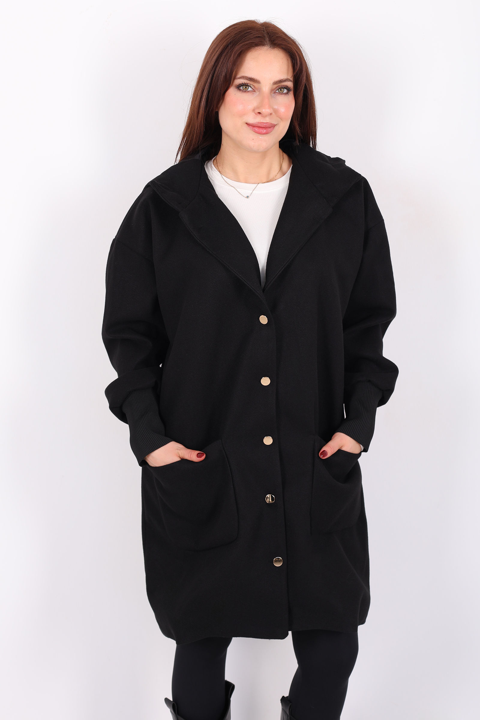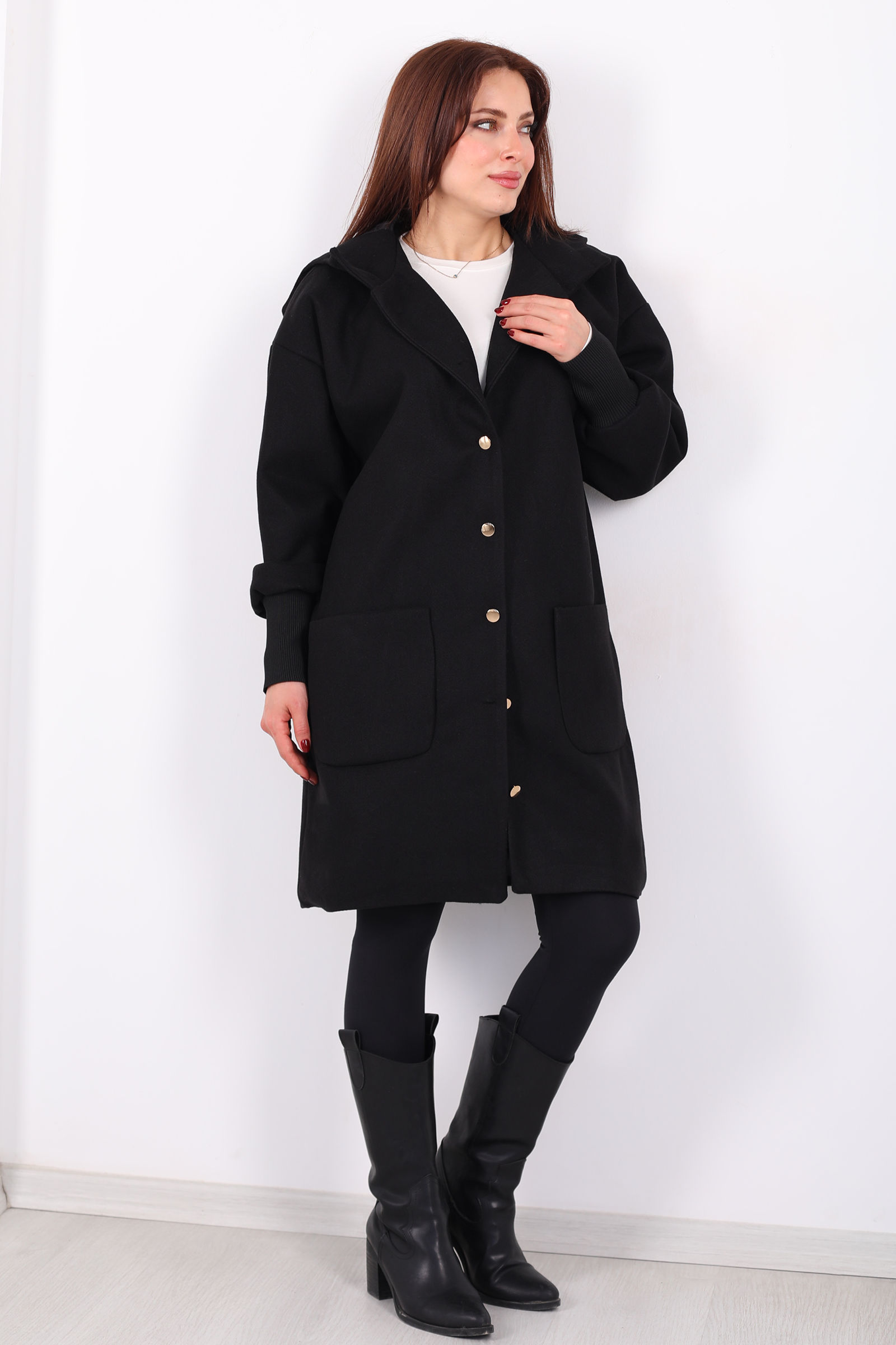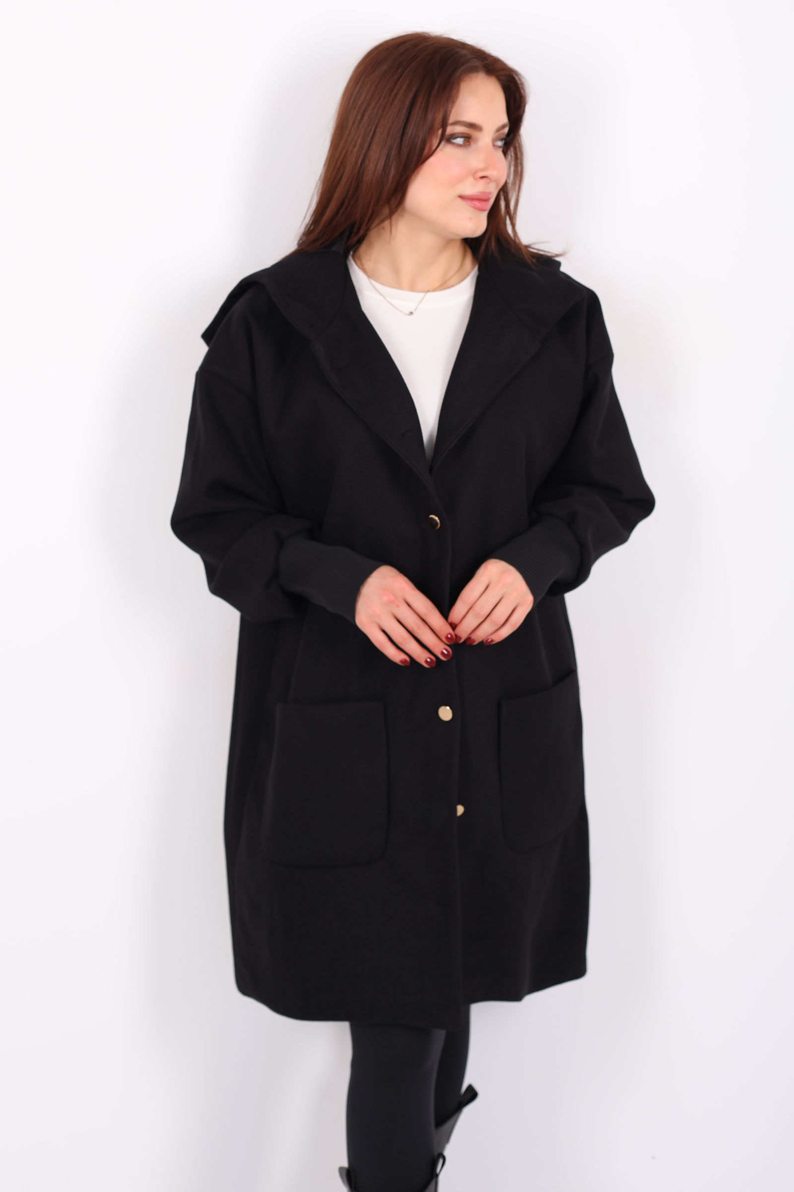 Ribana Kol Düğmeli Oversize Kadın Siyah Kapüşonlu Kaban