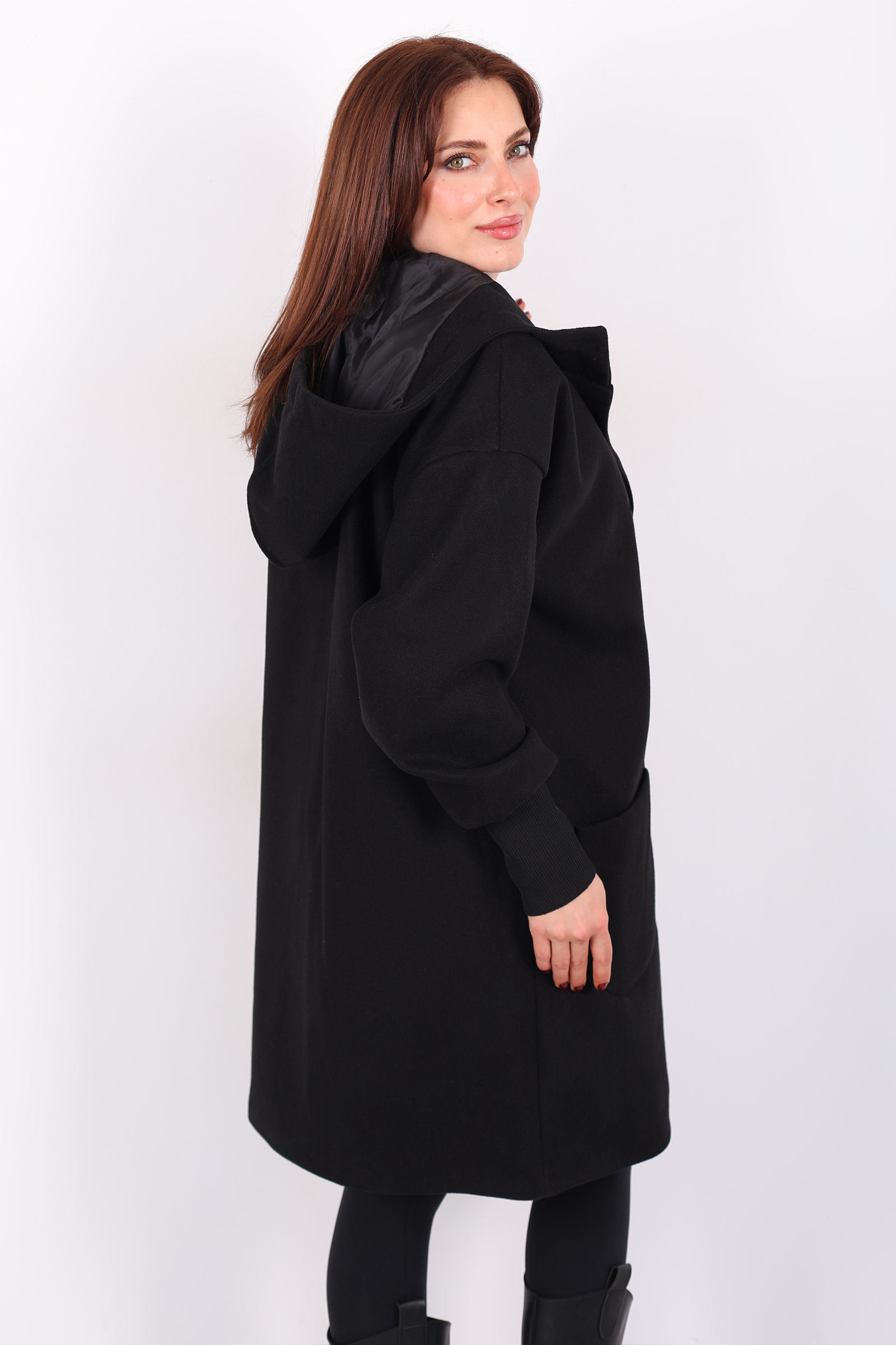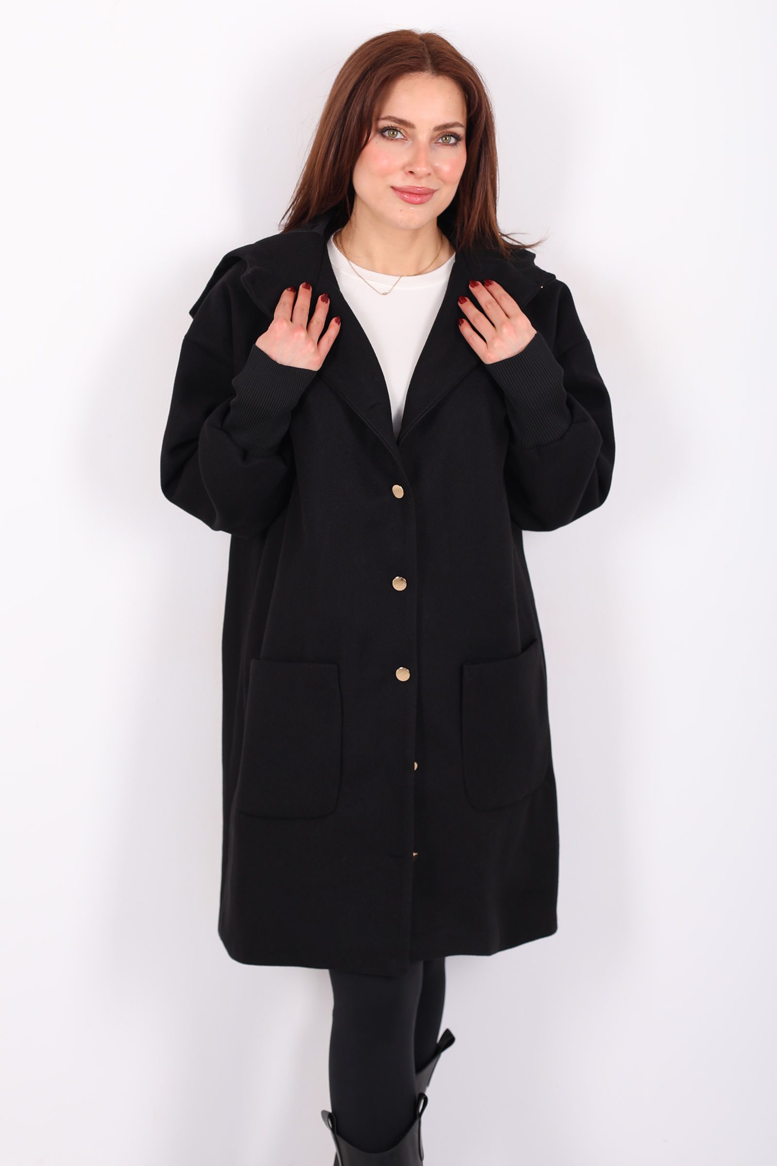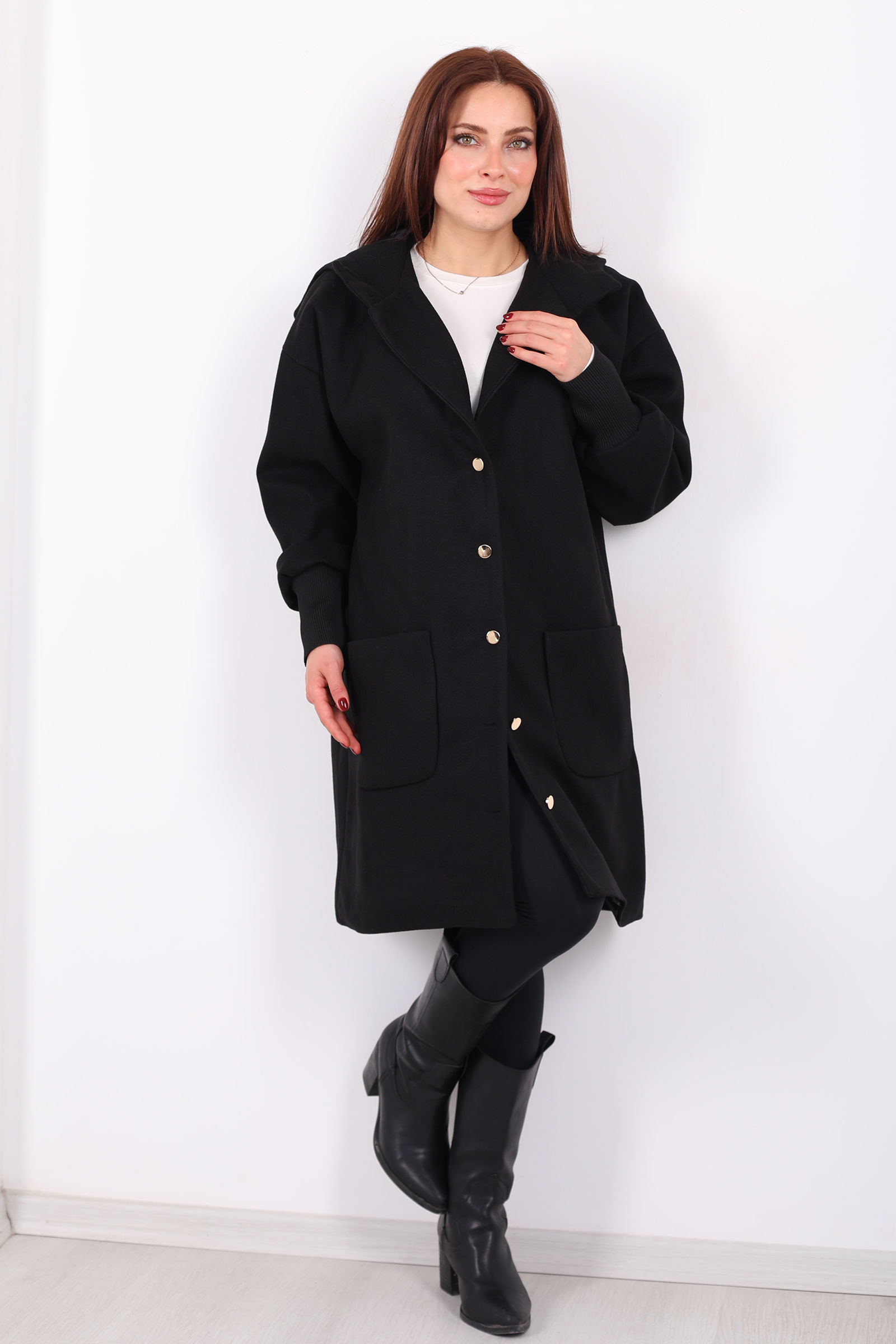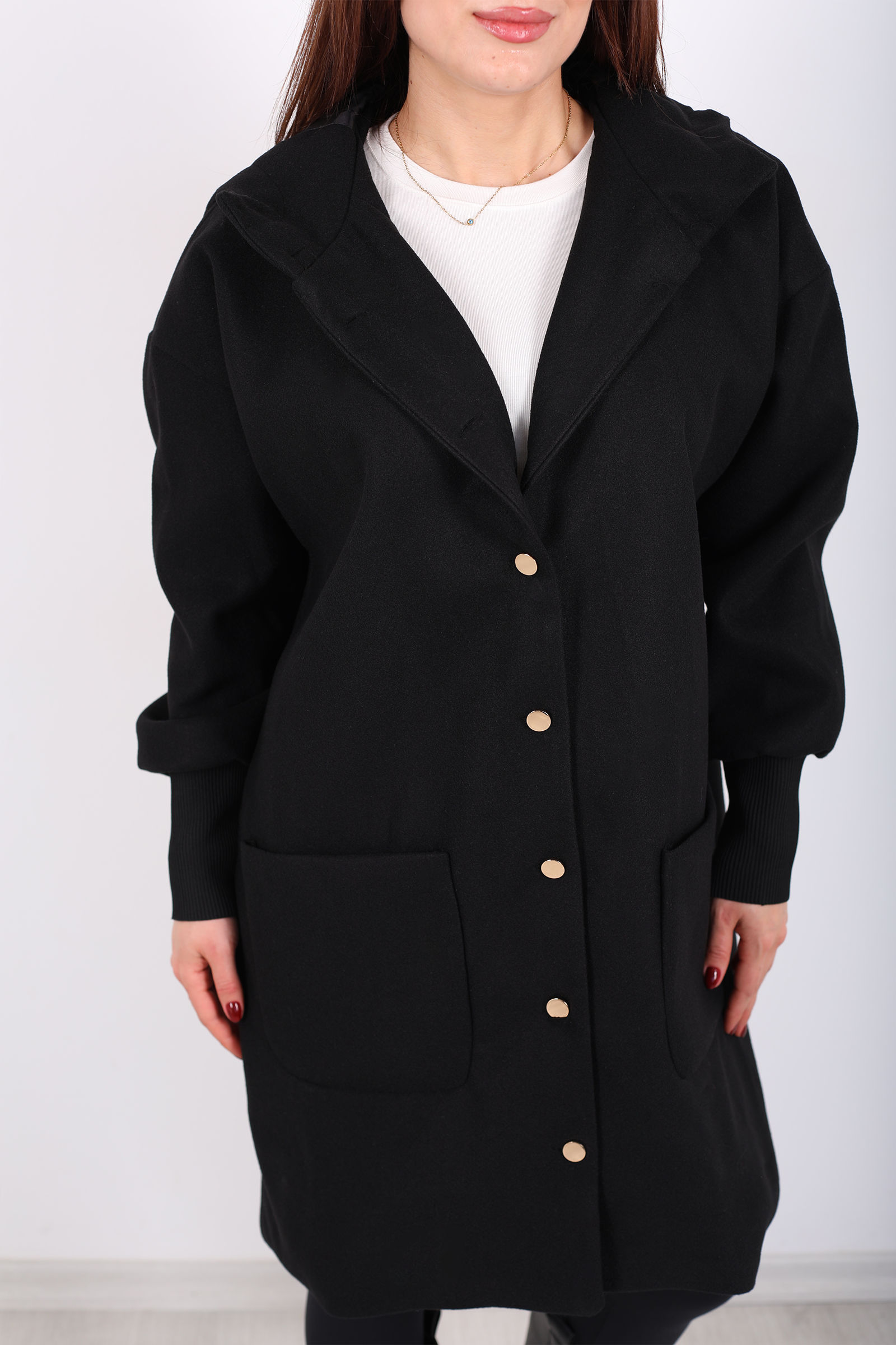Ribana Kol Düğmeli Oversize Kadın Siyah Kapüşonlu Kaban