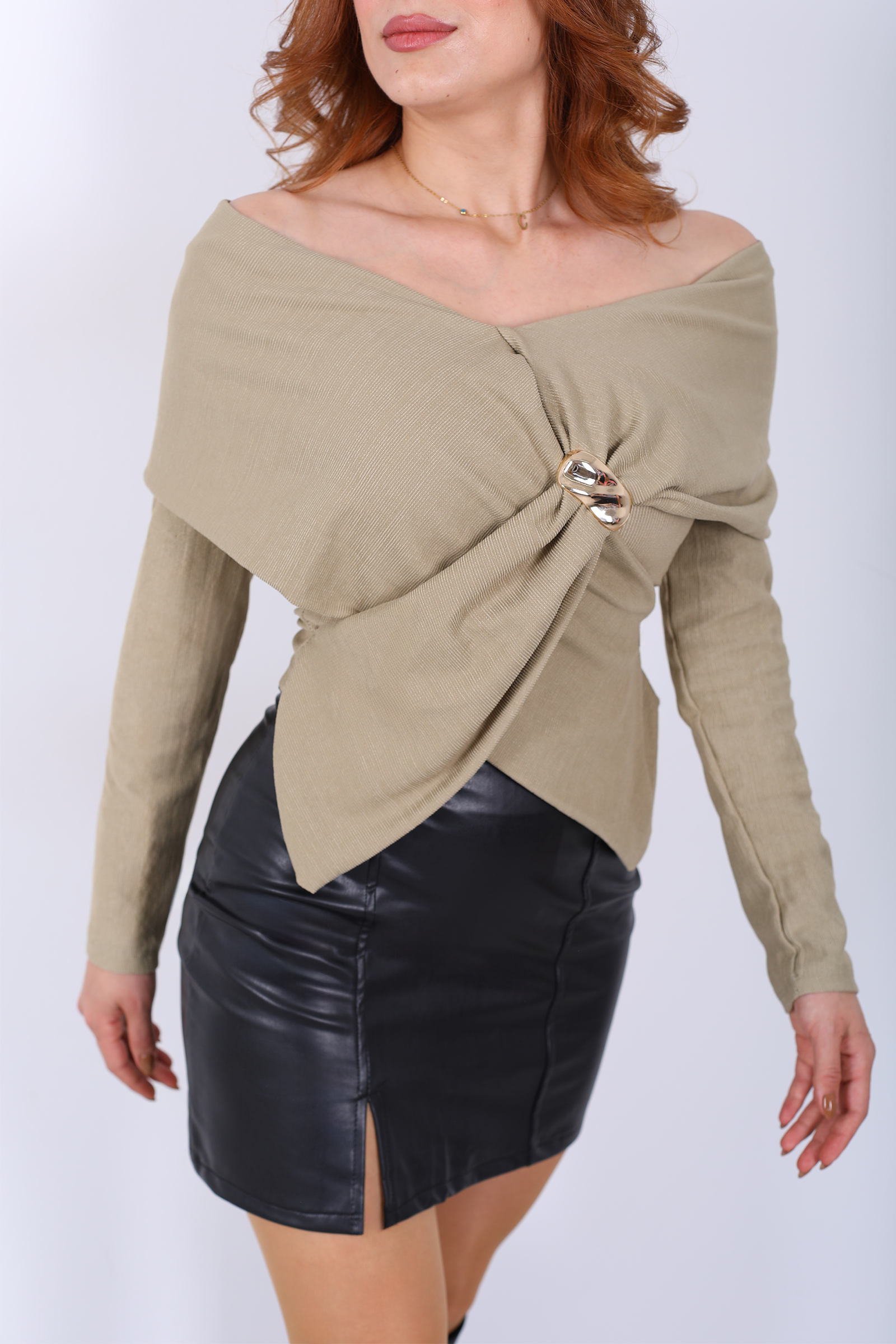 Şal Yaka Broşlu Çağla Yeşili Kadın Ottoman Bluz