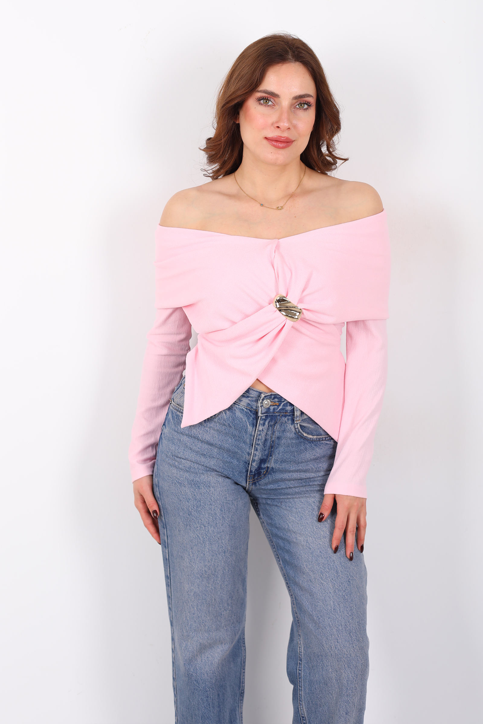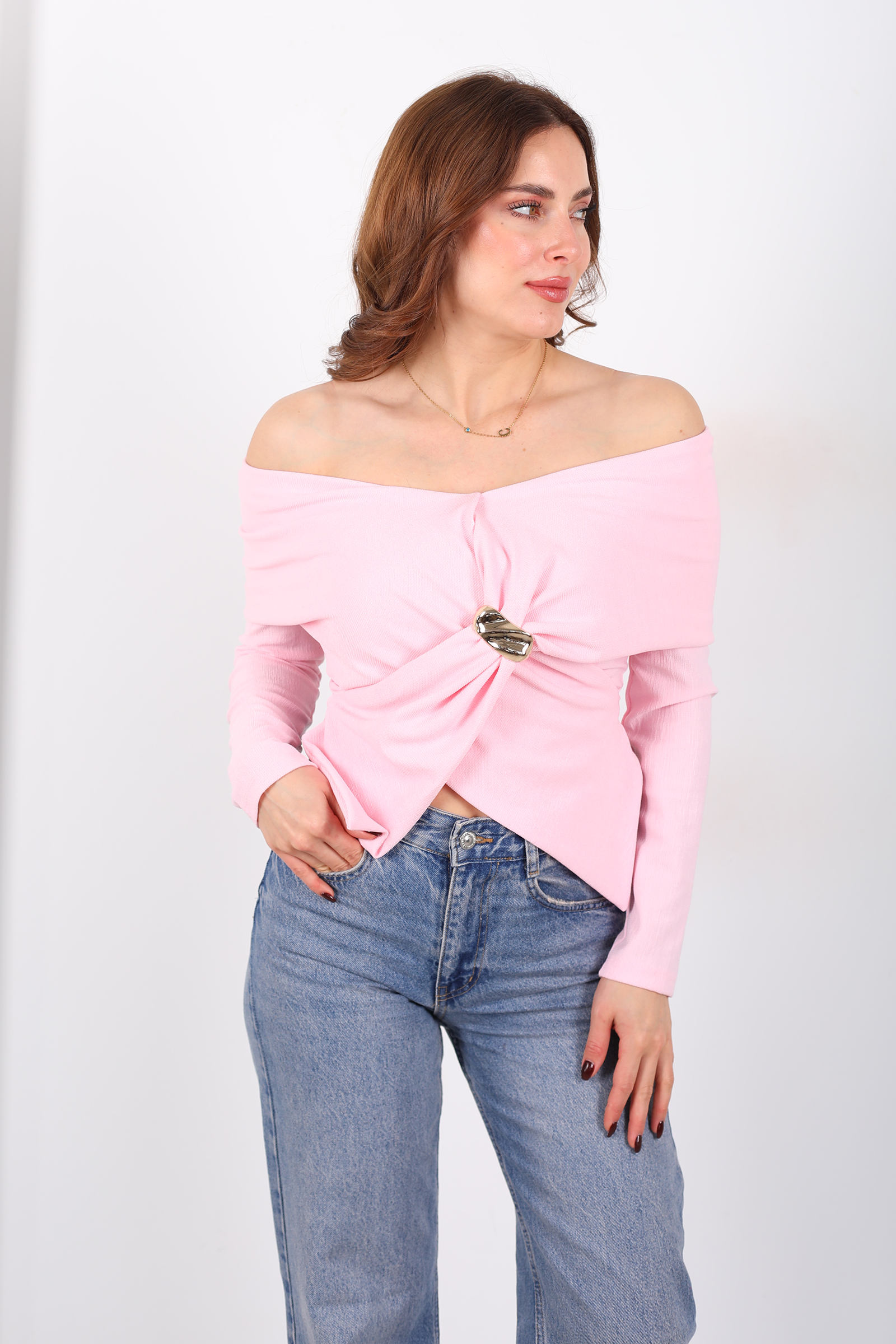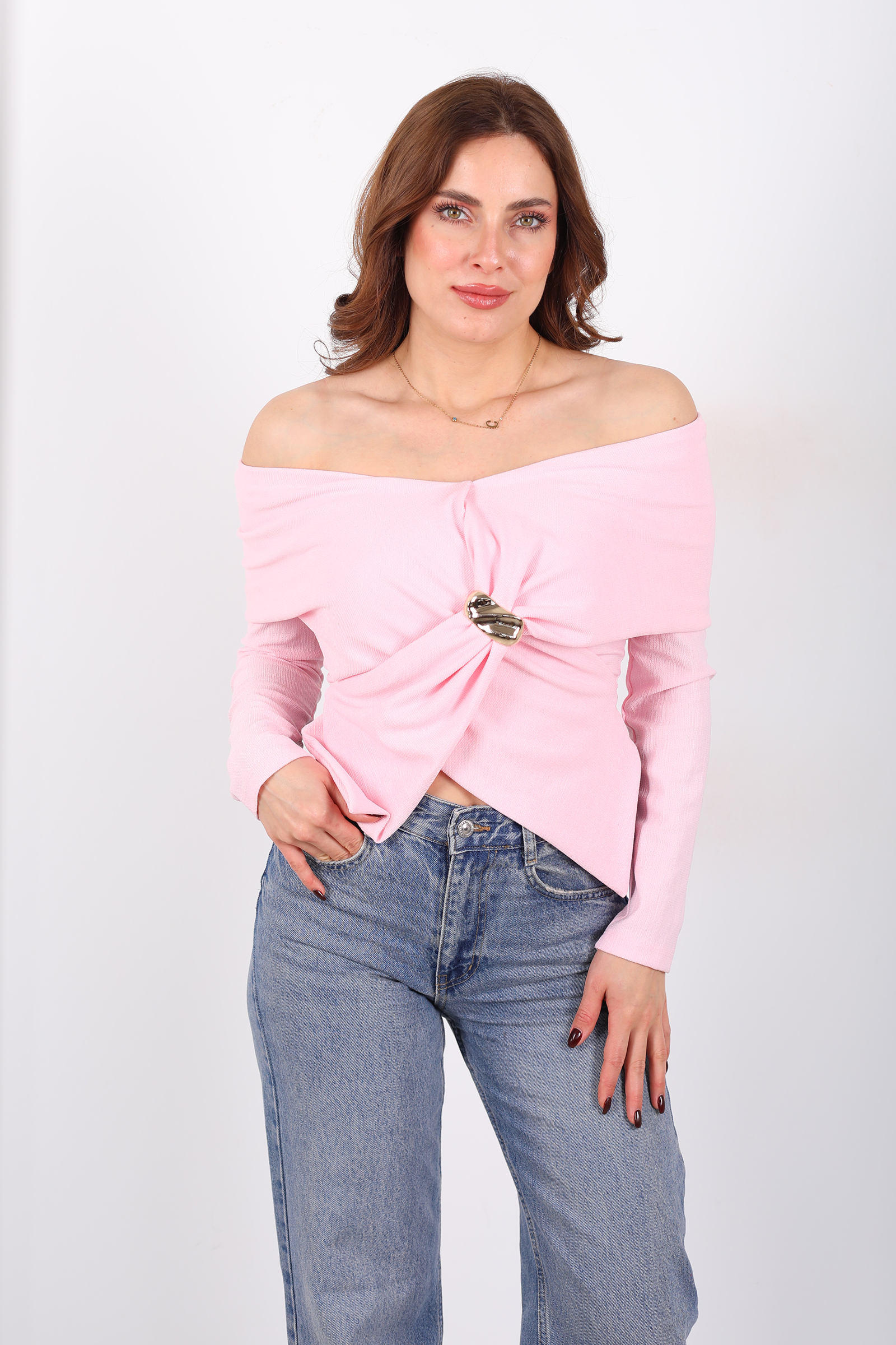 Şal Yaka Broşlu Pembe Kadın Ottoman Bluz