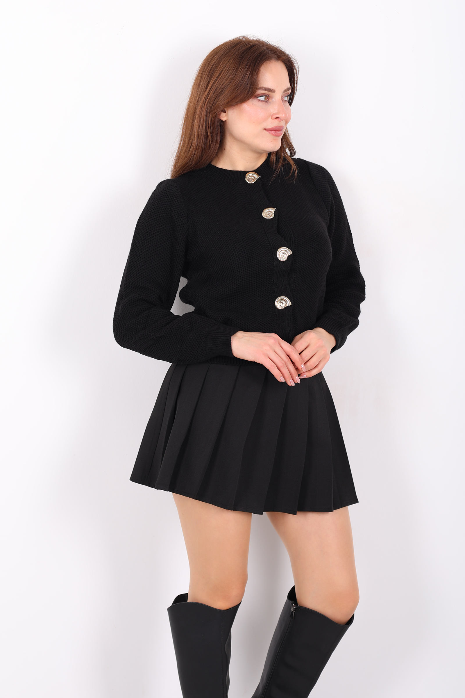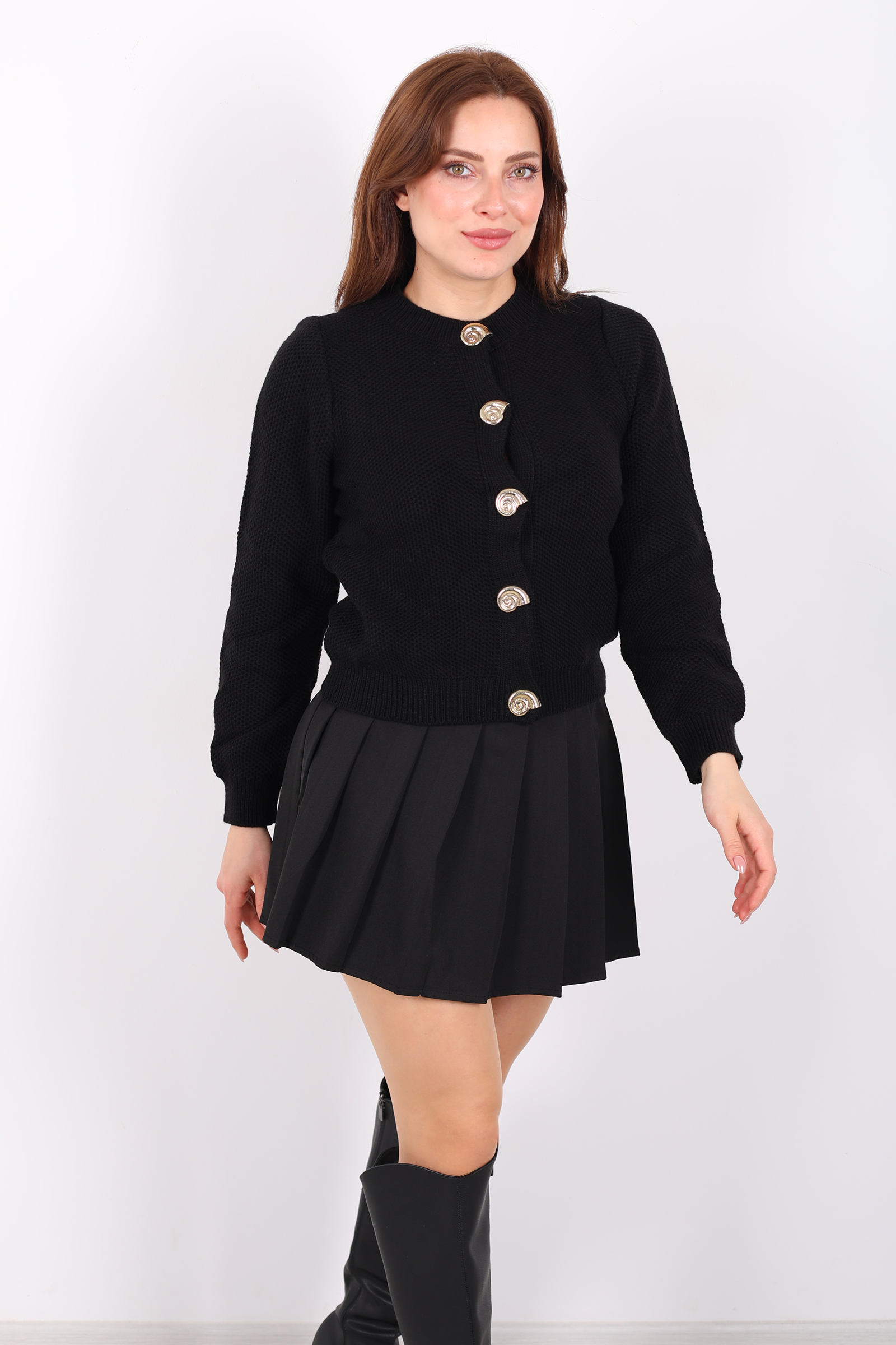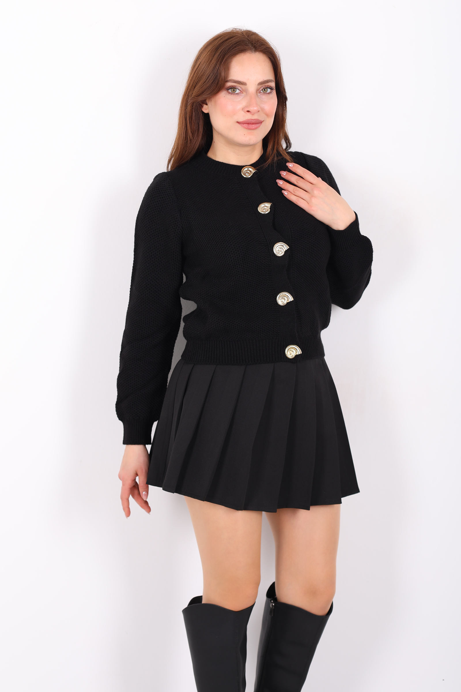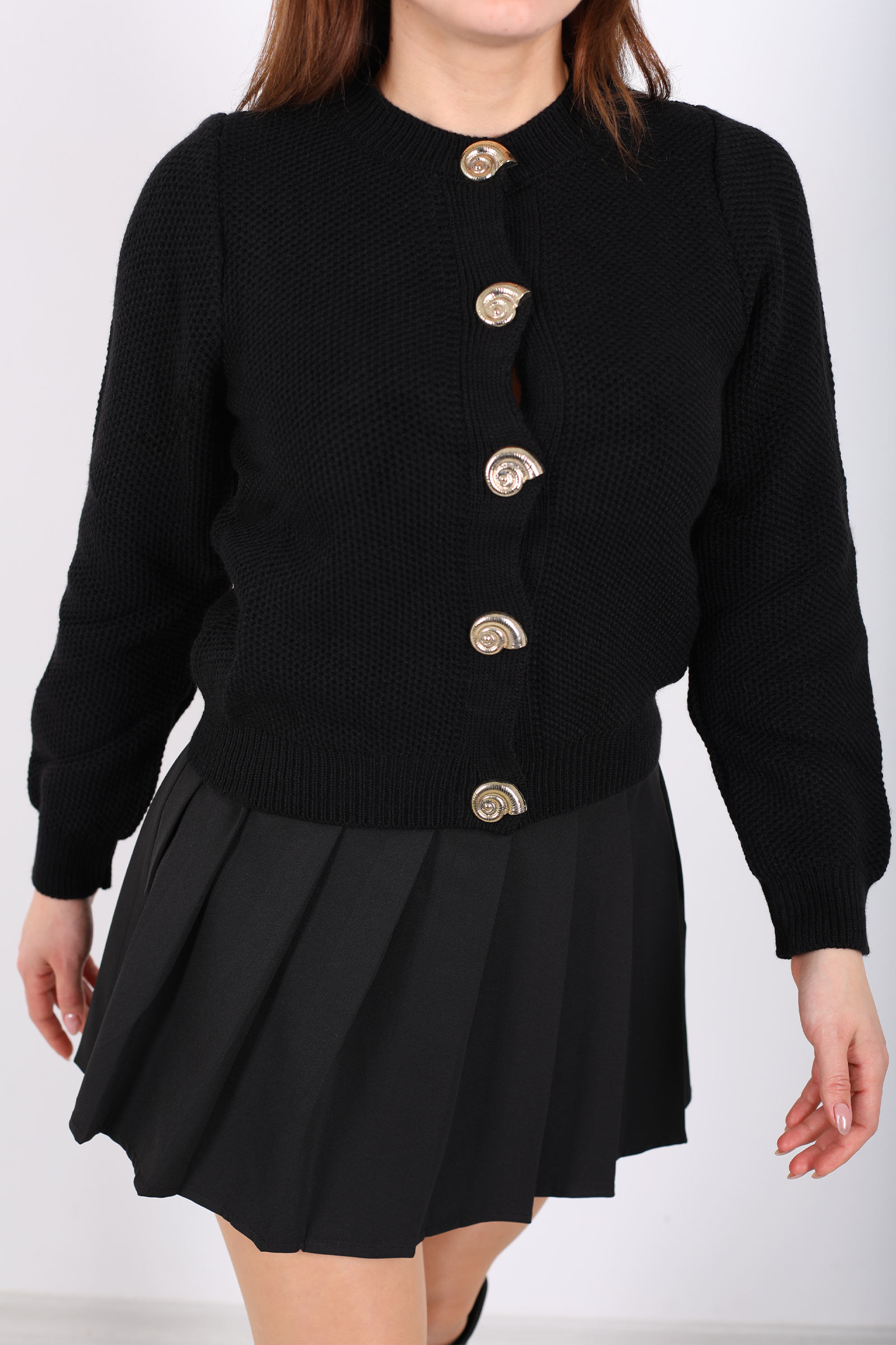 Bu siyah salyangoz aksesuarli triko hırka, dikkat çekici detaylarla sade bir tasarımı birleştiriyor. Zarif aksesuar vurgusu, klasik örgü stiline modern bir hava kazandırır ve hırkayı her türlü alt parçayla denemenizi kolaylaştırır. Düğmeli ön tasarımı sayesinde, ister açık ister kapalı giyilerek farklı stiller yaratabilirsiniz. Siyahın zamansız duruşu, gündelik jean’lerden kumaş pantolonlara kadar pek çok kombine uyum sağlar. Yumuşak örgü yüzeyi gün boyu rahat kullanım sunar ve serin günlerde stilinize ekstra bir katman ekler.
