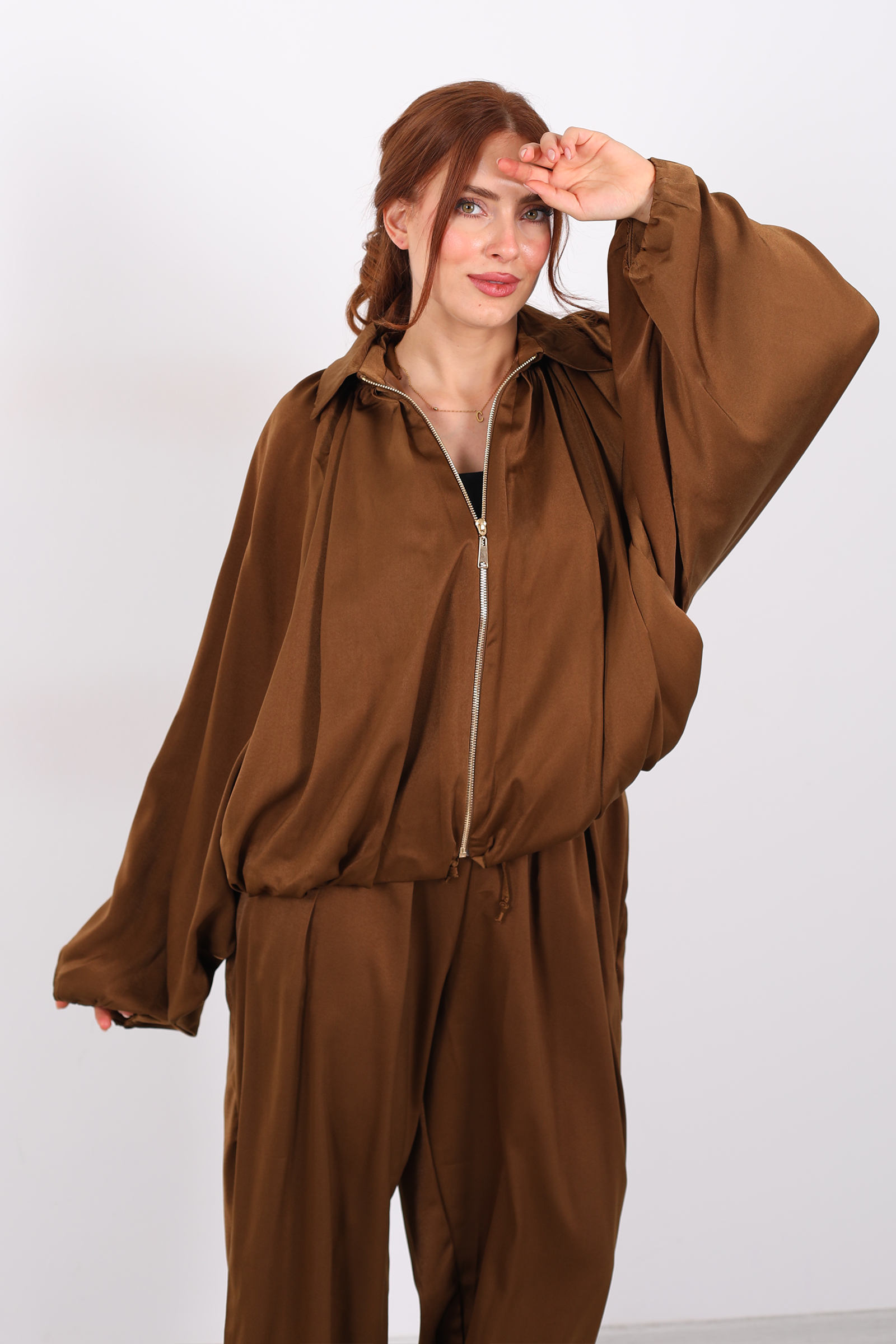 Saten dokusuyla ışıldayan, camel tonundaki bu kadın bomber ceket; hem şık hem sportif bir duruş sunar. Yumuşak ve parlak saten kumaşı, hafif yapısıyla konforlu bir his verir, kısa bomber kesimi ise bel hattını vurgular ve modern bir siluet yaratır. Camel rengi, nötr ama dikkat çekici bir ton olduğu için hem pastel hem güçlü renklerle dengeli şekilde kombinlenebilir.