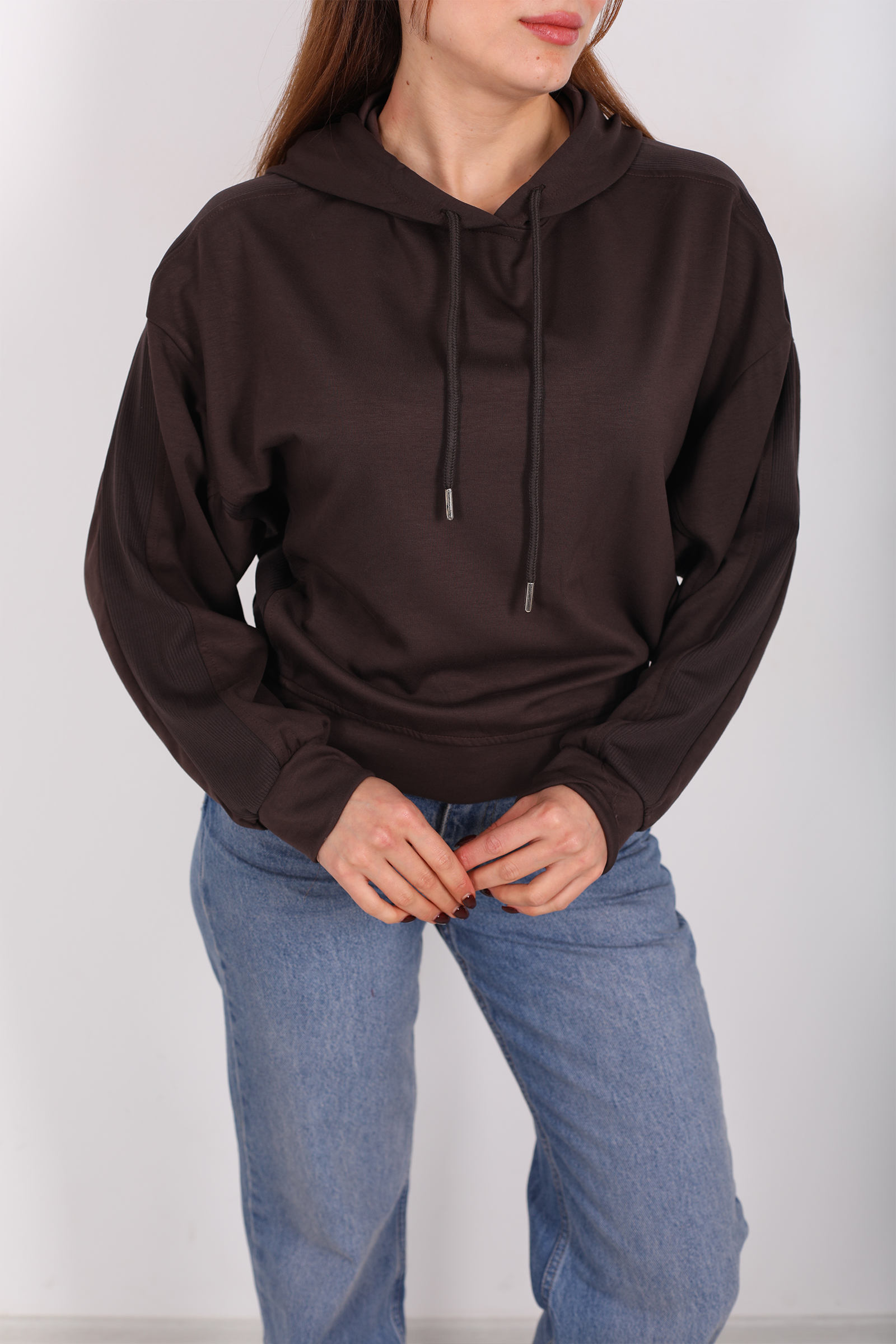 Acı kahvenin sıcak tonlarından ilham alan bu kapüşonlu kadın sweat, sade kalıpları spor detaylarla harmanlayarak günlük kombinlere özel bir dokunuş getirir. Koyu kahve tonundaki gövde, üst kısımda yer alan şerit garnili detaylarla kontrast oluşturarak sade tasarıma hareket katar. Kapüşonlu tasarımı, hem stil hem fonksiyon açısından soğuk günlerde ekstra koruma sağlar.