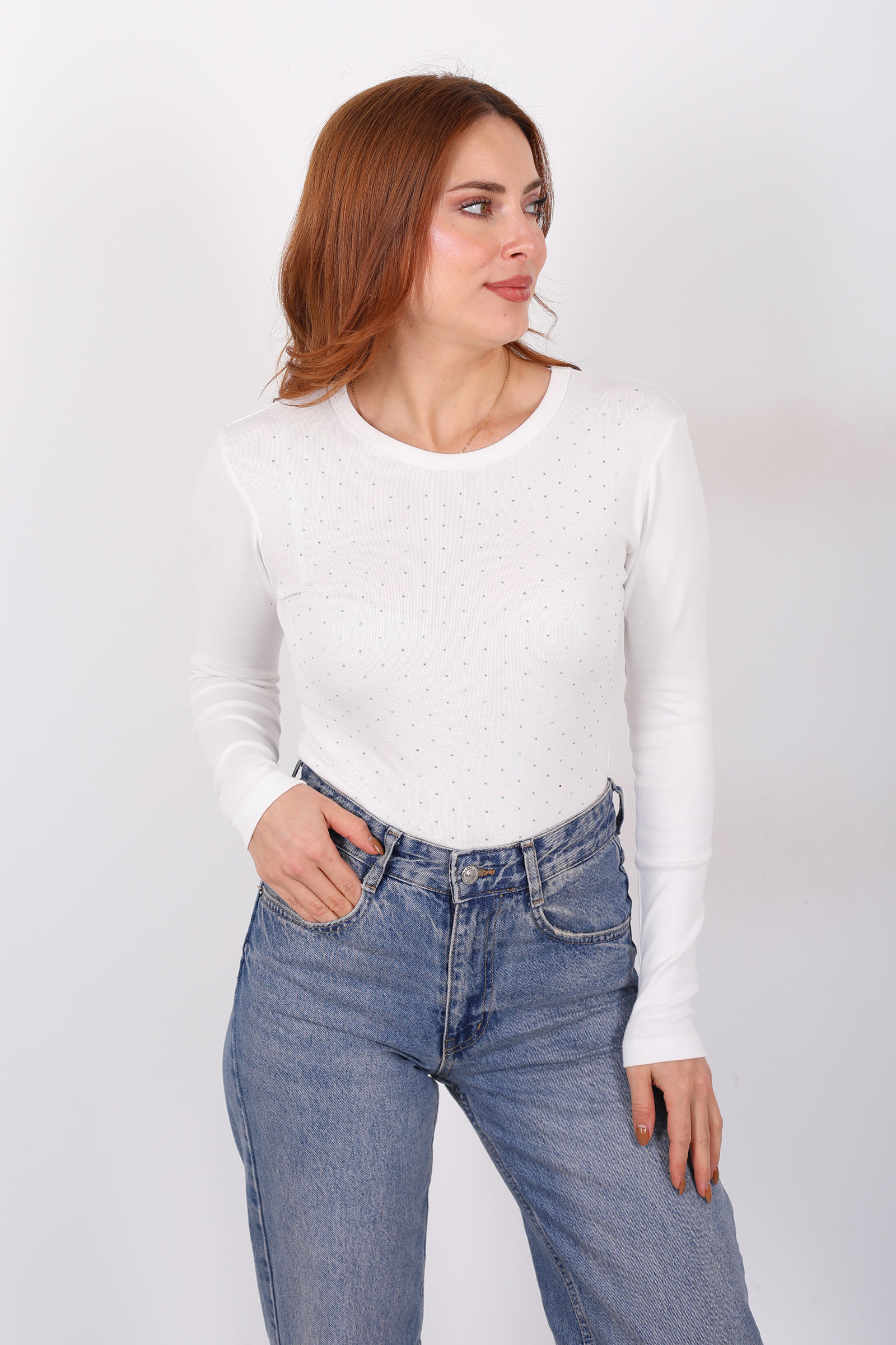 Serpme Taş Detaylı Beyaz Kadın Basic Bluz