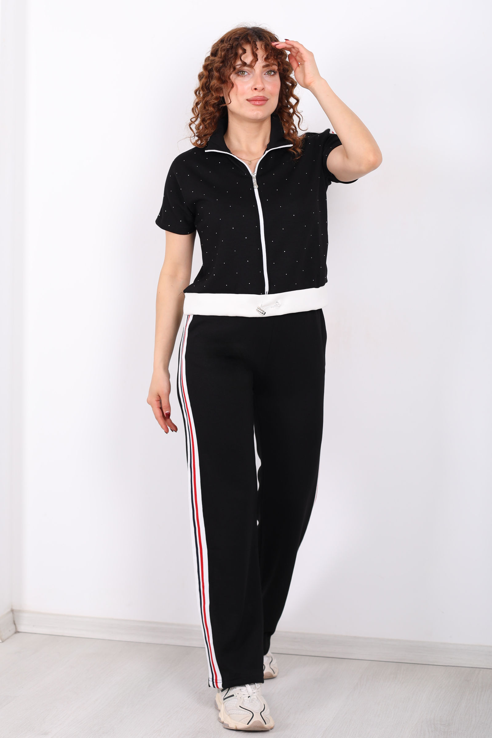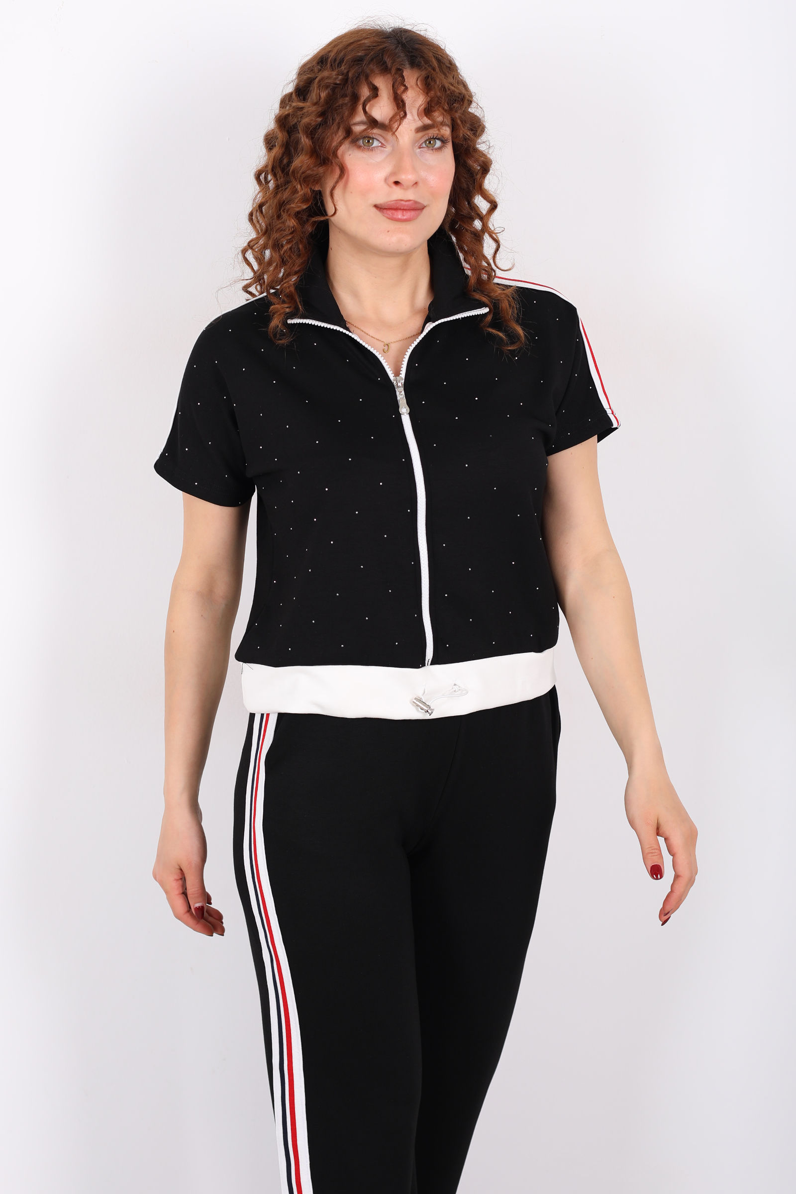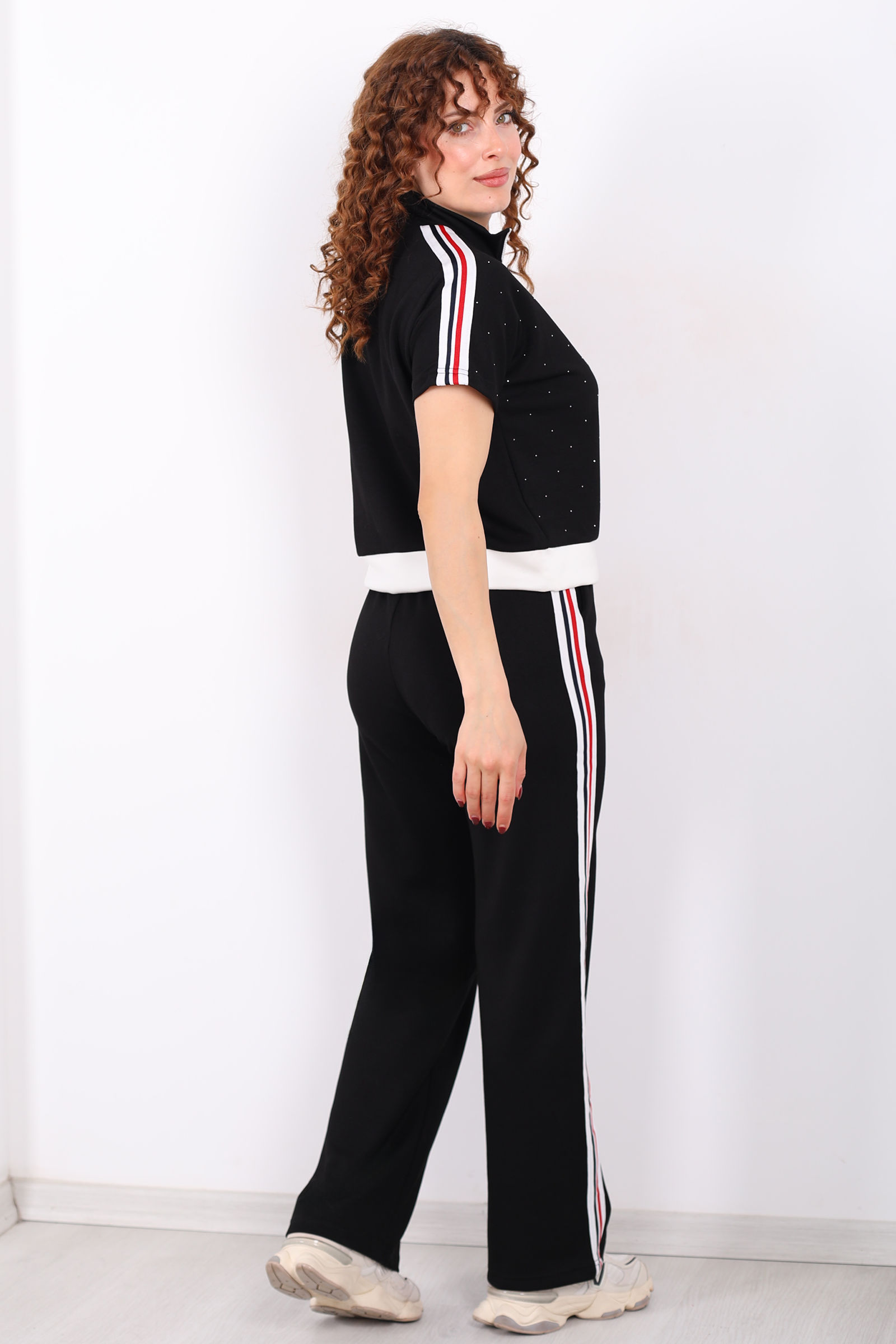 Serpme Taşlı Şerit Garnili Stoperli Siyah Kadın Takım